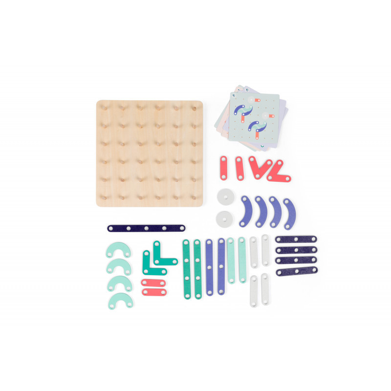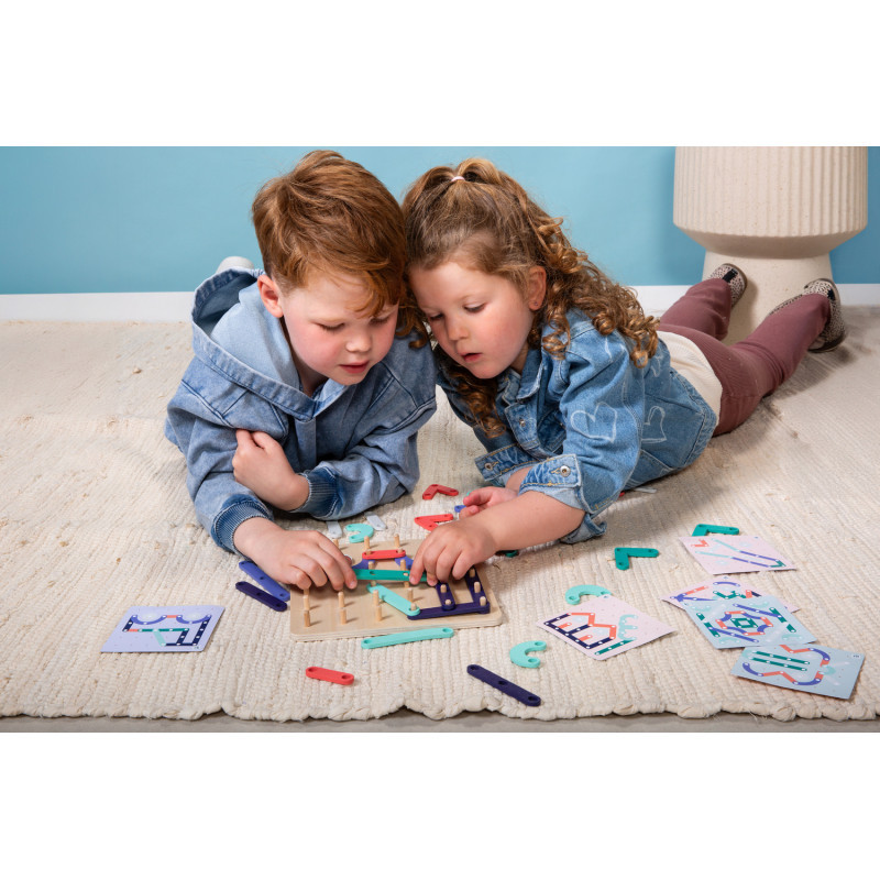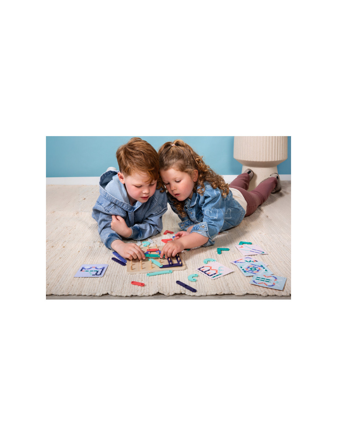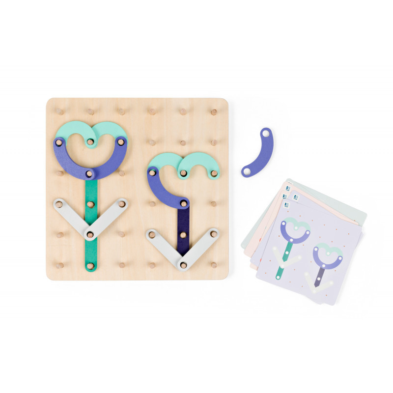 Creeaza modele colorate, forme interesante sau lasa-ti imaginatia libera pentru a realiza propriile capodopere!Un joc educativ din lemn care ii ajuta pe copii sa-si dezvolte gandirea logica, memoria si creativitatea prin joaca.Continutul setului:1 baza din lemn (21×21 cm)6 carduri cu 12 modele (10×10 cm)33 de piese din lemn colorateCe dezvolta acest joc:• antrenarea memoriei de lucru• stimularea creativitatii• recunoasterea vizuala si atentia la detalii