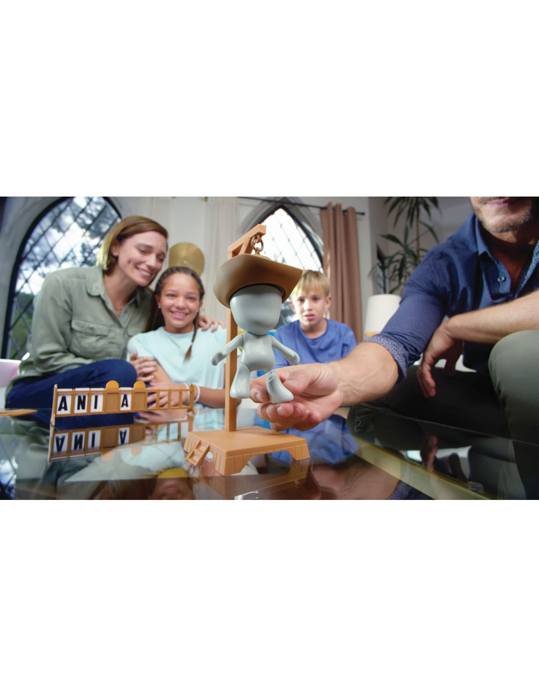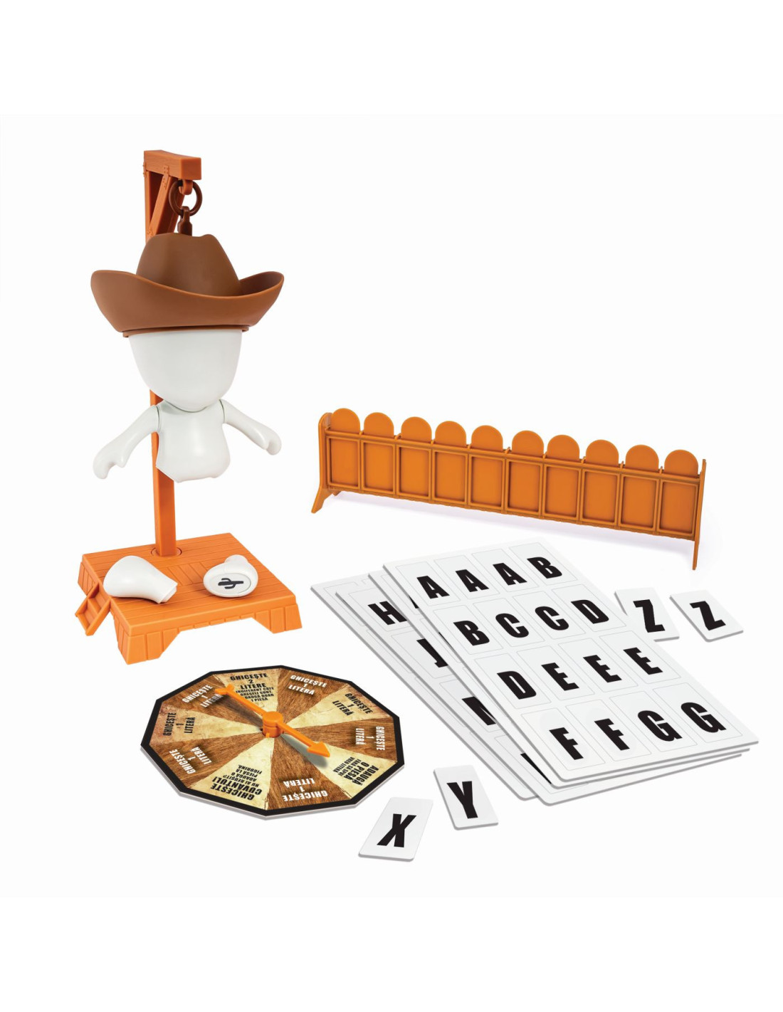 Jocul contine1 spanzuratoare (din 2 piese), 1 palarie, 1 cap, 1 corp, 2 maini, 2 picioare, carduri cu litere, 1 suport pentru litere cu usite glisante, 1 roata de invartit Recomandat copiilor cu varsta de peste 6 ani.
