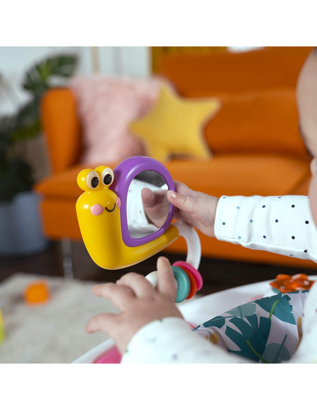 Broscuta vesela scoate sunete magice, iar ceilalti prieteni colorati completeaza distractia: libelula simptica, pestele rotativ, oglinda pentru descoperire, melcul dansator si copacelul miscator.