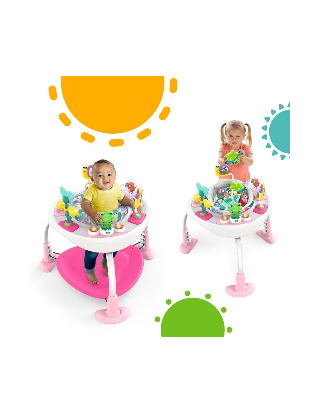 In modul jumper, suportul pentru picioare se poate regla in 3 pozitii, in functie de inaltimea copilului. Sezutul se roteste la 360° pentru ca micutul sa aiba acces rapid la toate jucariile.