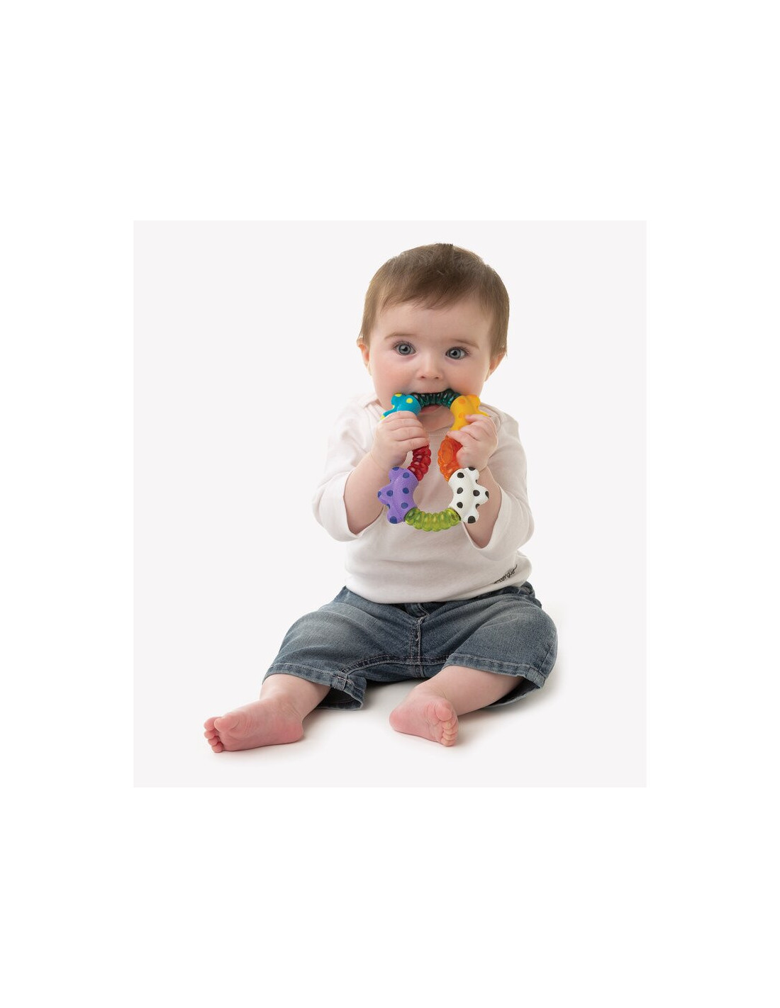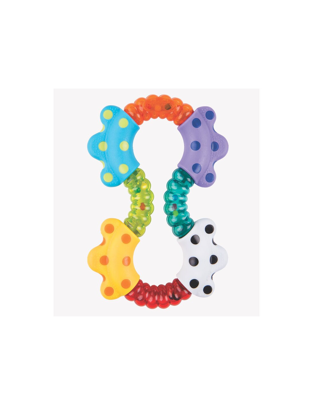 - Pe masura ce jucaria este rasucita, pot fi auzite sunete de clic-clac, in timp ce margelele colorate care zdranganesc scot un zgomot cand sunt scuturate, ideal pentru stimularea auditiva.