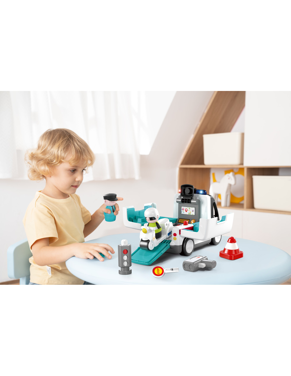 Include o masinuta de politie, un politist jucarie, o motocicleta si semne de circulatie.