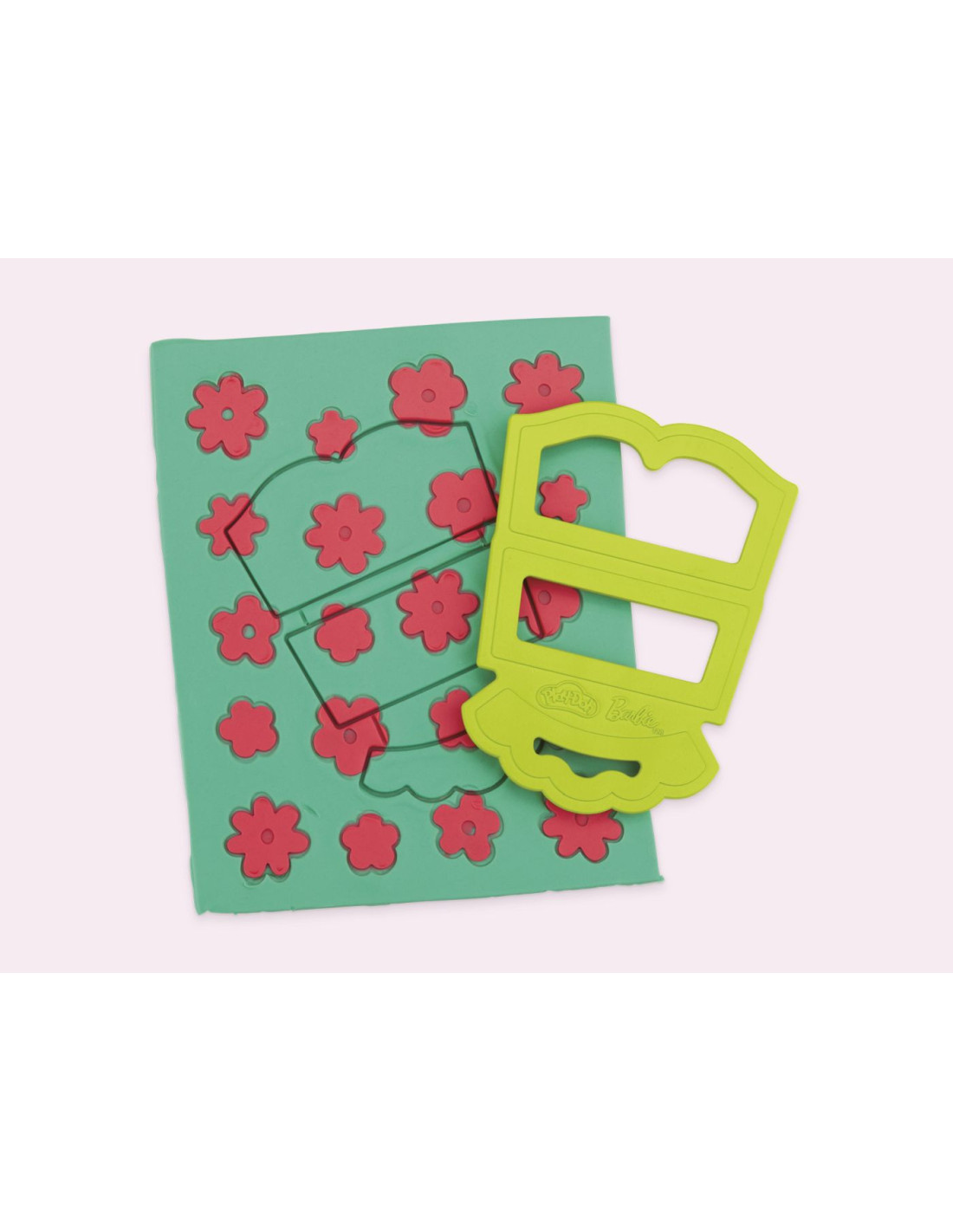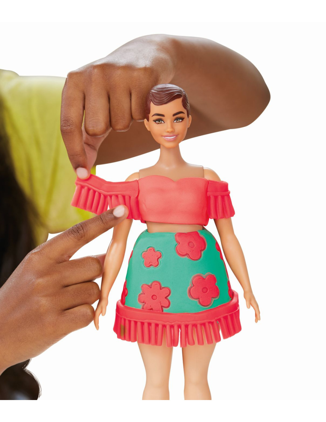 Pur si simplu aseaza papusa pe suport, foloseste foaia cu modele Play-Doh si decupatoarele pentru a croi tinute Barbie si imbrac-o in cele mai creative moduri imaginabile.