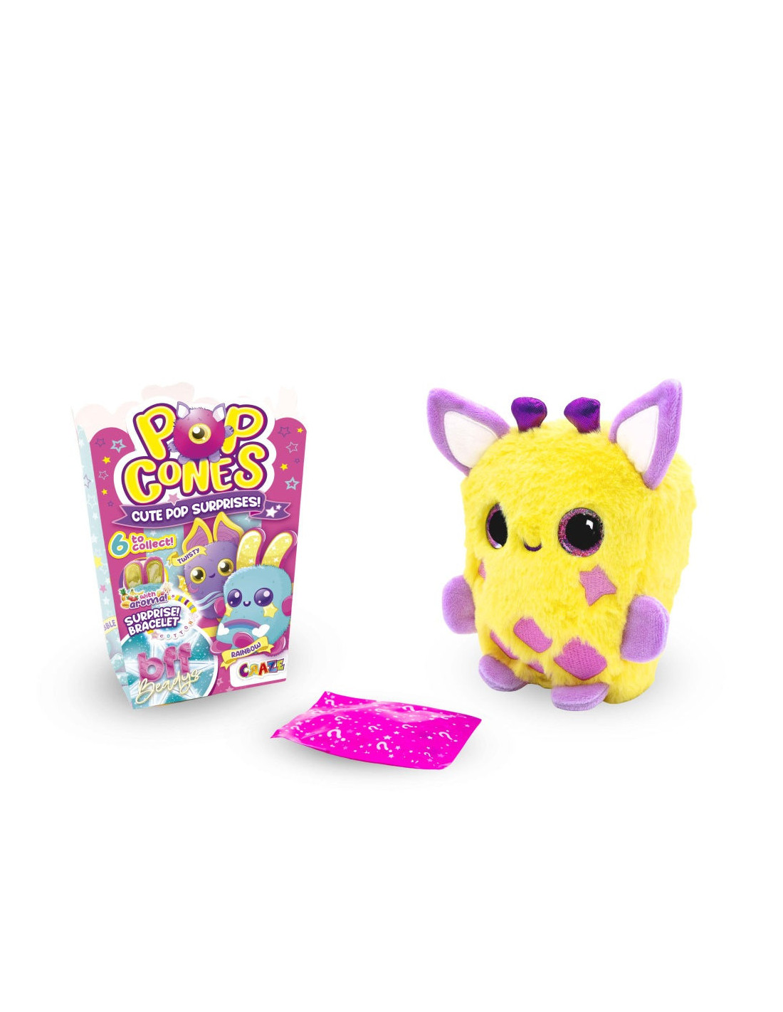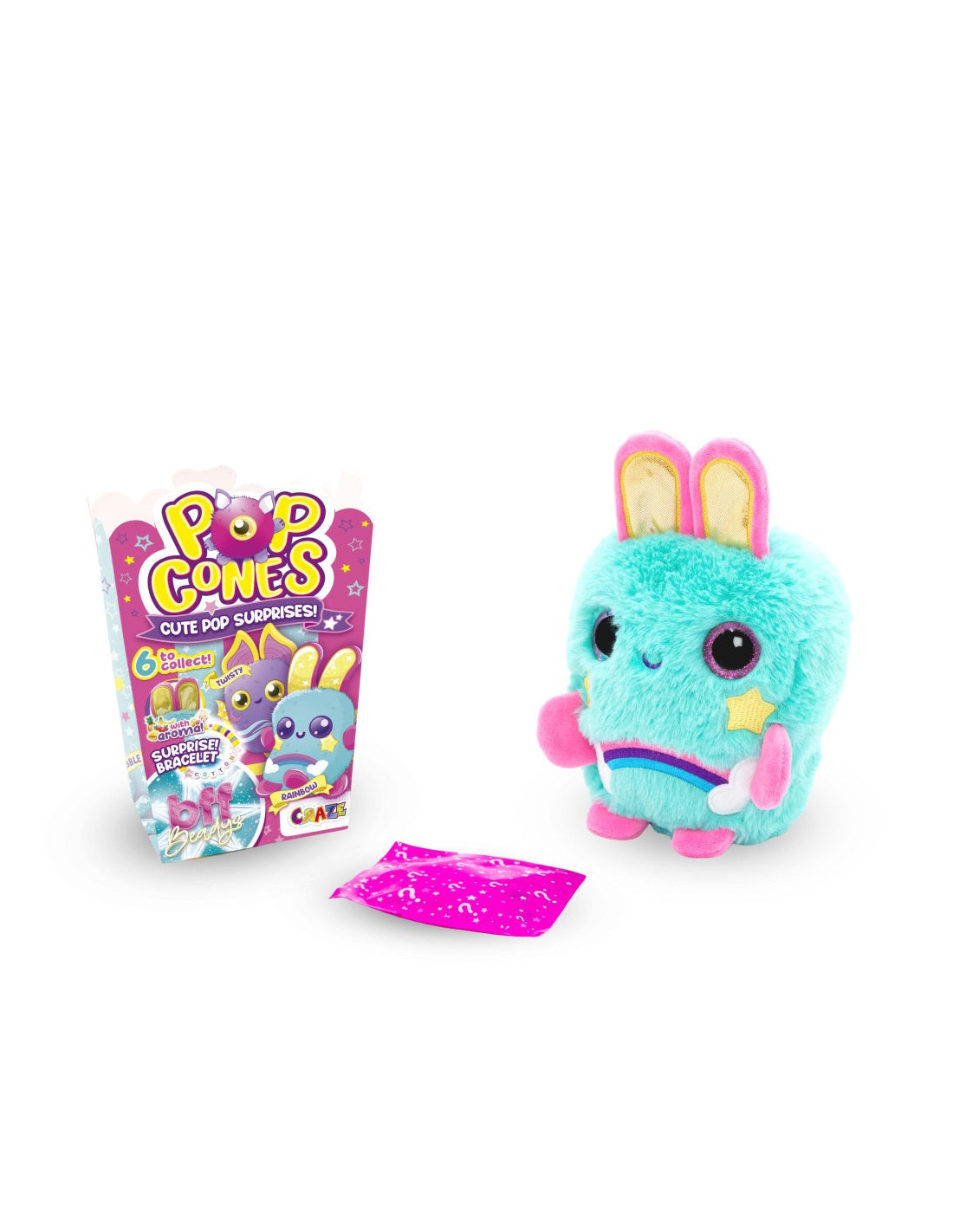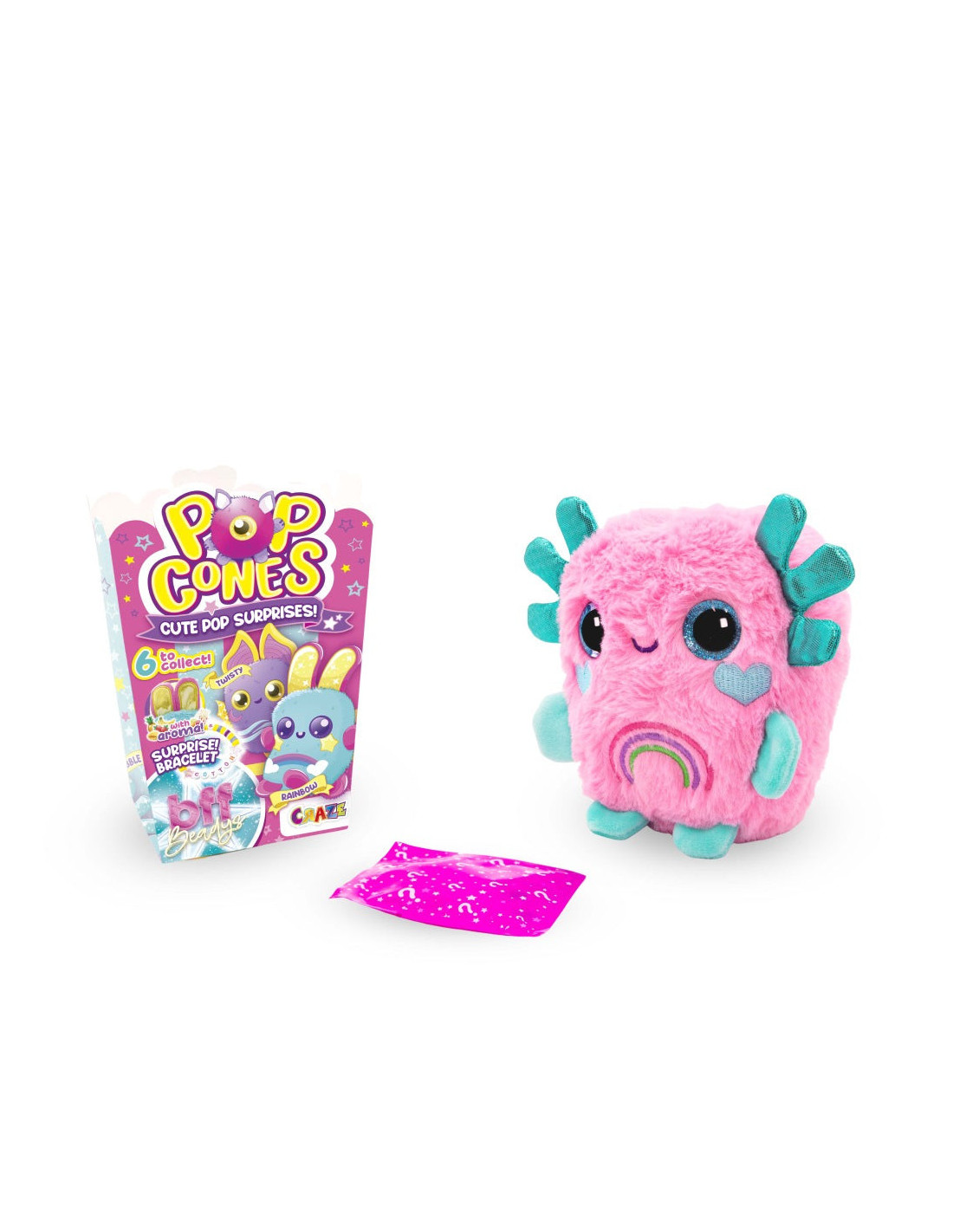 Fiecare jucarie Pop Cone este ambalata intr-o cutie distractiva de popcorn si include o surpriza incantatoare: o bratara exclusiva inspirata de jucaria ta de plus!.
