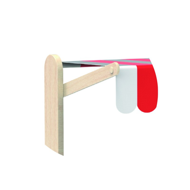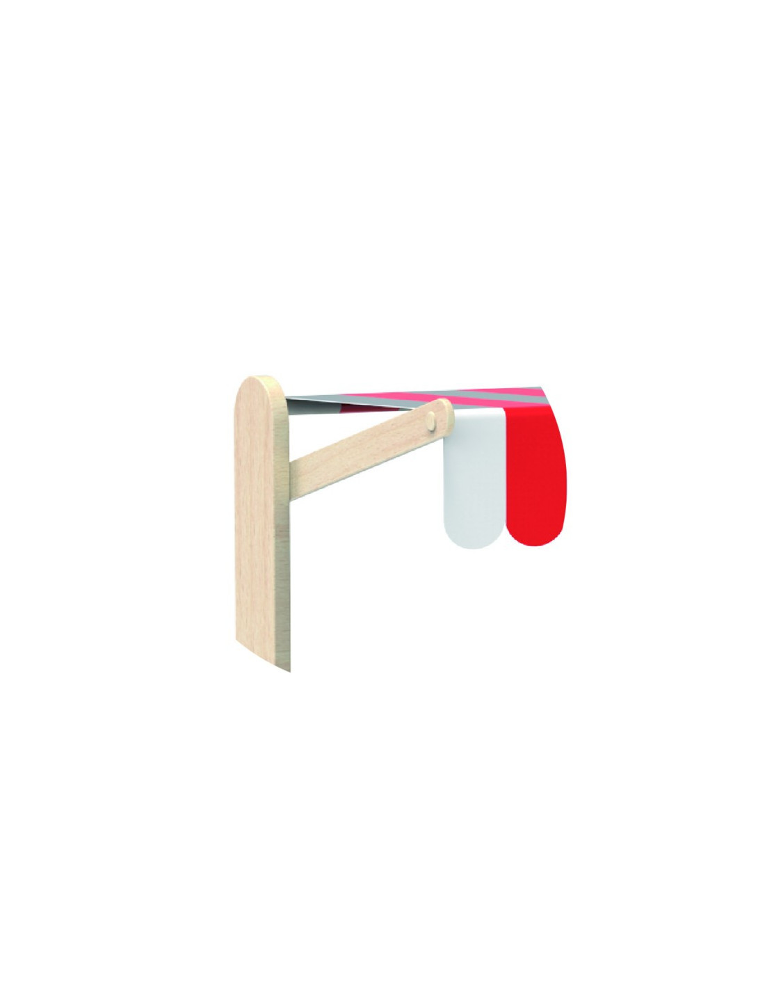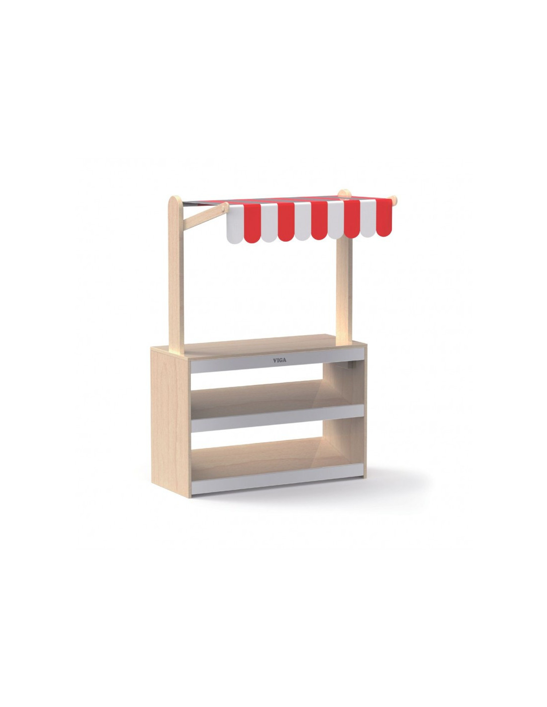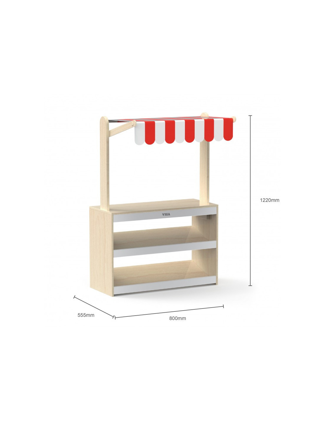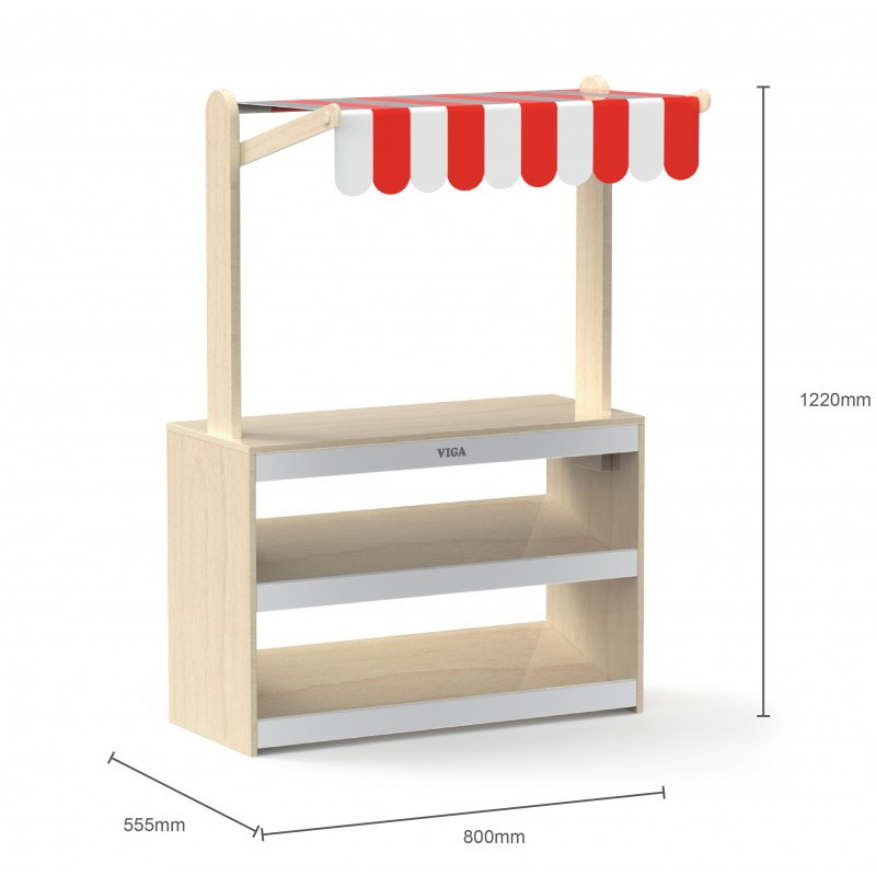 Un magazin de jucarie, ideal pentru jocurile de rol. Standul are rafturi pe care pot fi expuse produsele si o copertina atat pentru a proteja vanzatorul cat si pentru un design deosebit. Standul are o structura solida si este confectionat din lemn de cauciuc. Separat se pot achizitiona casa de marcat, seturi de fructe, legume, produse de bacanie, bauturi, prajituri, bomboane, toate din lemn.