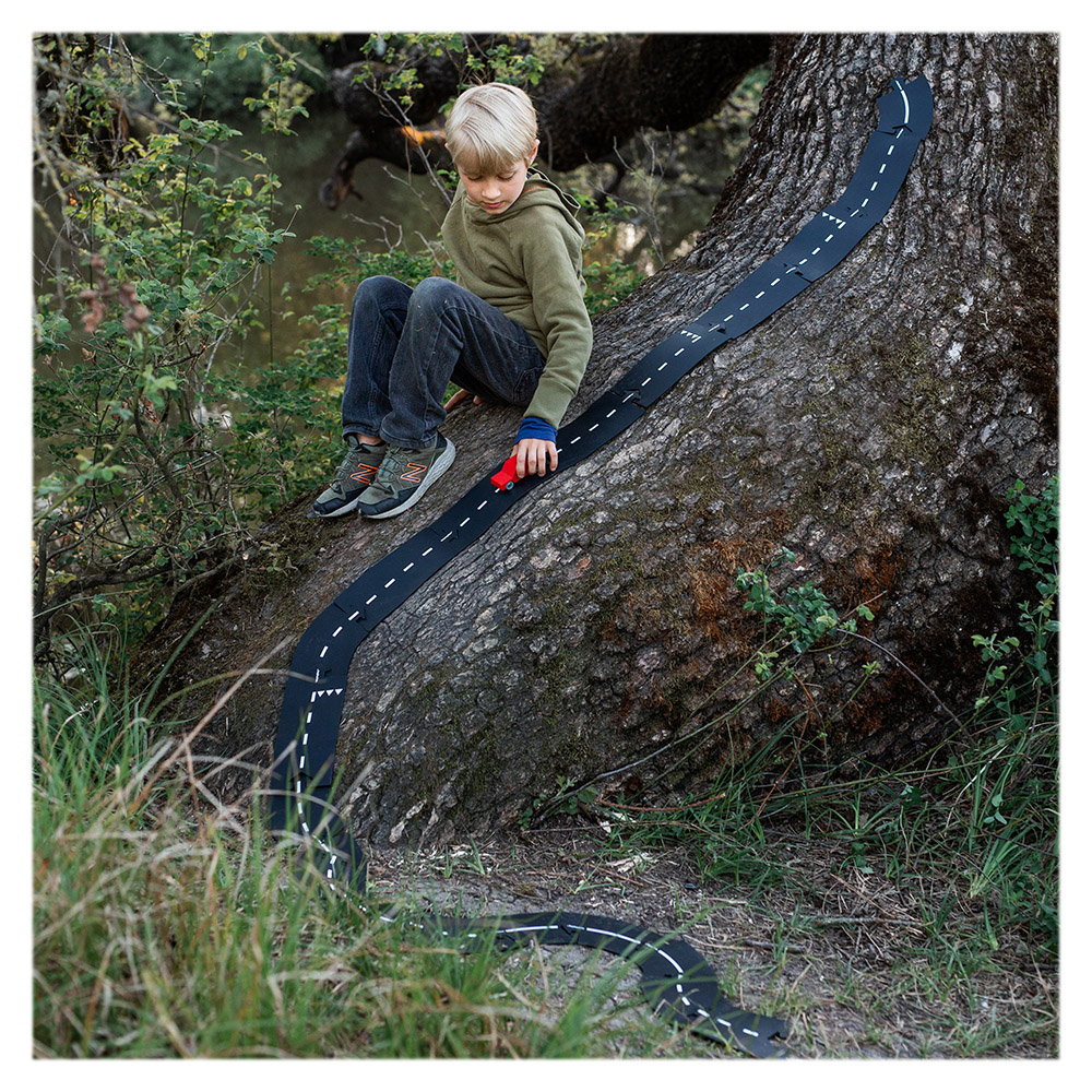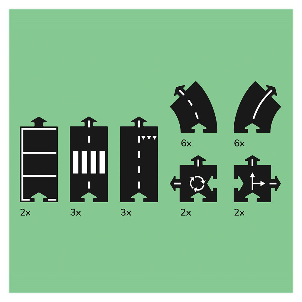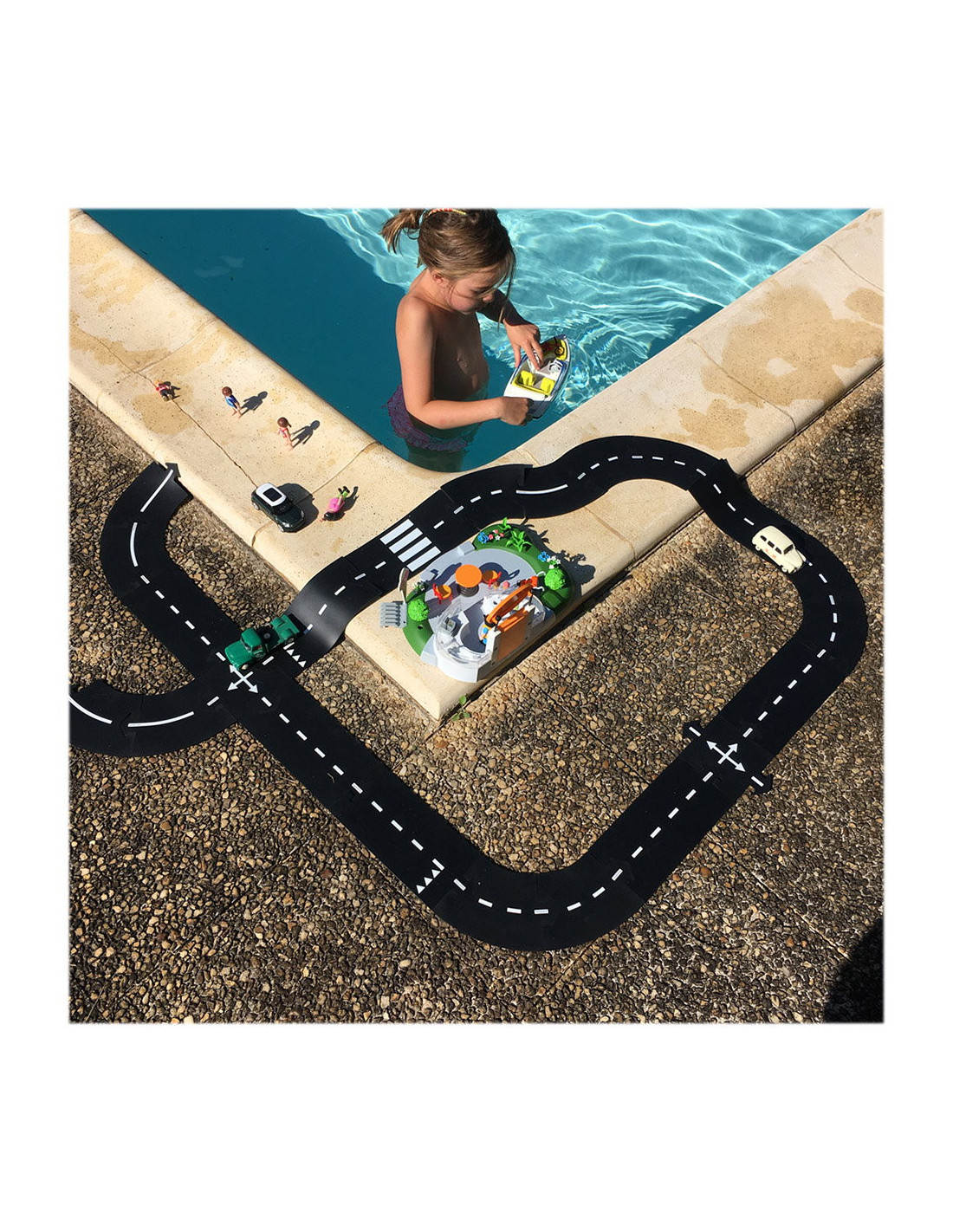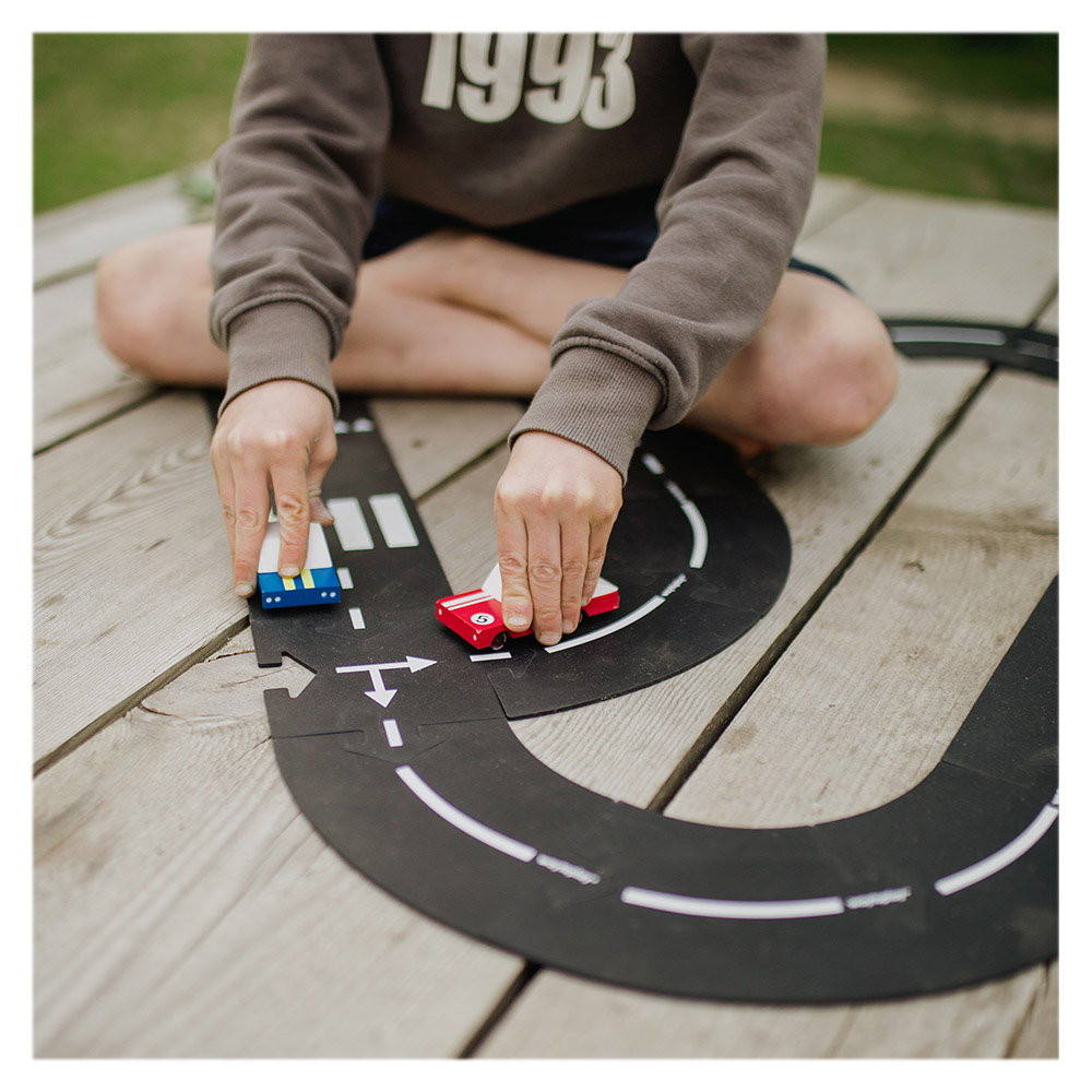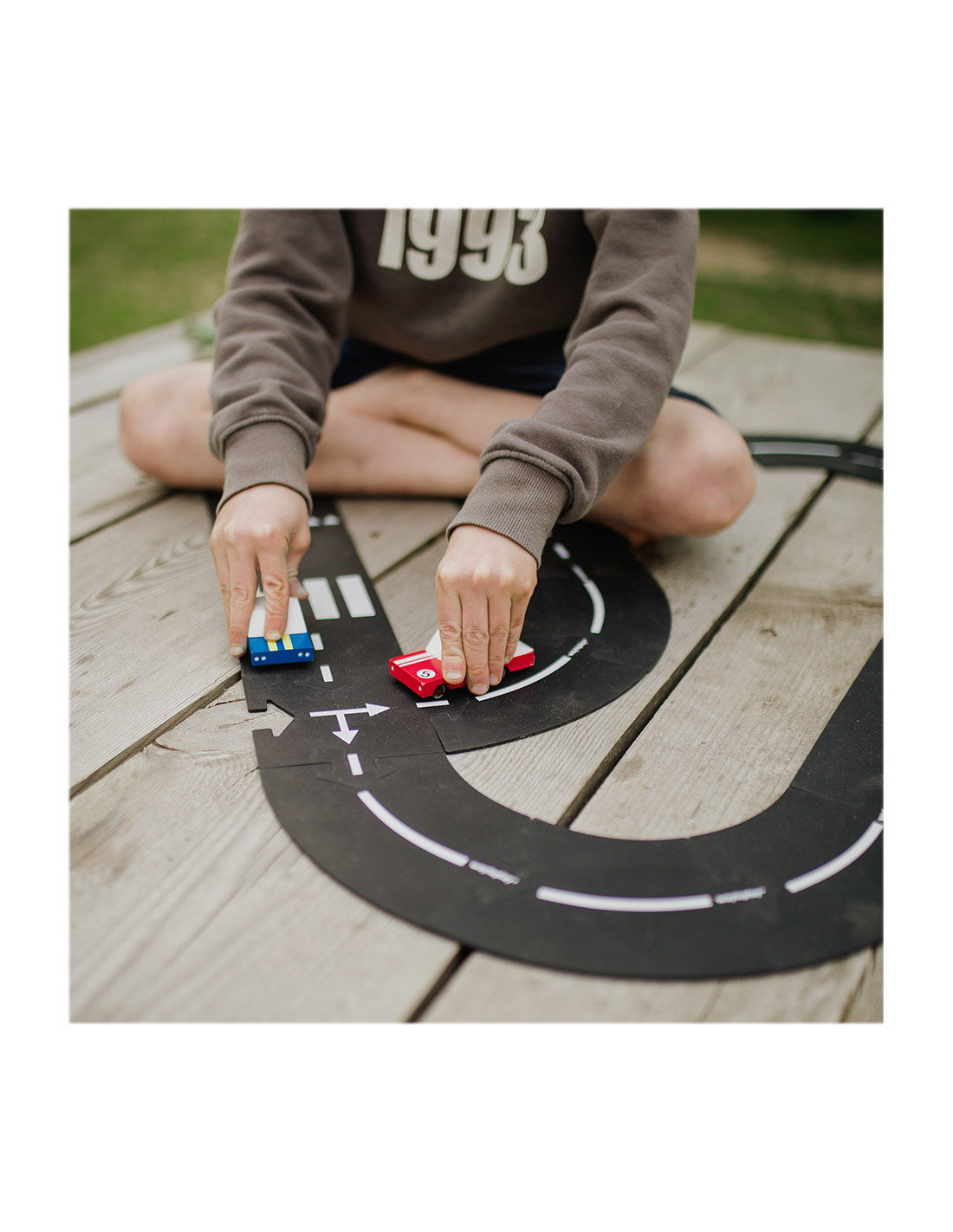 - Fiecare set dispune de segmente de drum flexibile, usor de conectat. Drepte, curbe, locuri de parcare, sensuri giratorii, intersectii si multe alte piese, pot fi combinate si conectate dupa imaginatia copiilor, pentru a crea o multime de variante de trasee.