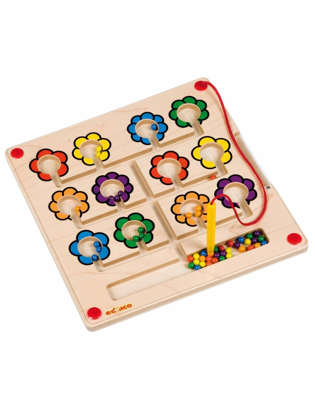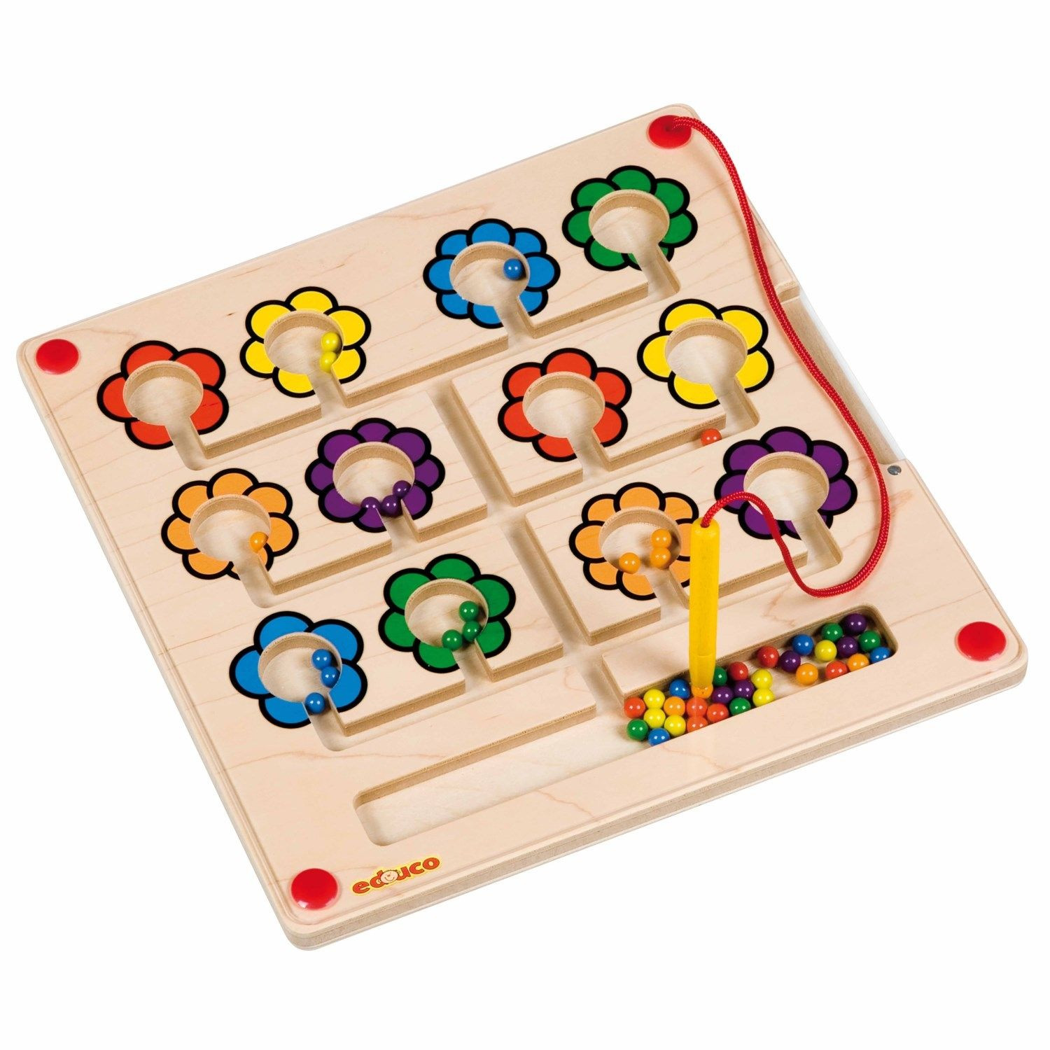 Cu creionul magnetic muta bilele colorate spre flori. Aranjeaza bilele si floarea de aceeasi culoare sau, pentru dezvoltarea numarii, atatea bile ca si numarul de petale a unei flori. Stimuleaza abilitatile motorii fine, constientizarea spatiala si capacitatea de concentrare. Contine: tabla magnetica din lemn de 29,5 x 29,5 cm, 6 carduri cu exercitii, 1 creion magnetic. Varsta minima 3 ani.