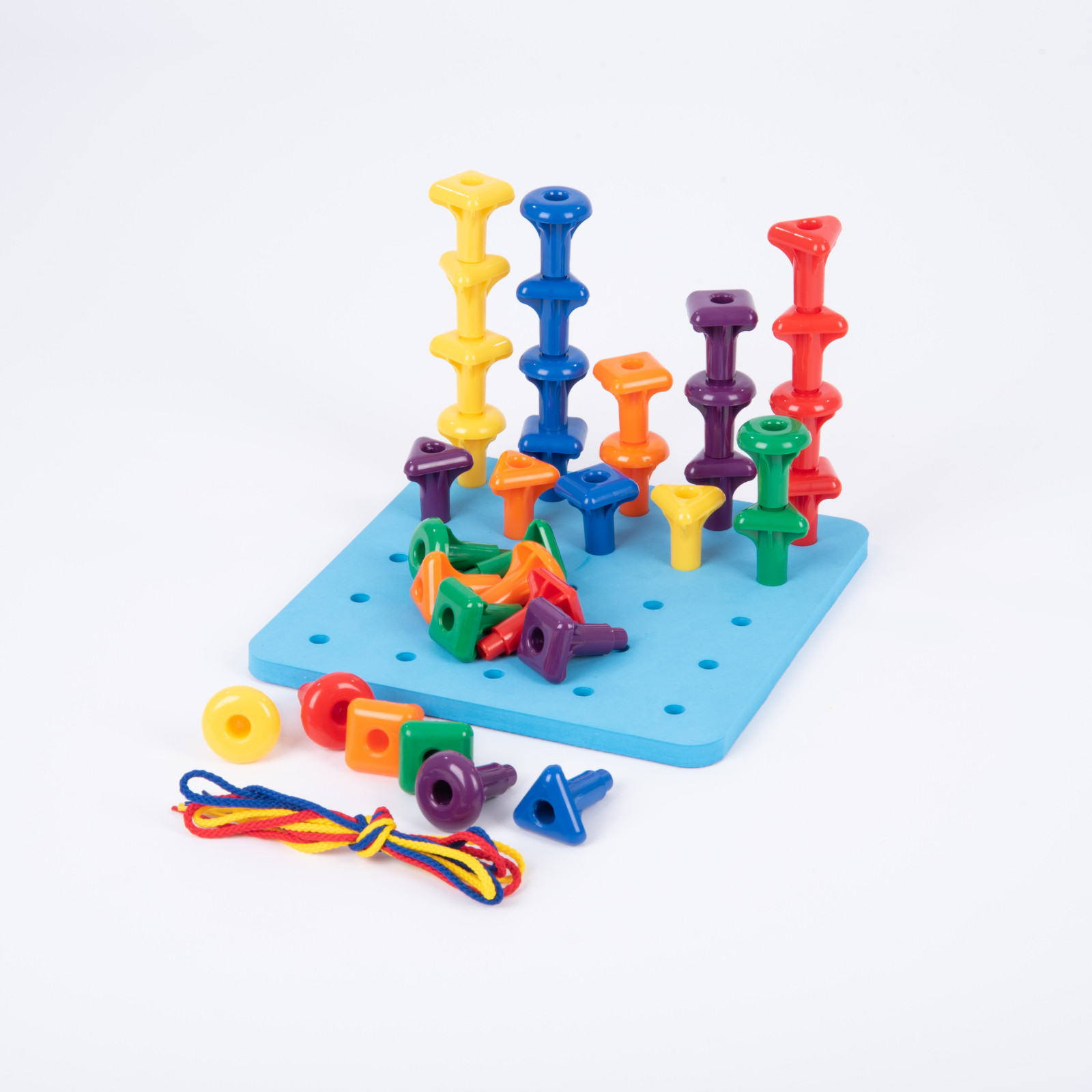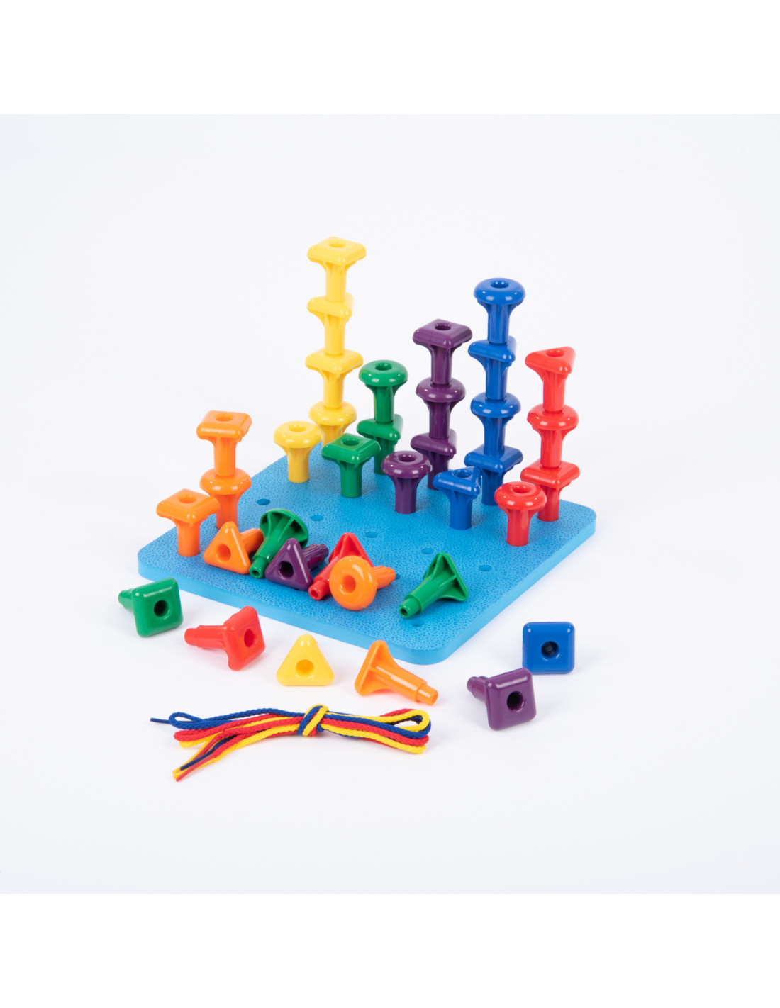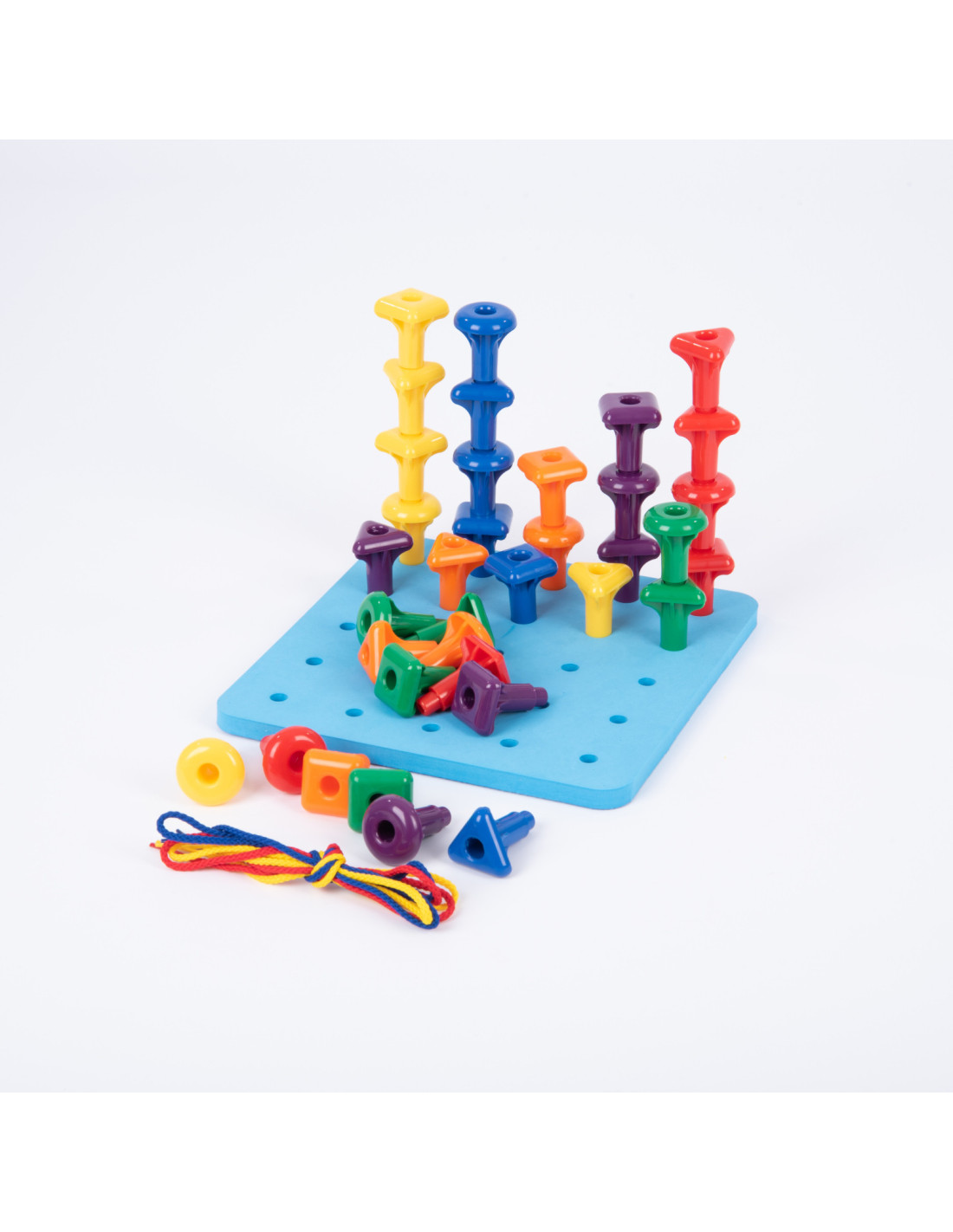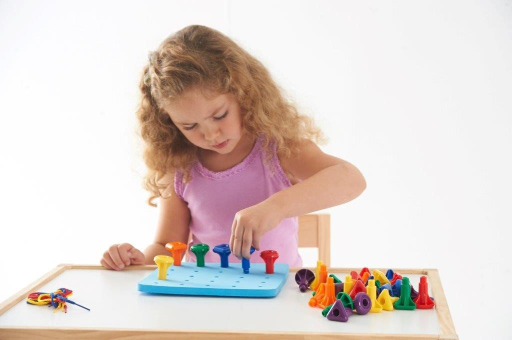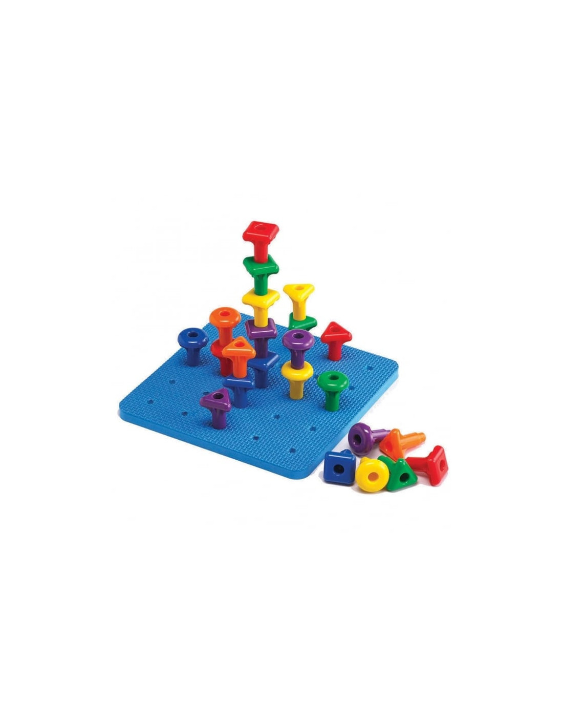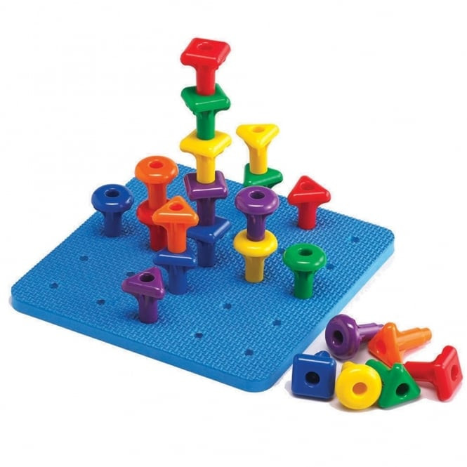 Set de 36 Cuie Gigant cu planseta de lucru Geo Pegs , Joaca educativa si creativa Invatare prin constructie si imaginatie Geo Pegs ii atrage pe copii prin activitati de impingere, tragere si stivuire a pieselor colorate. Panoul dreptunghiular cu gauri le ofera posibilitatea de a crea modele variate, combinand matematica cu arta. Activitati STEAM interactive Setul este ideal pentru activitati STEAM (stiinta, Tehnologie, Inginerie, Arta si Matematica), stimuland imaginatia, gandirea logica si creativitatea. Copiii descopera concepte matematice prin constructii practice si design jucaus. Dezvoltare prin joc educativ Cuiele gigant pot fi folosite pentru sortare, clasificare, numarare, modelare si secventiere. Cartonasele de activitate fata-verso ii incurajeaza pe copii sa rezolve probleme, sa exerseze rationamentul si sa dezvolte abilitati de gandire creativa. Continutul setului 36 cuie gigant in 6 culori si 3 forme 1 baza patrata cu gauri (21 Ãmdash; 21 cm) 3 snururi pentru activitati de legare si design Beneficii educative Setul sprijina mai multe arii de dezvoltare: Dezvoltare fizica: abilitati motrice fine si coordonare Matematica: sortare, numarare si modele Creativitate: design, rezolvare de probleme si gandire vizuala