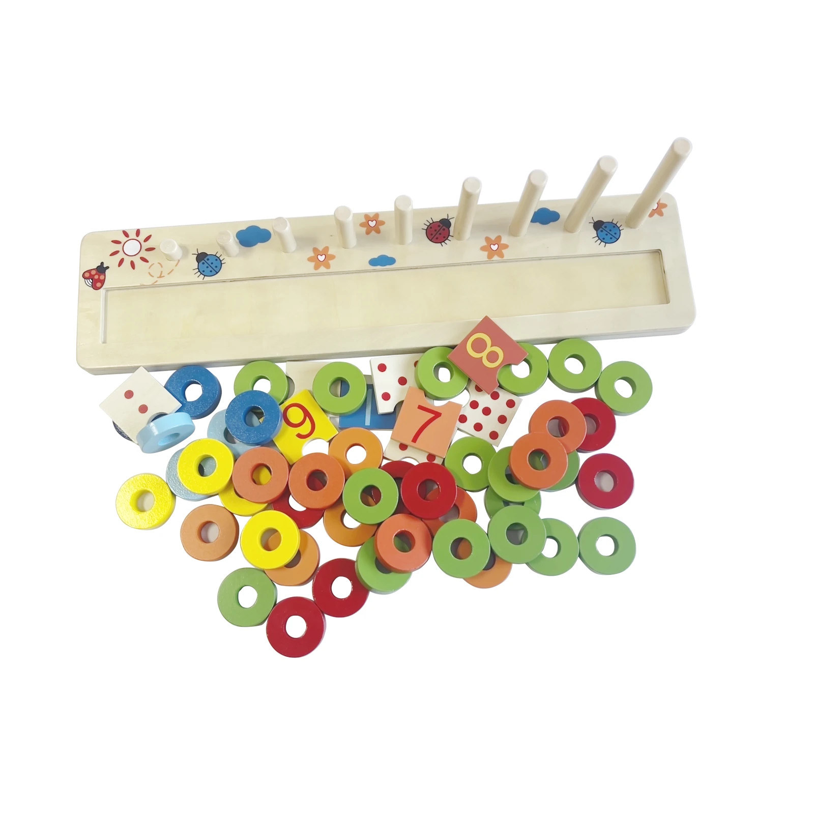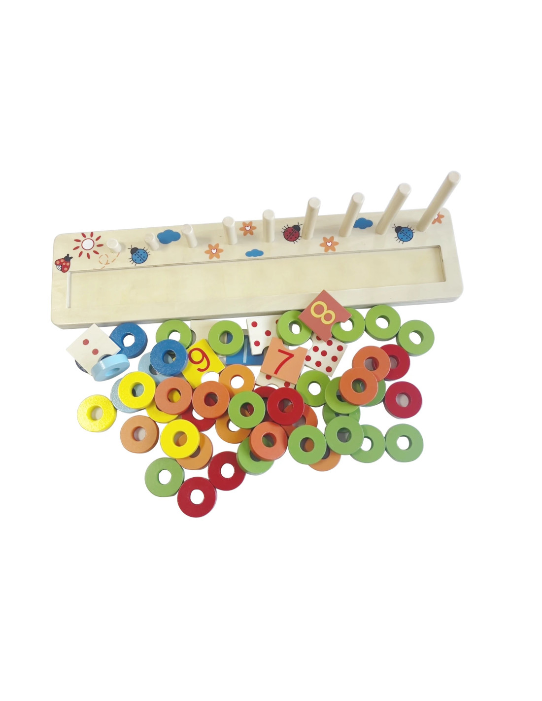 O idee excelenta pentru o abordare distractiva a primelor sarcini de calcul. Numarul corect de inele din lemn trebuie sa fie stivuit pe tijele din lemn de diferite inaltimi. Numarul corect este afisat si in tabelul de rezultate de pe baza din lemn. Contine: o baza 10 placute cu numere 35 inele: 1 albastru inchis 2 albastru 3 albastru inchis 4 galben 5 portocaliu 6 portocaliu inchis 7 rosu 8 verde deschis 9 verde inchis Dimensiuni: 40 x 10 x 10 cm. Varsta recomandata: peste 4 ani.