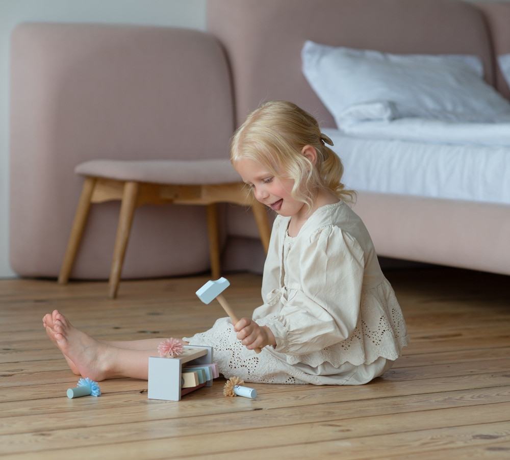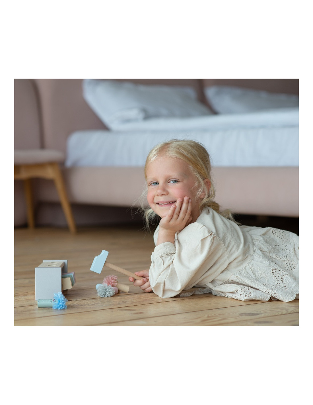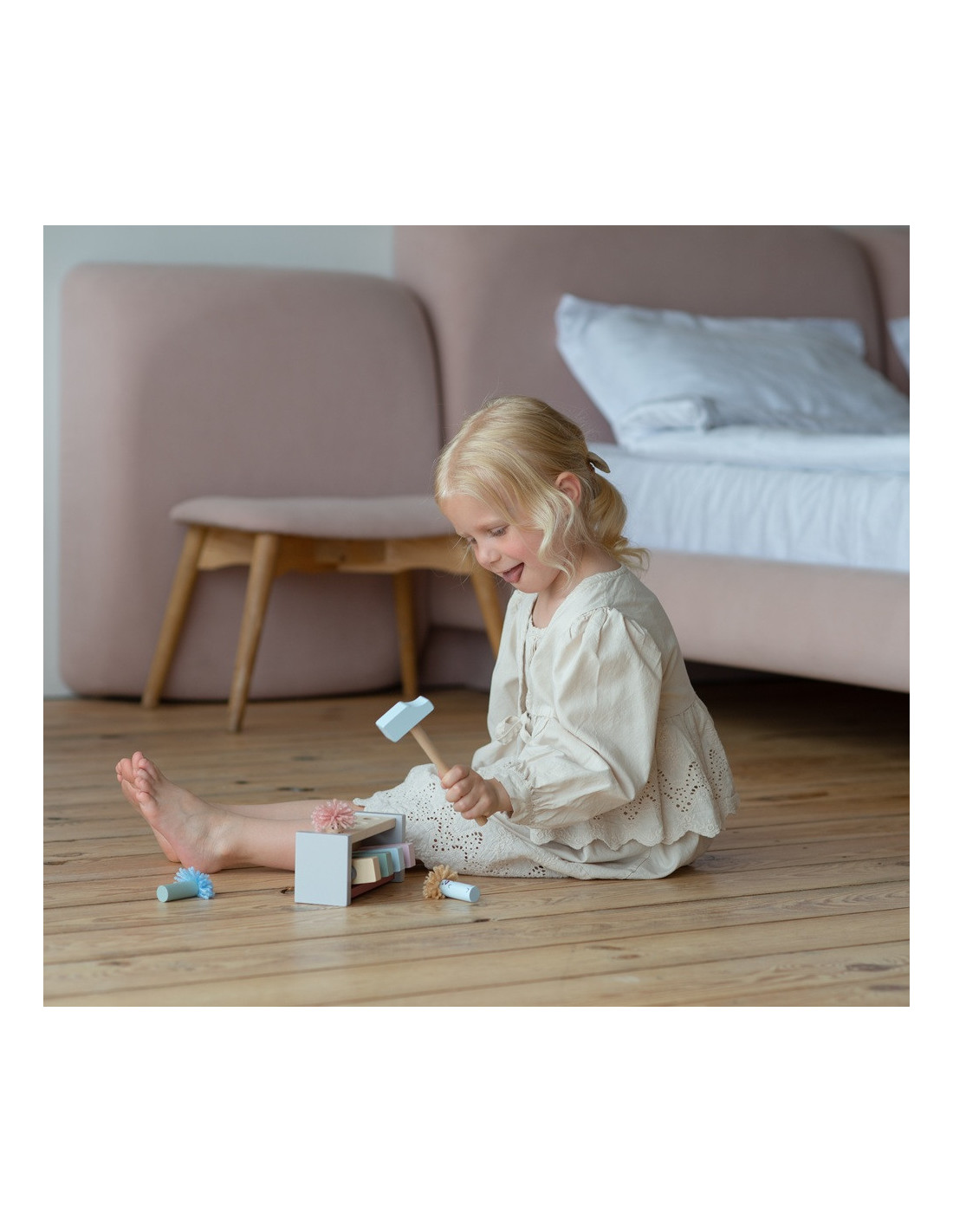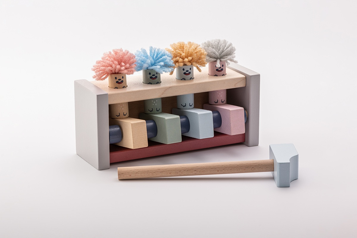 Numar piese: 1 ciocan, 1 baza cu 4 piese si 4 clauni frumos colorati, cu par textil