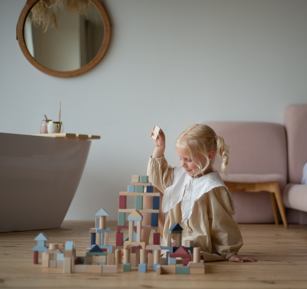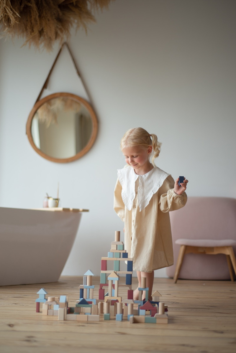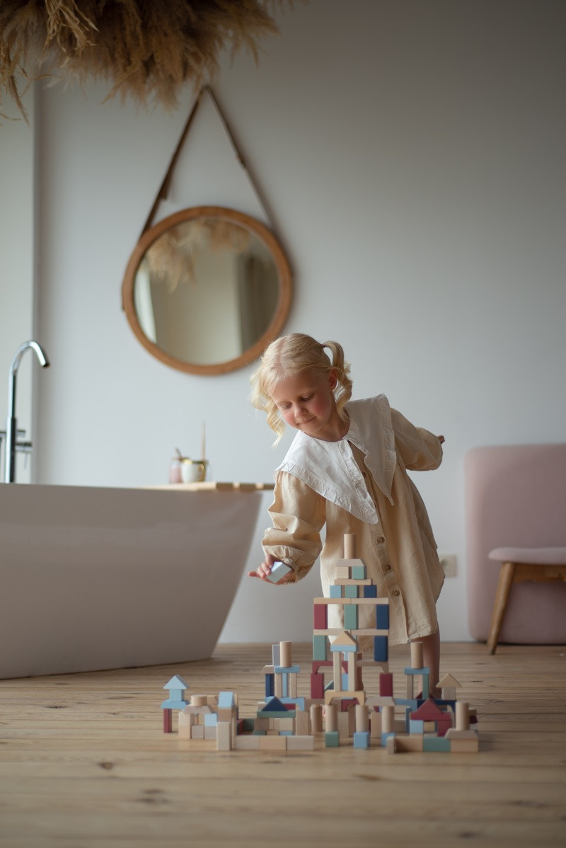 Jucarie din lemn, cubika, kit 100 de piese de constructie - pastel