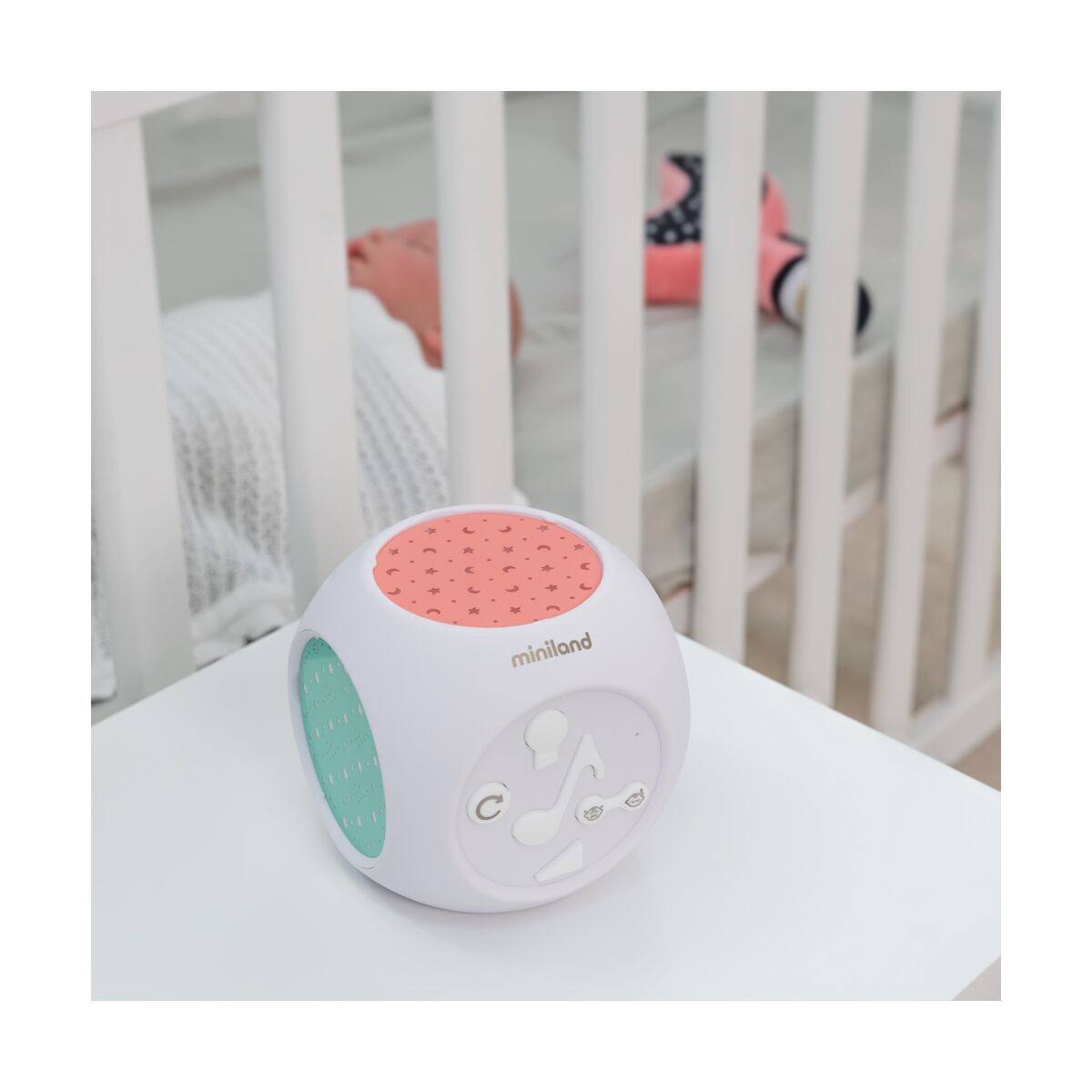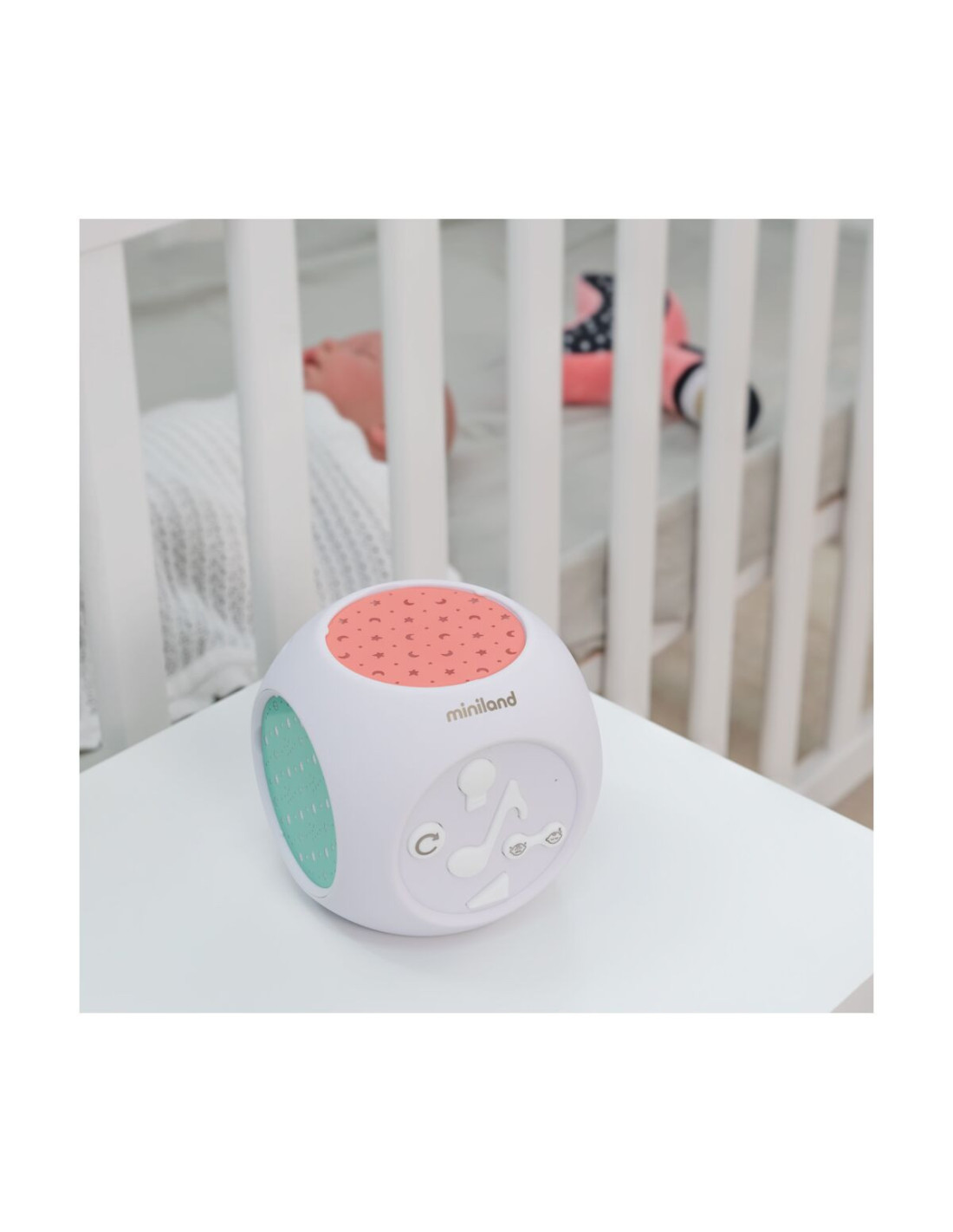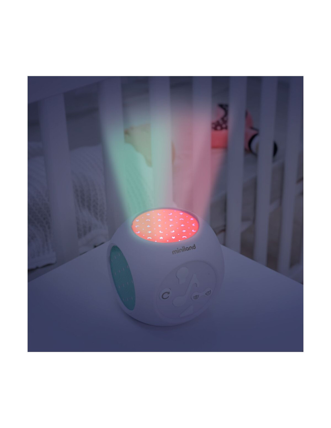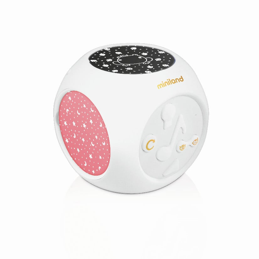 Dreamcube de la Miniland Baby este un proiector complet pentru camera, cu sunet si melodii.