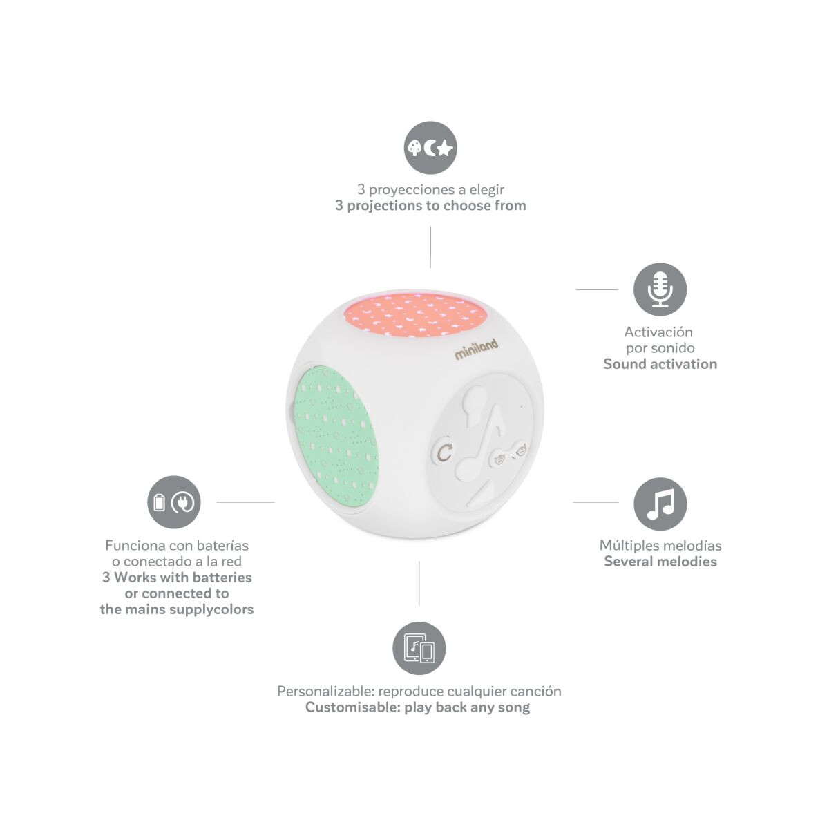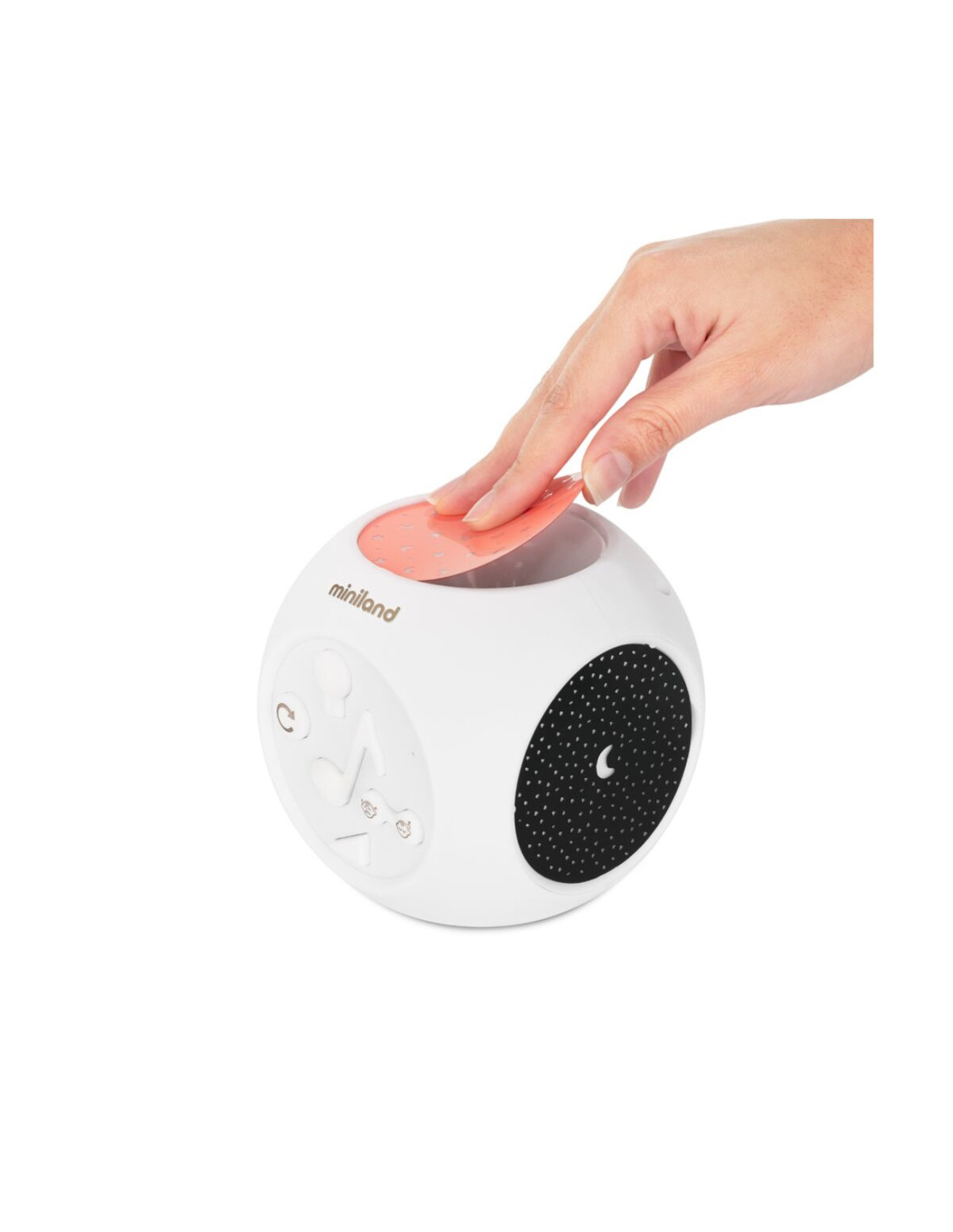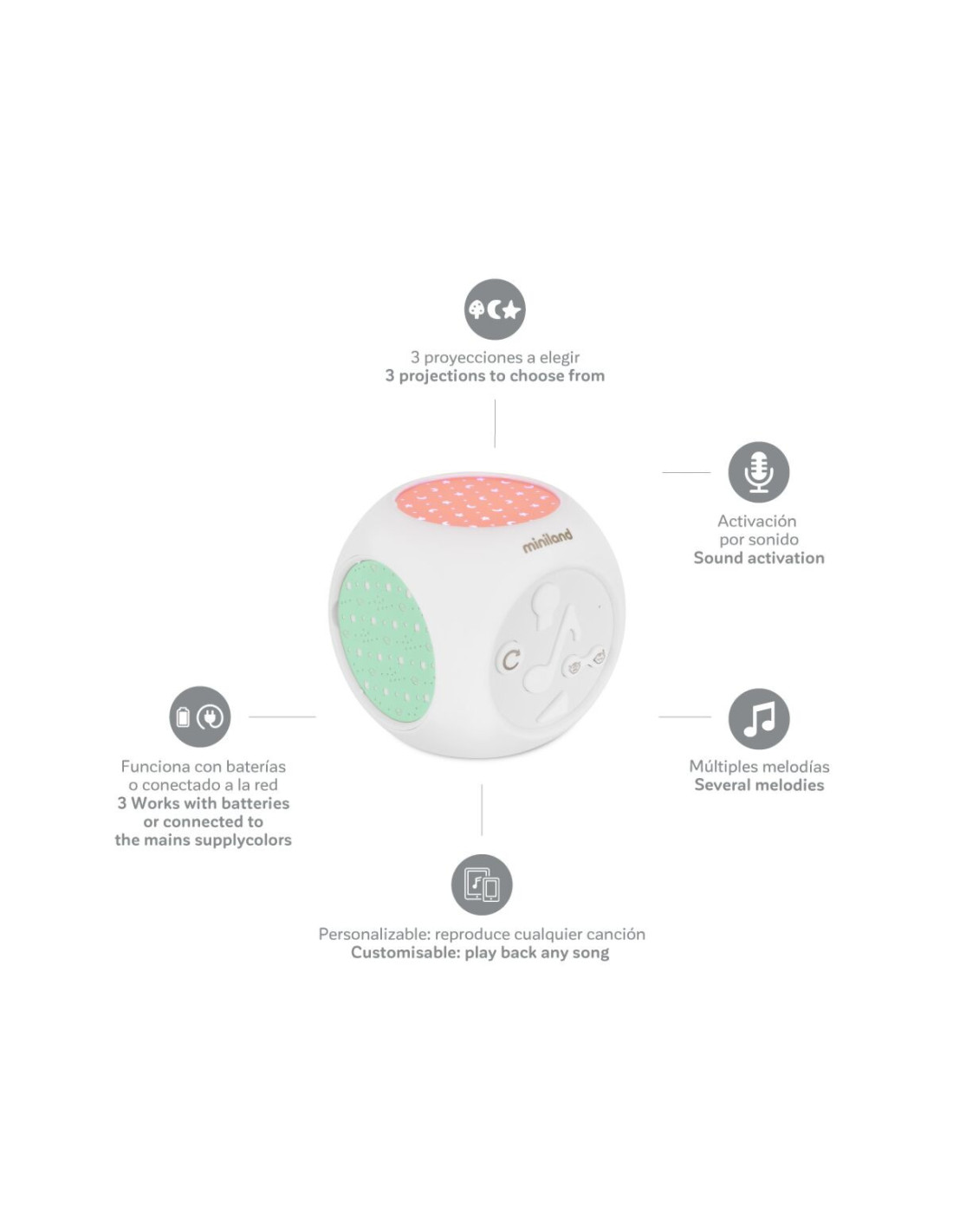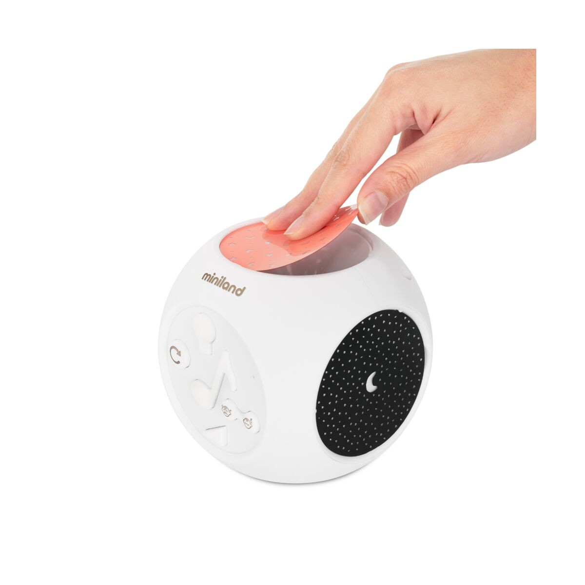 Dreamcube de la Miniland Baby este un proiector complet pentru camera, cu sunet si melodii.