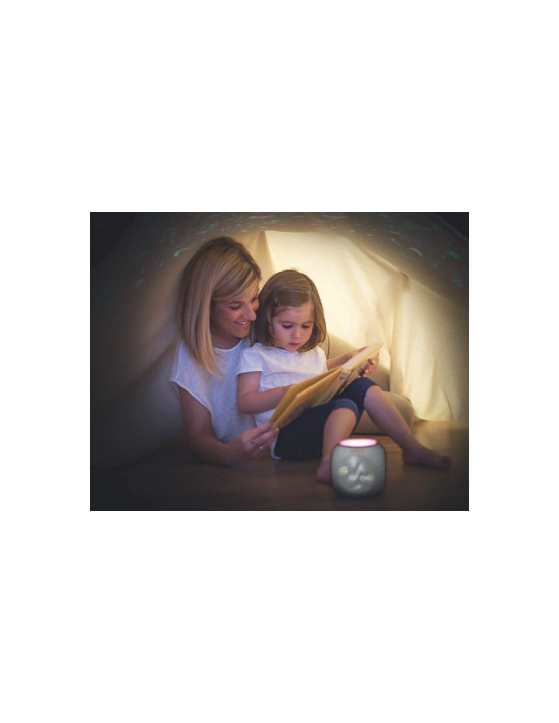 Relaxeaza copilul datorita melodiilor linistitoare precum si sunetului, in combinatie cu desenele proiectate pe tavan si lumina calda colorata.