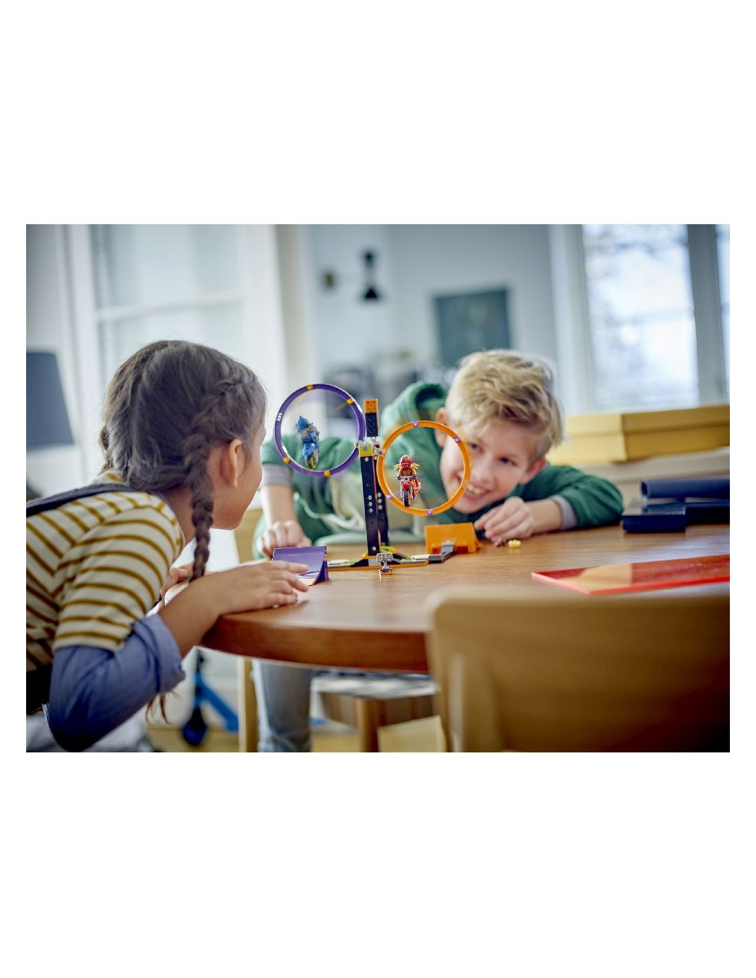 Copiii in varsta de 6+ ani pot pune in scena spectacole, jocuri si competitii cu acest set LEGO City Cascadorii rotative (60360), care include un cerc pentru sarituri dublu si rotativ, 2 rampe si 2 motociclete de cascadorii cu roti de viteza.