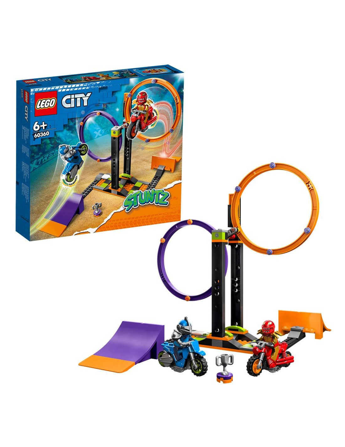 Combina acest set cu altele din tema LEGO City Stuntz pentru spectacole si competitii si mai mari.Cascadorii pentru copii de 6+ ani - Pregateste scena pentru demonstratii si competitii distractive cu setul de construit LEGO City Cascadorii rotative (60360) pentru joaca independenta sau de grup.Ce este in cutie? - Include un cerc de cascadorii dublu, 2 rampe de sarituri, 2 motociclete de cascadorii cu roti de viteza si 2 minifigurine sofer.Detalii si functii - Jucatorii invart cercul dublu pentru a intensifica provocarea.Un cadou pentru orice ocazie - Daruieste acest set LEGO City Stuntz drept cadou aniversar, de Craciun sau la orice ocazie copiilor si fanilor de cascadorii in varsta de 6 ani sau mai mari.Dimensiuni - Cascadoriile rotative cu cercurile pozitionate masoara peste 20 cm inaltime, 26 cm latime si 39 cm adancime.Include accesorii LEGO pentru minifigurine - Acest set contine o casca pentru minifigurina si un trofeu.O experienta digitala de construit distractiva - Copiii pot mari, roti si vizualiza modelele din toate unghiurile in timp ce construiesc cu aplicatia LEGO Builder pentru telefoane si tablete.Jucarii ce ajuta la dezvoltarea copiilor - Seturile LEGO City prezinta structuri, vehicule si personaje pentru o joaca de roluri imaginativa care construieste abilitatile si increderea in sine.