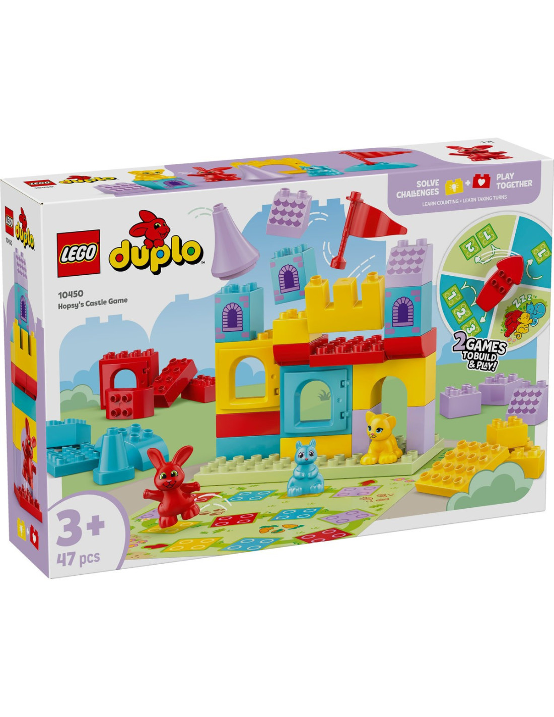 Bucura-te de ore intregi de distractie in familie alaturi de micutul tau in timp ce-l ajuti sa invete distrandu-se cu jocul de societate 2 in 1 LEGO® DUPLO® Jocul de la castelul Saltaretei (10450).