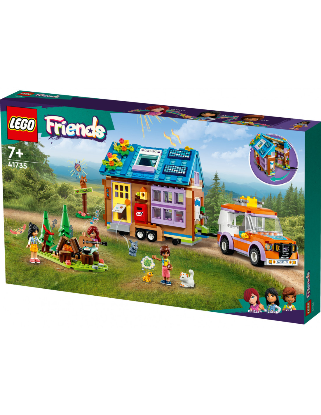 Cu setul LEGO® Friends Casuta mobila (41735) pentru copii de 7+ ani, aventurile creative sunt usor de construit. Masina tracteaza casuta si are locuri pentru 3 personaje minipapusi. Casa se deschide pentru a dezvalui baia, bucataria si dormitoarele si contine si accesorii – inclusiv un foc de tabara – pentru ca cei mici sa-si imagineze propriile povesti de camping. Copiii vor adora sa se familiarizeze cu personajele si hobby-urile lor. Leo a adus gustari facute in casa, iar Liann e nerabdatoare sa schiteze portretele animalelor de companie ale prietenilor in minunata padure. Paisley si-a adus in excursie iepurasul si abia asteapta sa scrie versuri de cantece, sub inspiratia cadrului natural.
