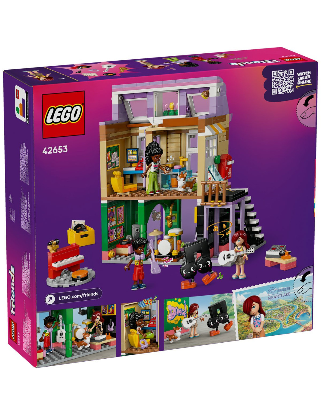LEGO® Friends Magazin de muzica si apartament (42653) pentru fete, baieti si pasionati de muzica de 7 ani si mai mari include 3 minipapusi LEGO Friends si o figurina corgi, plus accesorii care inspira joaca fantezista.