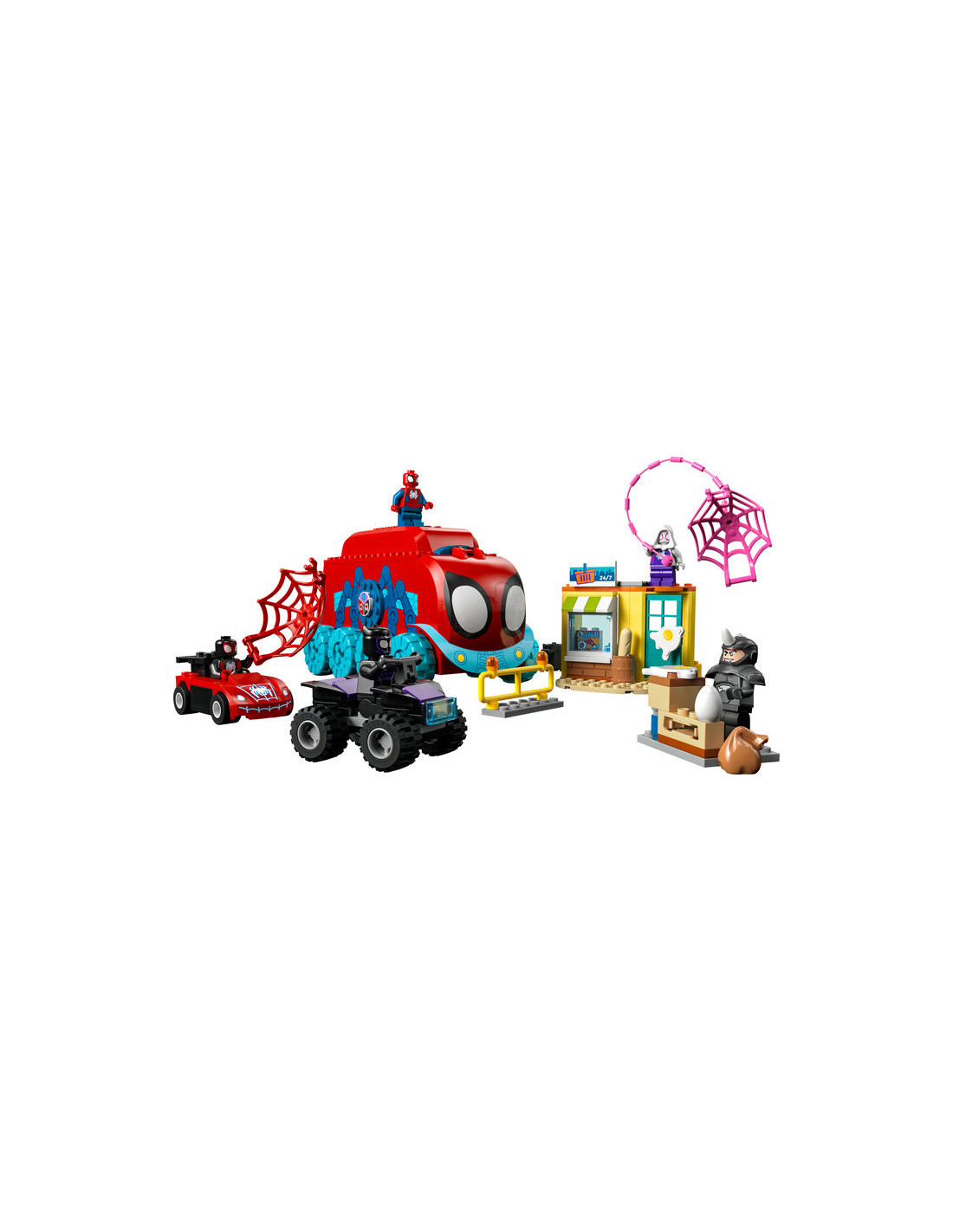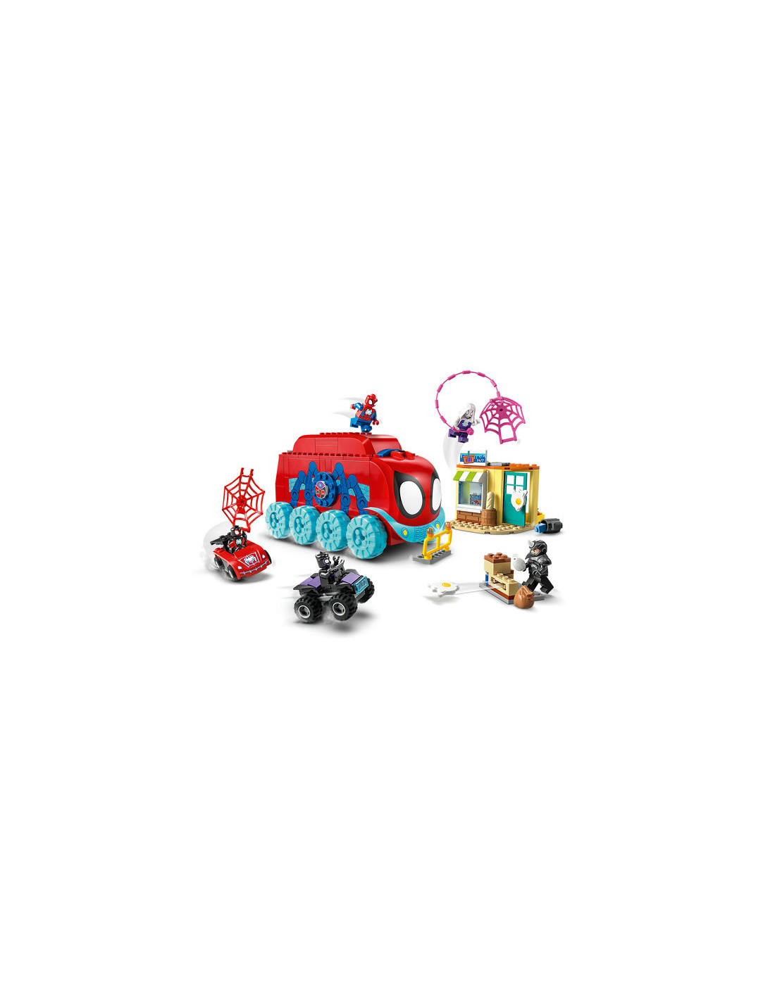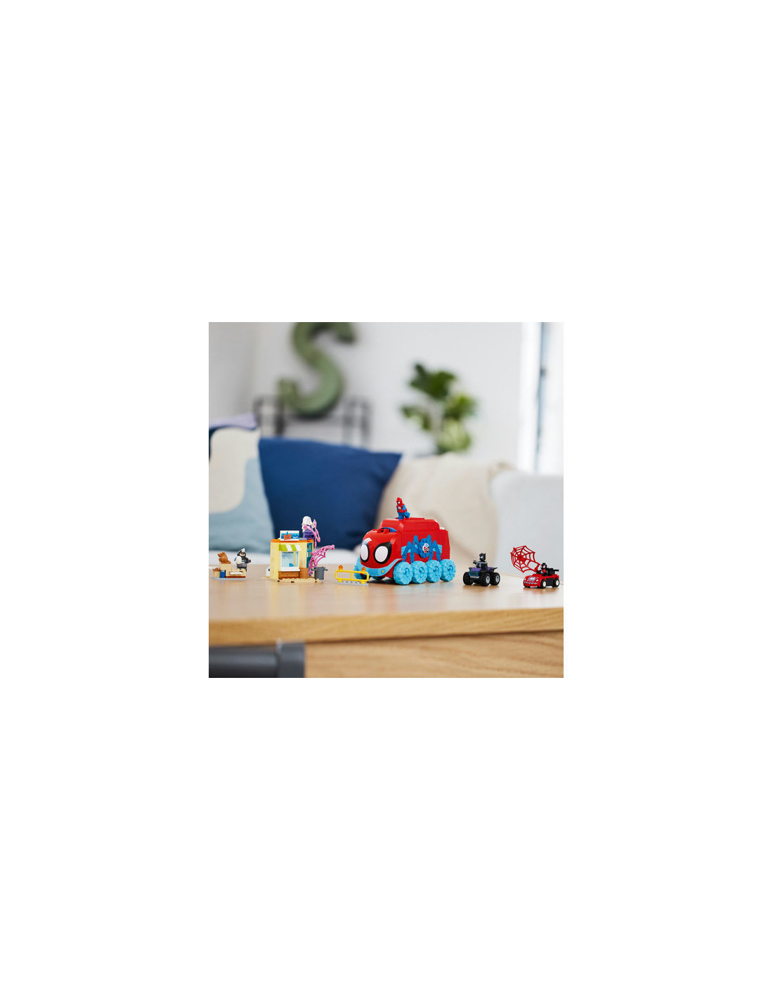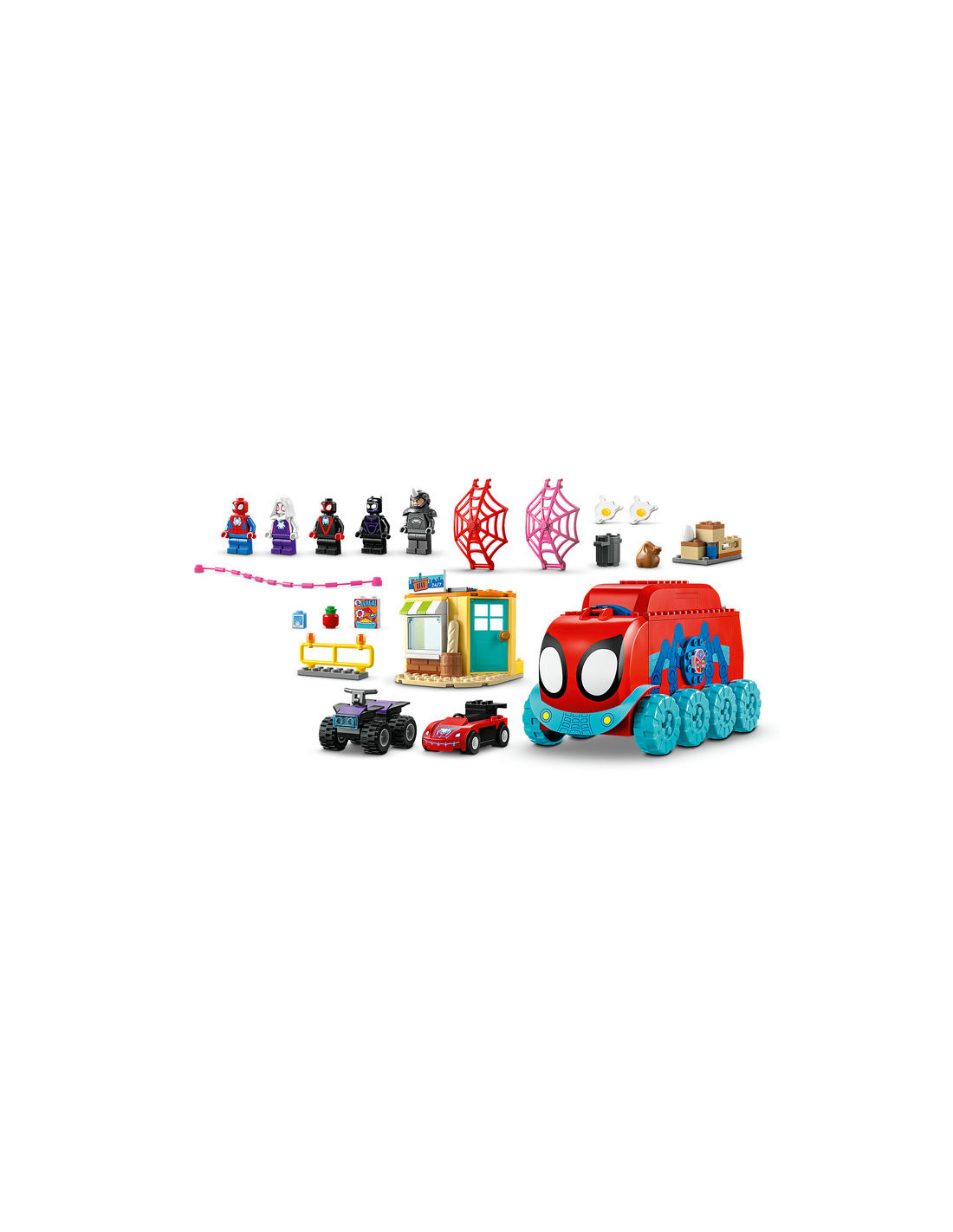 Setul include 5 minifigurine +u2013 Spidey, Păianjenul-Fantomă, Miles Morales, Pantera neagră şi Rinocer +u2013 precum şi un sediu construibil pentru Spidey şi echipă. Sediul mobil are un cockpit cu deschidere şi o uşă în spate, prin care o maşină decapotabilă şi un ATV pot intra şi ieşi. Rinocerul e echipat cu un lansator de ouă. Ţinta lui e o băcănie, care conţine muniţie din belşug pentru o luptă cu alimente. Accesoriile includ pânză de păianjen şi piese de mobilier stradal, iar un şasiu din 2 cărămizi şi un ghid-poveste ilustrat oferă copiilor încrederea de a asambla setul. Pentru mai multă distracţie digitală, aplicaţia LEGO Builder conţine instrumente de apropiere şi rotire, care permit copiilor să-şi vizualizeze modelul în timp ce-l construiesc.