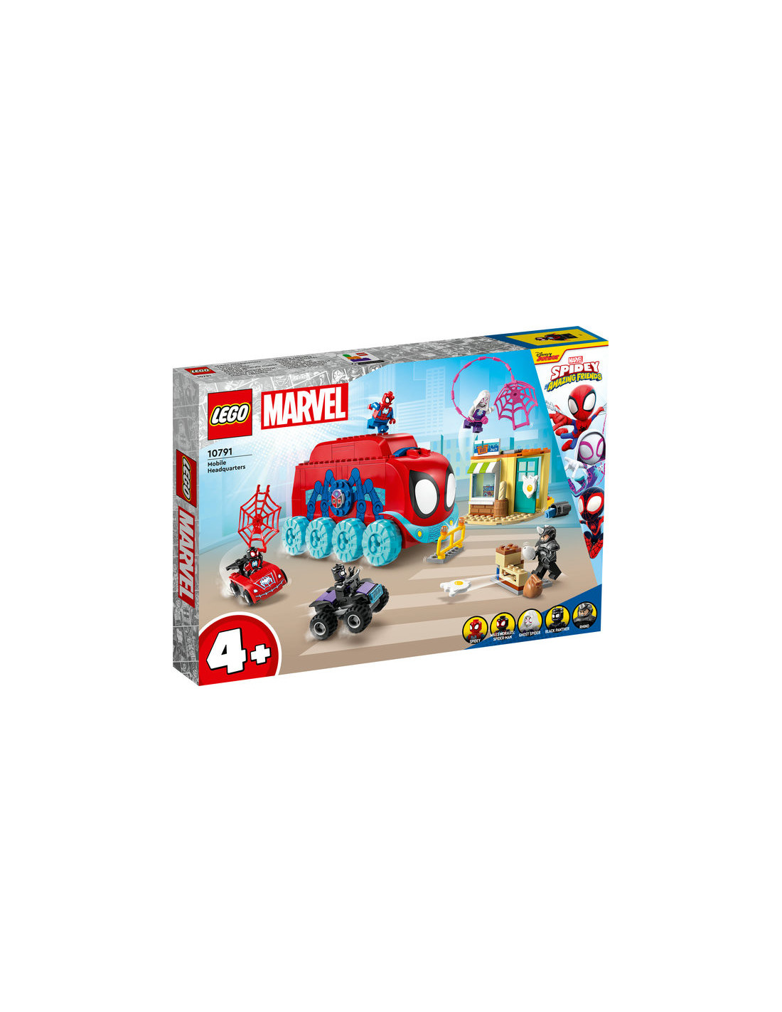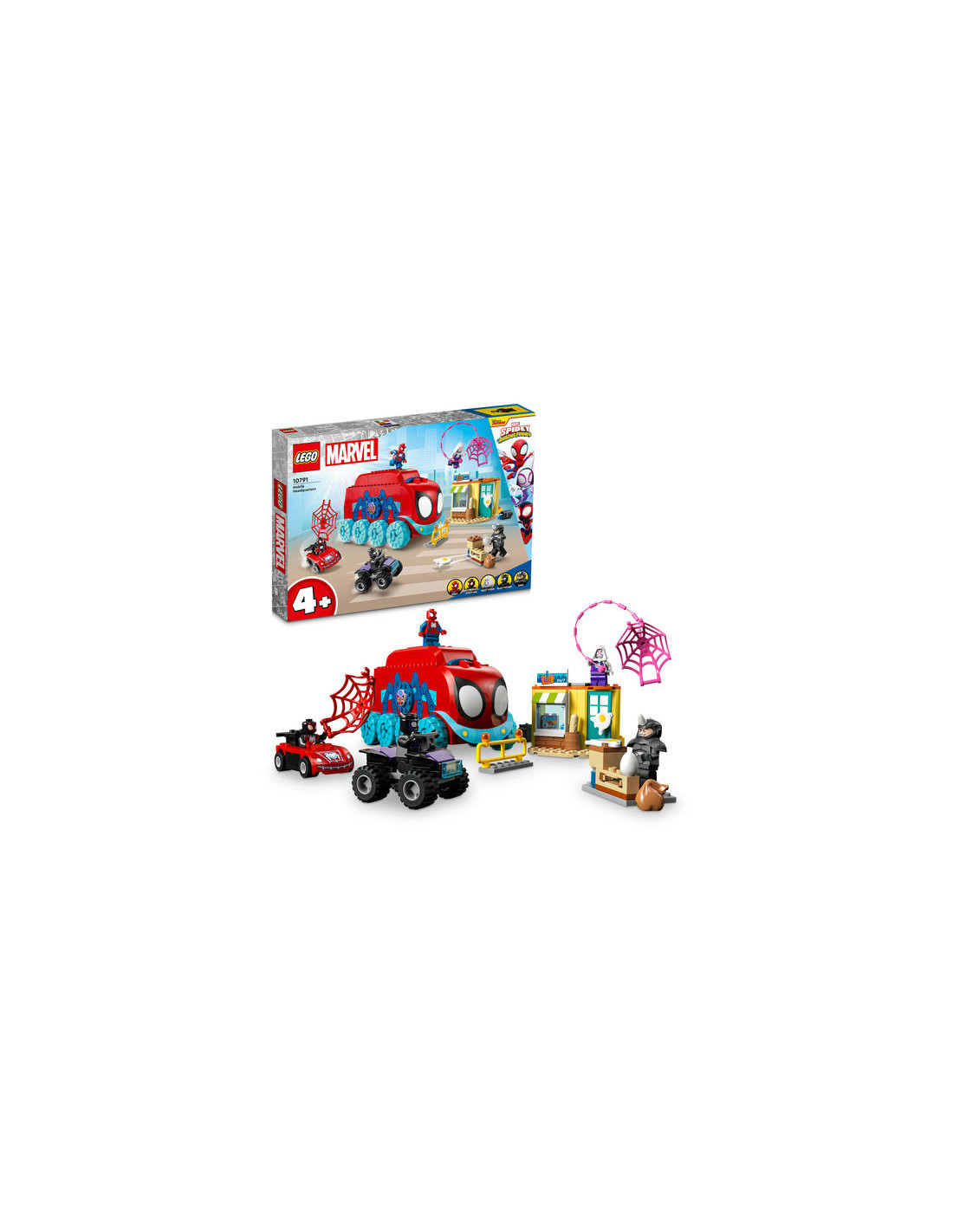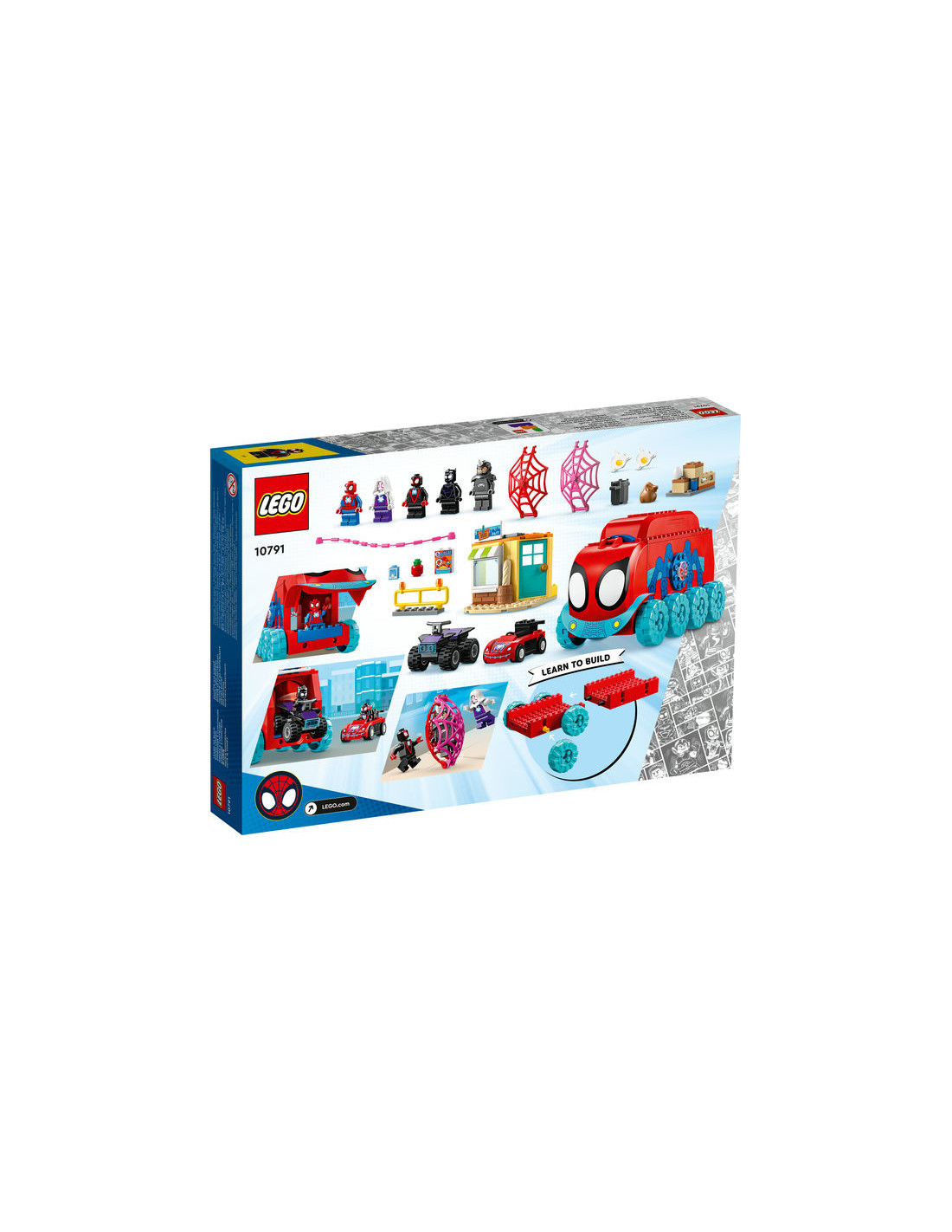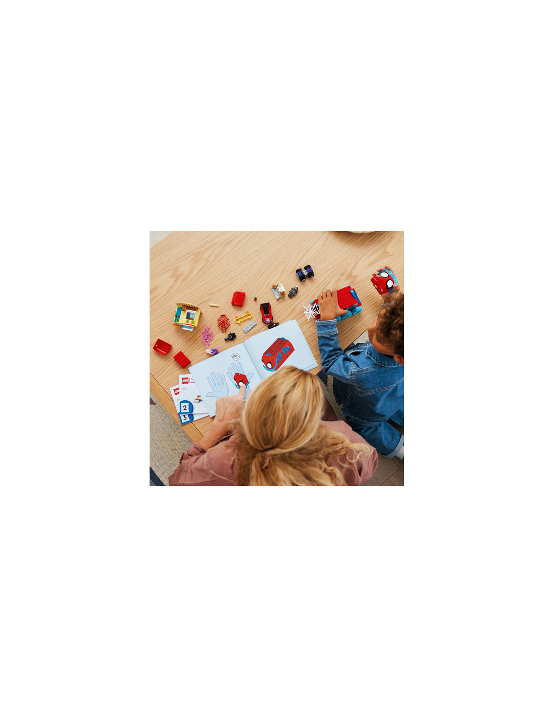 Setul include 5 minifigurine +u2013 Spidey, Păianjenul-Fantomă, Miles Morales, Pantera neagră şi Rinocer +u2013 precum şi un sediu construibil pentru Spidey şi echipă. Sediul mobil are un cockpit cu deschidere şi o uşă în spate, prin care o maşină decapotabilă şi un ATV pot intra şi ieşi. Rinocerul e echipat cu un lansator de ouă. Ţinta lui e o băcănie, care conţine muniţie din belşug pentru o luptă cu alimente. Accesoriile includ pânză de păianjen şi piese de mobilier stradal, iar un şasiu din 2 cărămizi şi un ghid-poveste ilustrat oferă copiilor încrederea de a asambla setul. Pentru mai multă distracţie digitală, aplicaţia LEGO Builder conţine instrumente de apropiere şi rotire, care permit copiilor să-şi vizualizeze modelul în timp ce-l construiesc.