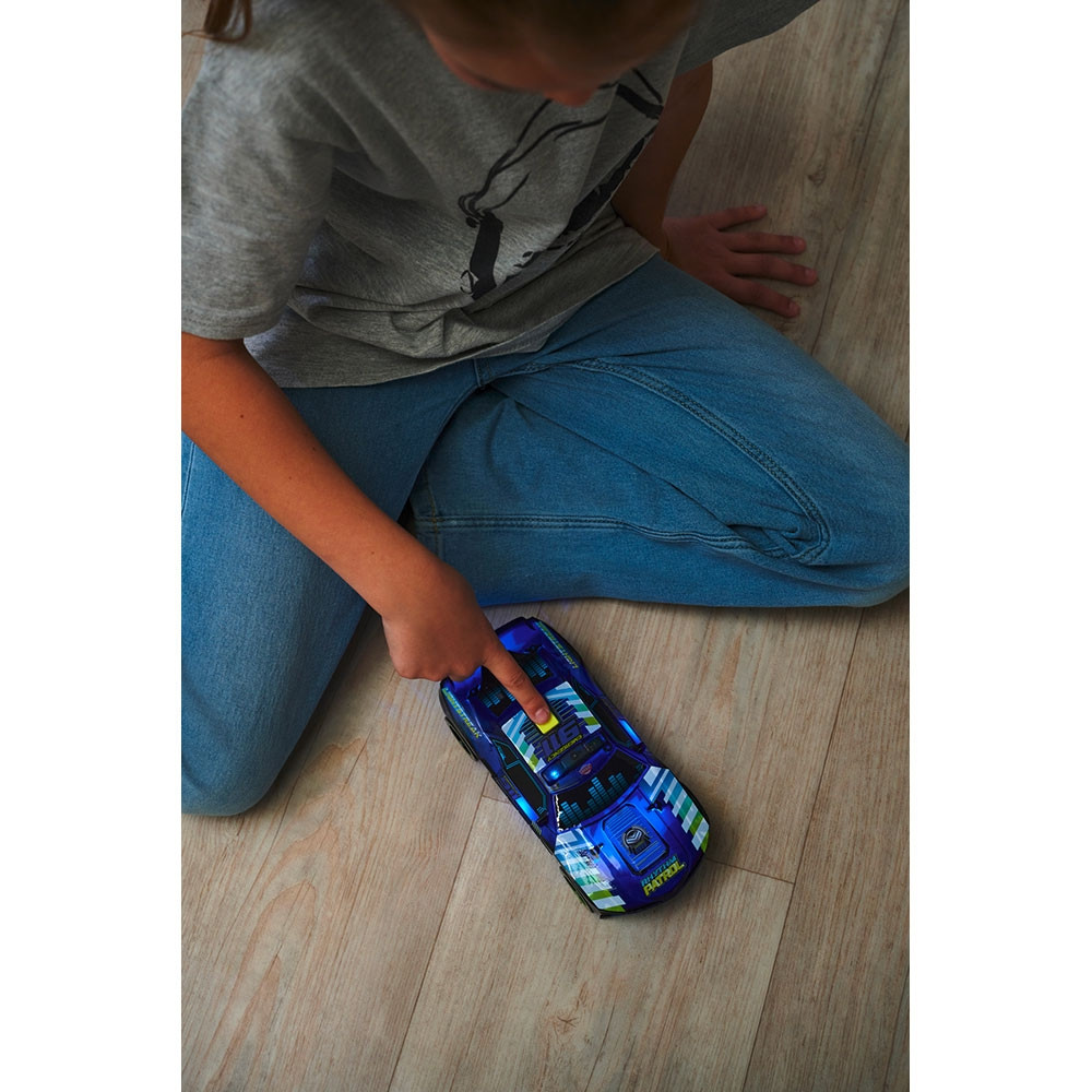 - Prin apasarea butonului, masina straluceste in noapte. Aceasta isi schimba culorile si sunetele