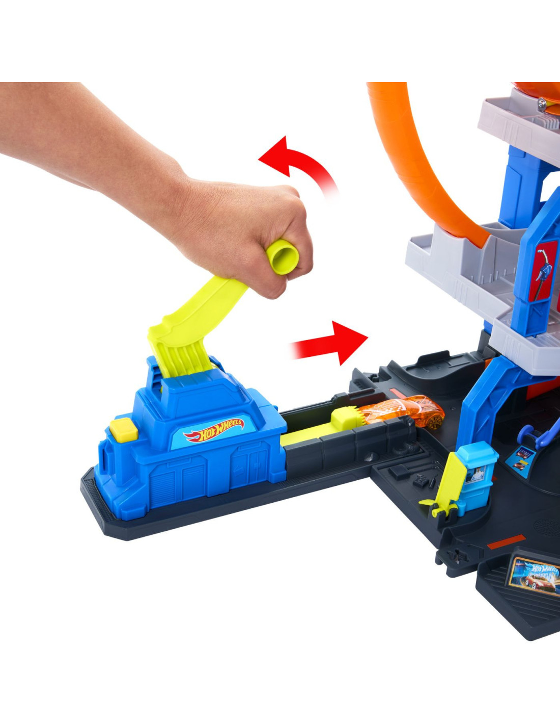 Caracteristici spalatorie auto la parter pentru un start curat inainte de cursa, lansator Slam o singura apasare trimite masina in viteza pe cele doua benzi de competitie, deviatoare de pista schimba traseul si controleaza directia cursei cu o simpla rasucire, lift manual actionat de copii transporta masinile intre etaje pentru mai multa distractie verticala, elicopter inclus ridica actiunea de pe sosea si du-o in aer pentru misiuni imaginative.
