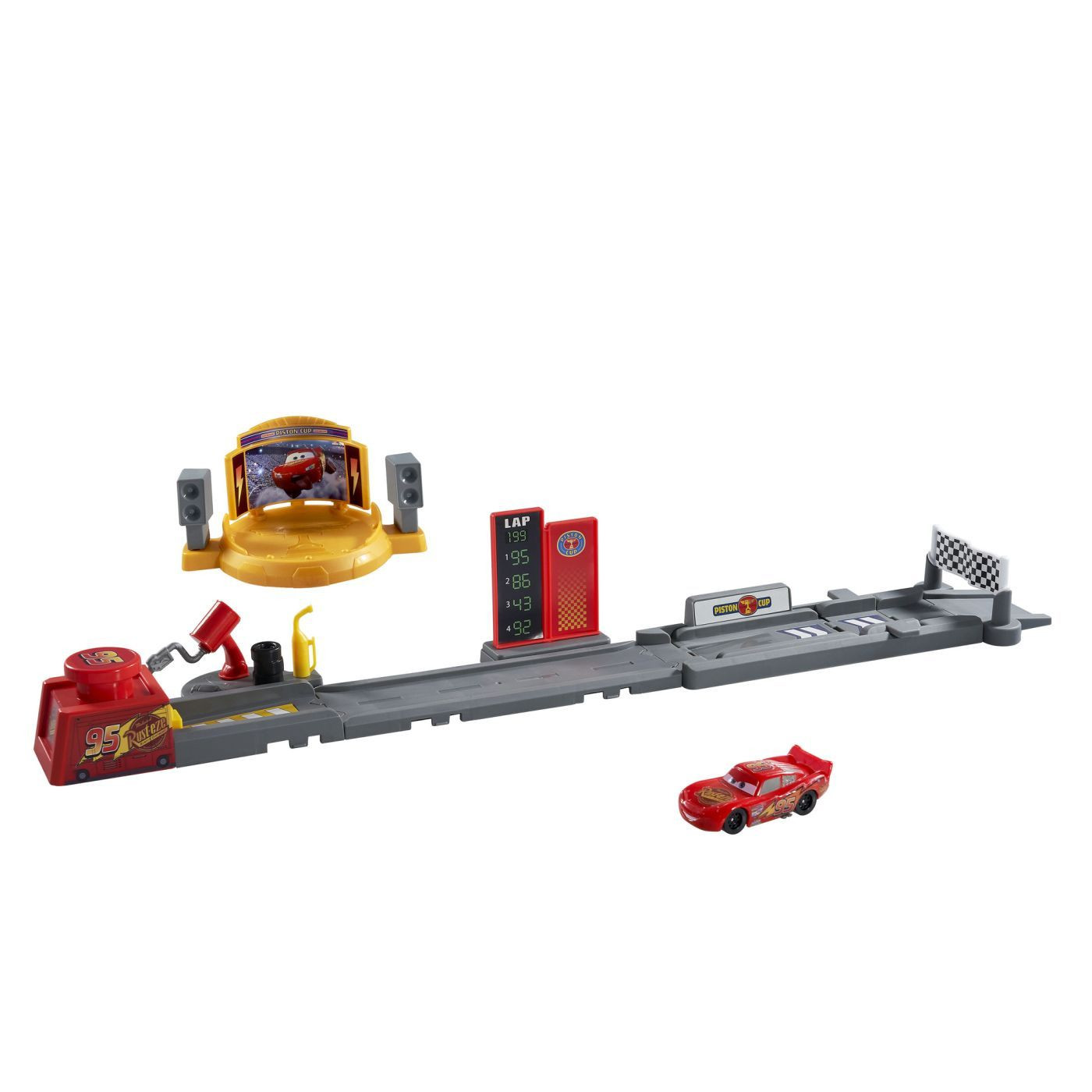 Plaseaza masinuta de jucarie Fulger McQueen inclusa in lansator si trimite-o in viteza pe pista si printre steagurile in carouri, facandu-le sa se roteasca, urmareste pe ecranul mare!
