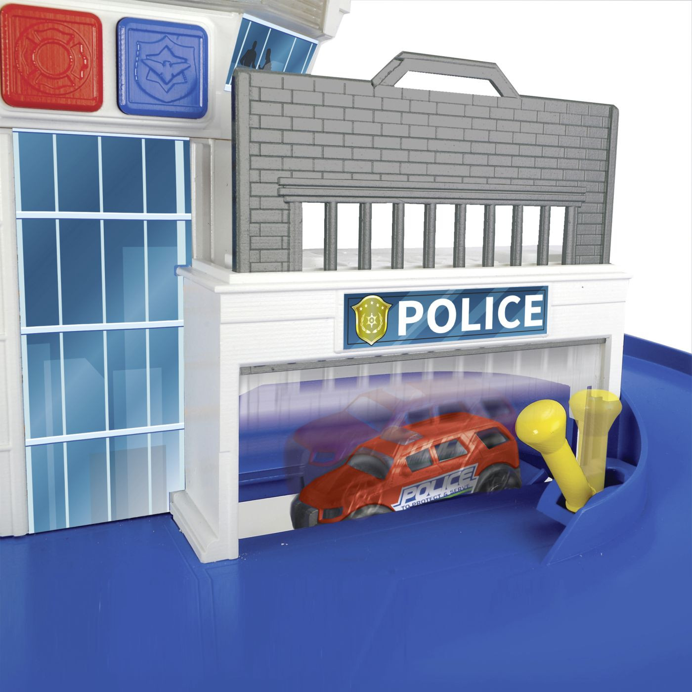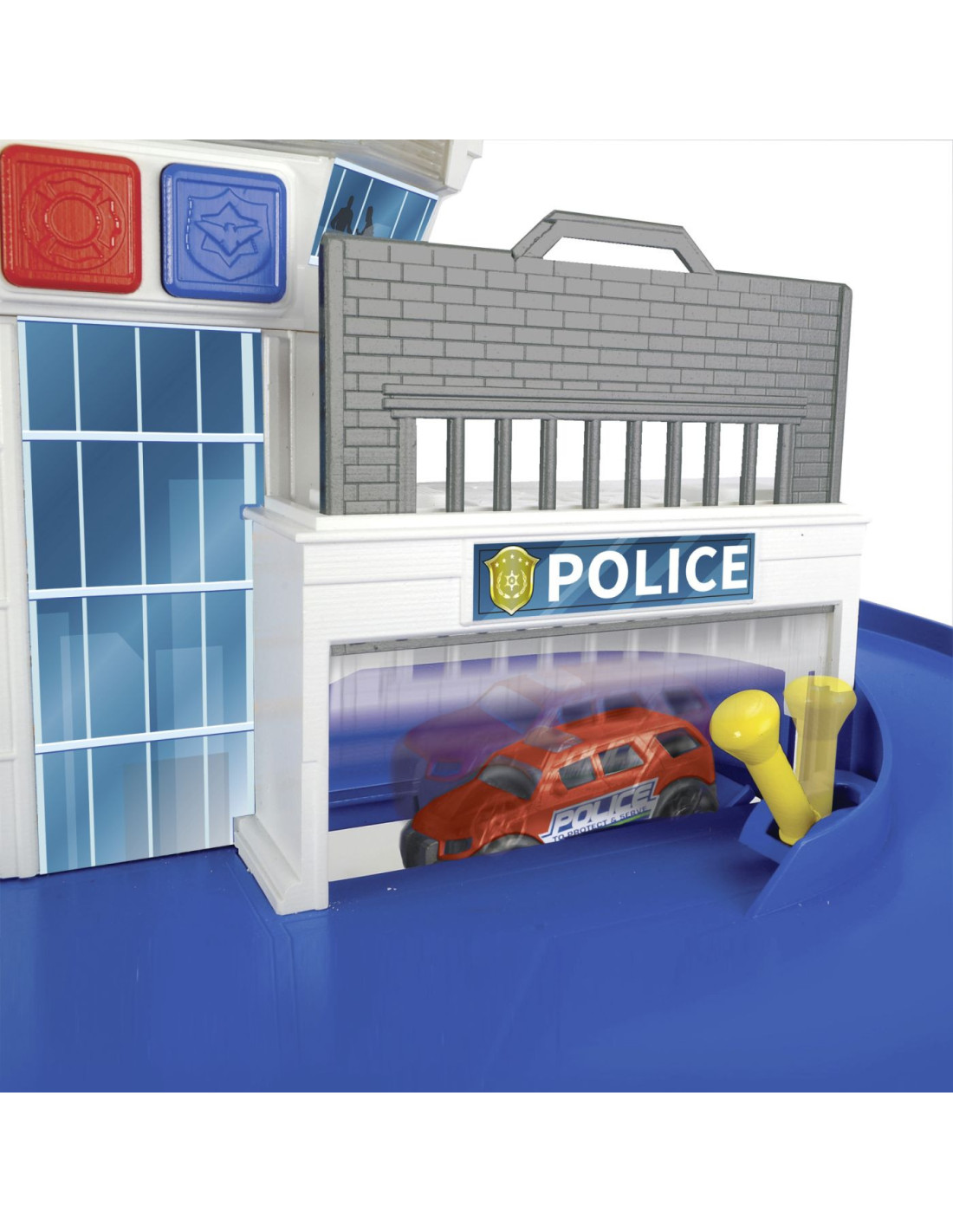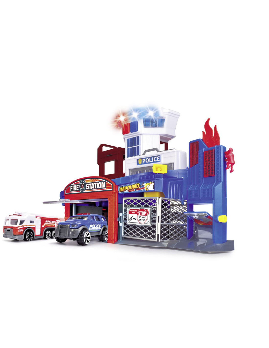 Setul contine doua vehicule o masina de pompieri si un vehicul de politie, dar este compatibil si cu alte masinute de jucarie de la branduri cunoscute.
