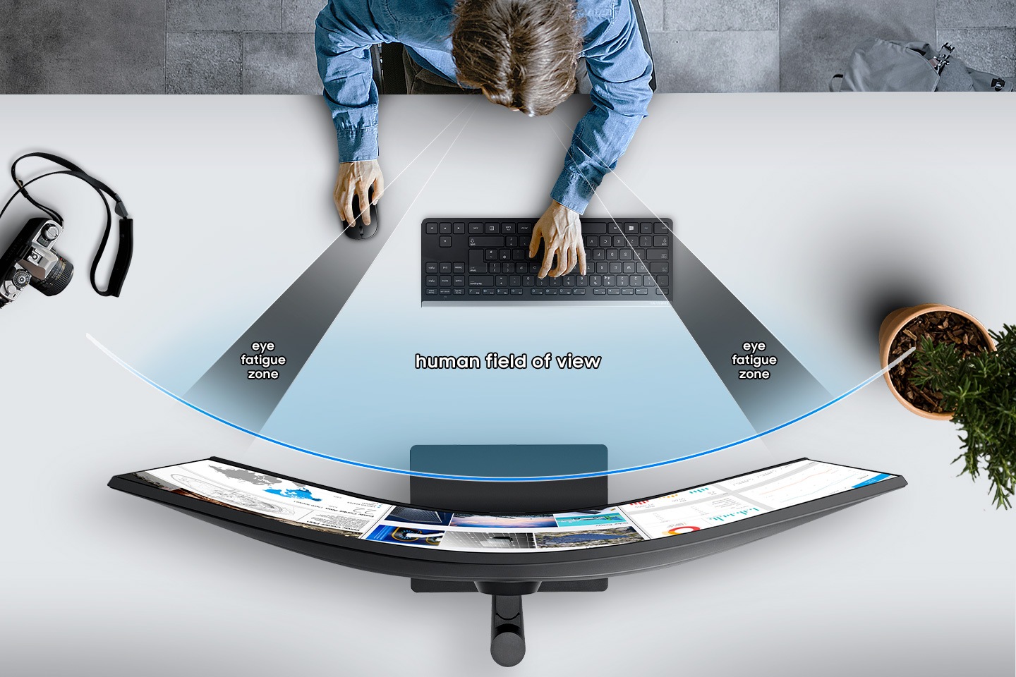 Sporește-ți productivitatea și redu oboseala ochilor, în acele zile lungi de lucru. Curbura 1000R se potrivește îndeaproape curburii câmpului vizual uman, permițând vizualizarea conținutului dintr-o privire, dovedind limitarea efectivă a efortului ochilor, comparativ cu monitoarele plate, pentru o experiență mai confortabilă.