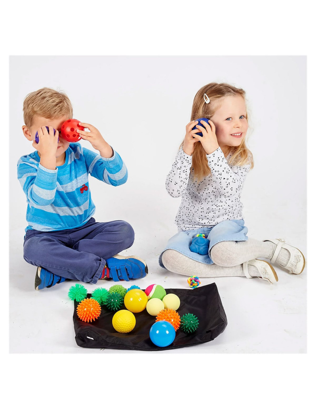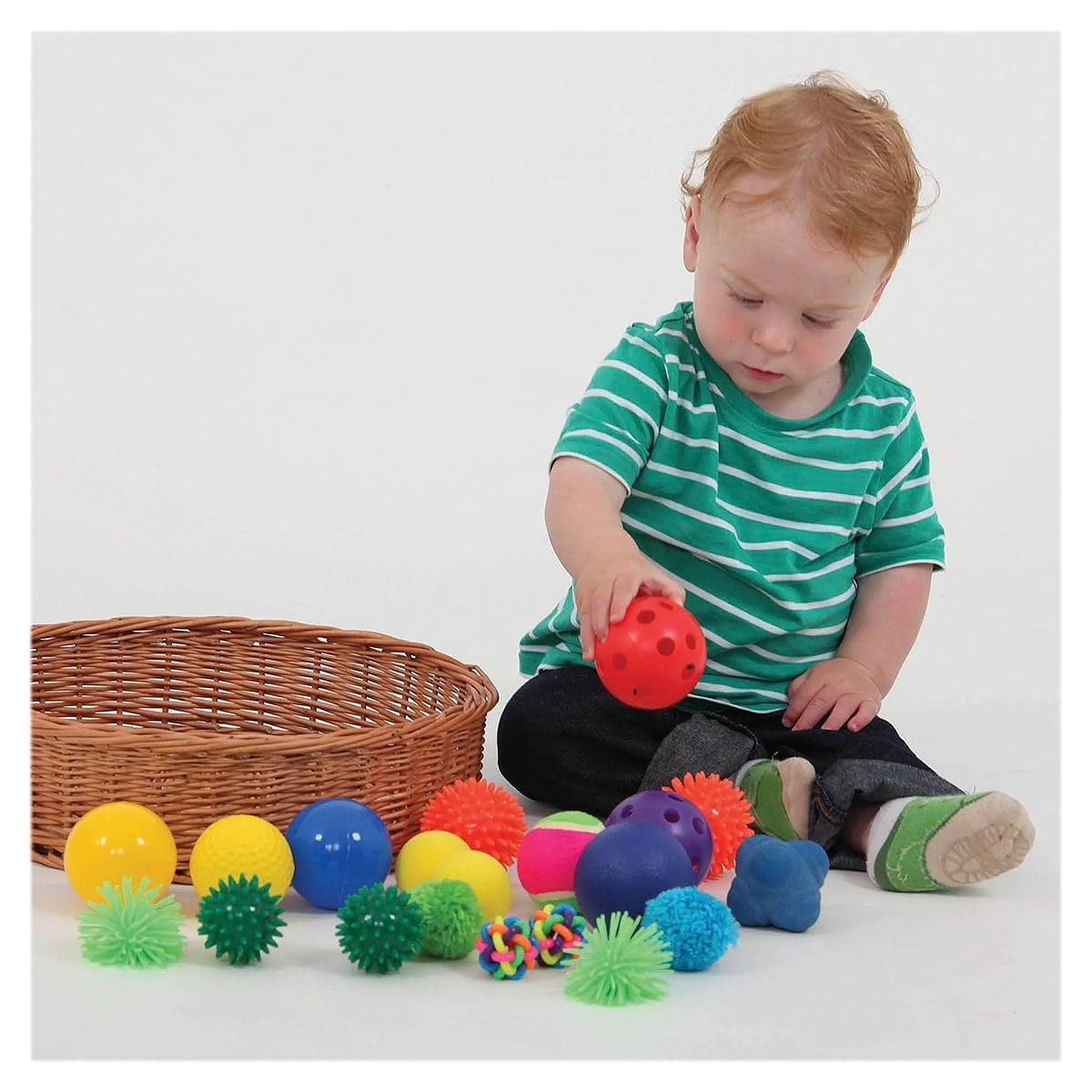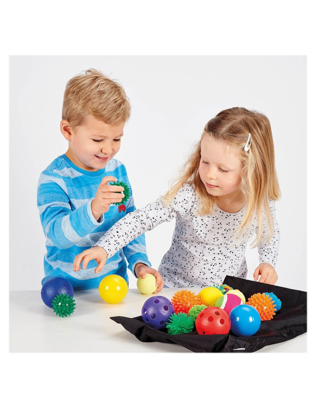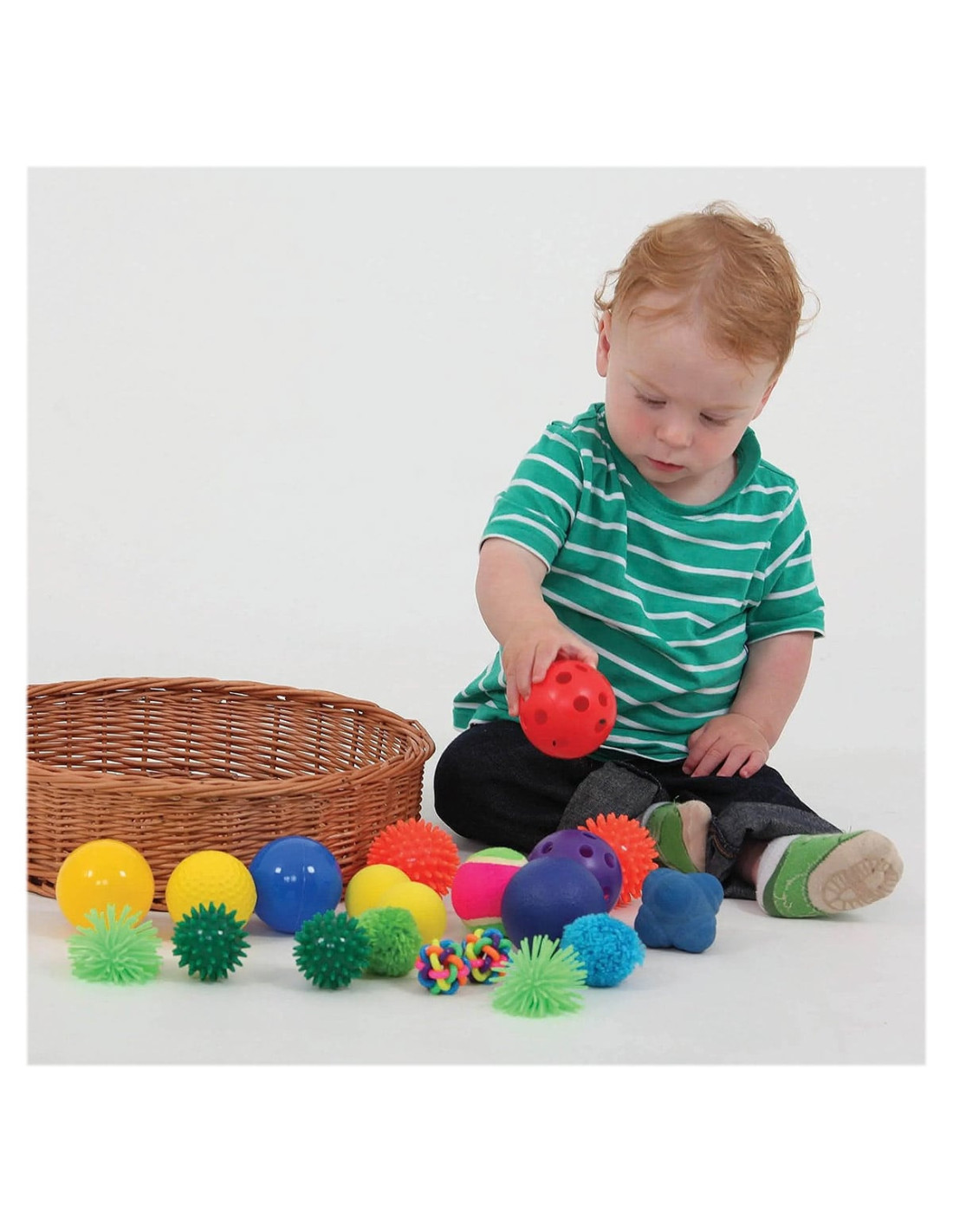 - Acest set versatil cu 20 de mingi senzoriale cu texturi, culori, forme si densitati diferite este ideal pentru a incuraja explorarea senzoriala a copiilor.