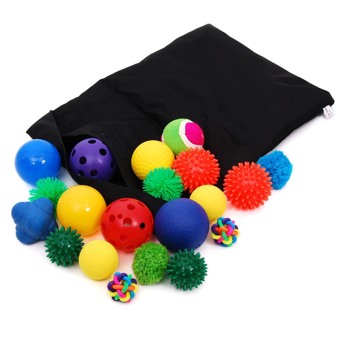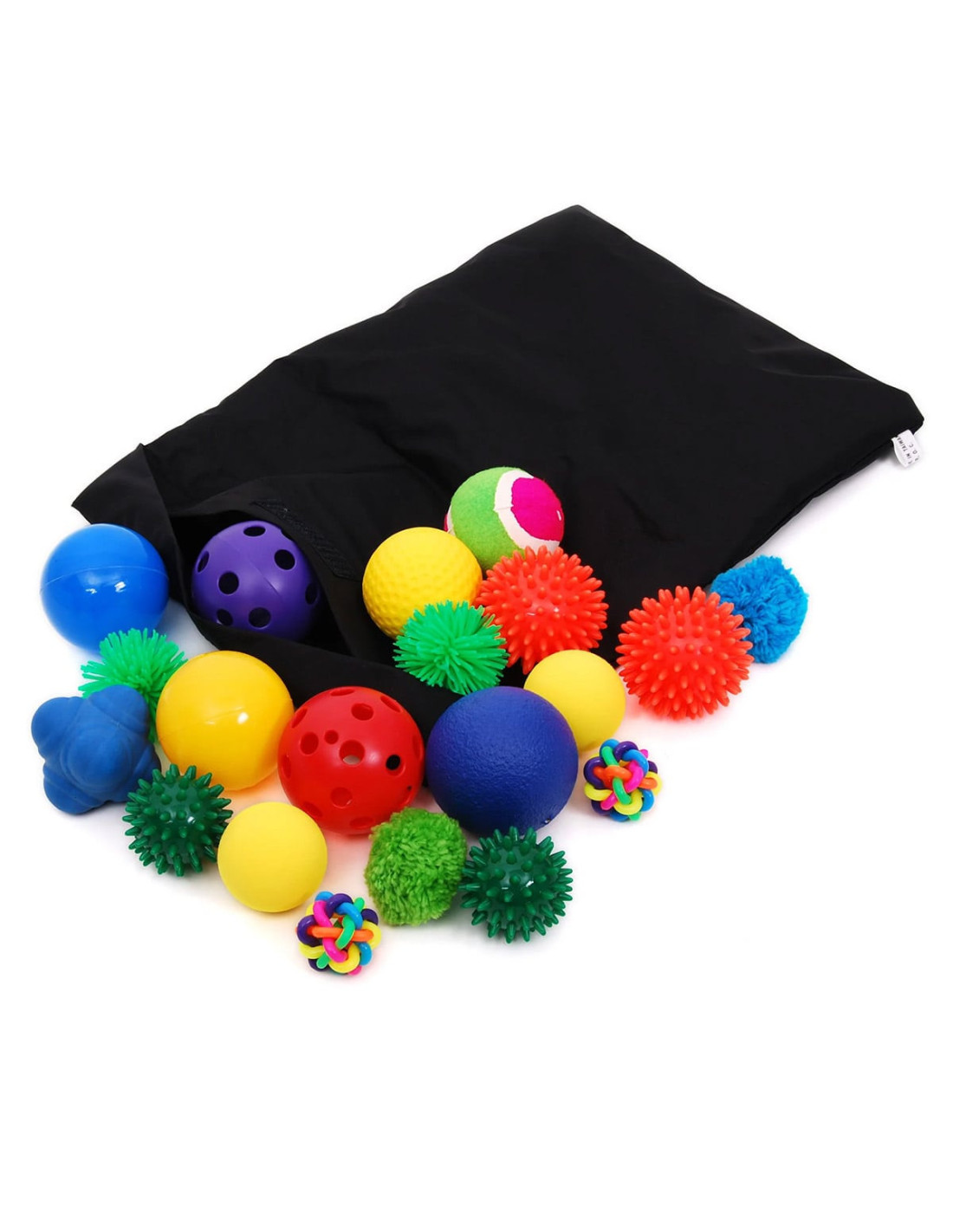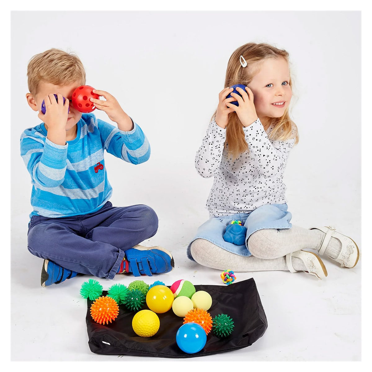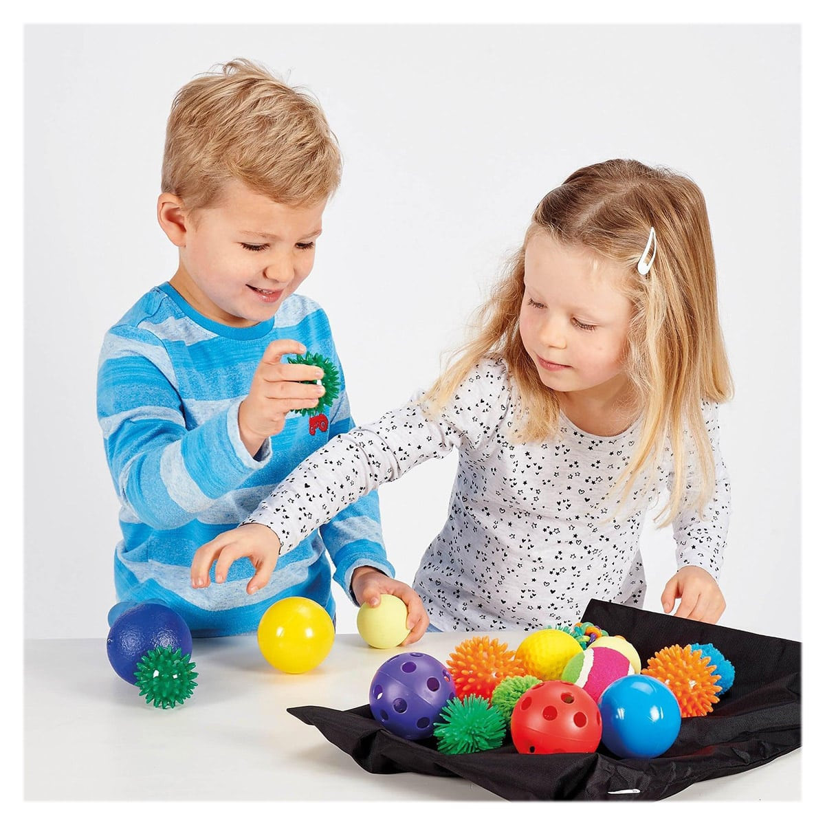 - Acest set versatil cu 20 de mingi senzoriale cu texturi, culori, forme si densitati diferite este ideal pentru a incuraja explorarea senzoriala a copiilor.