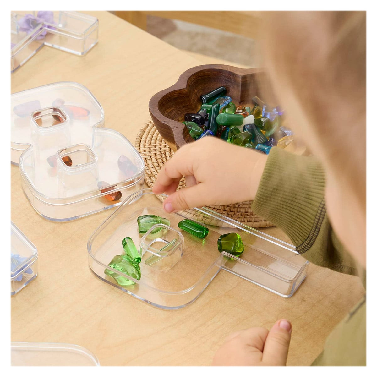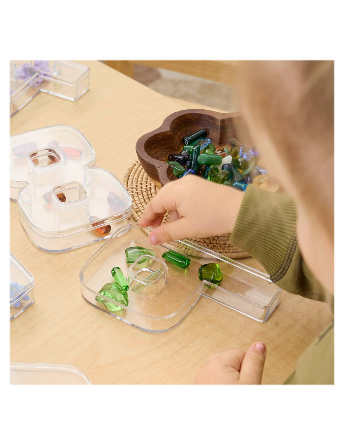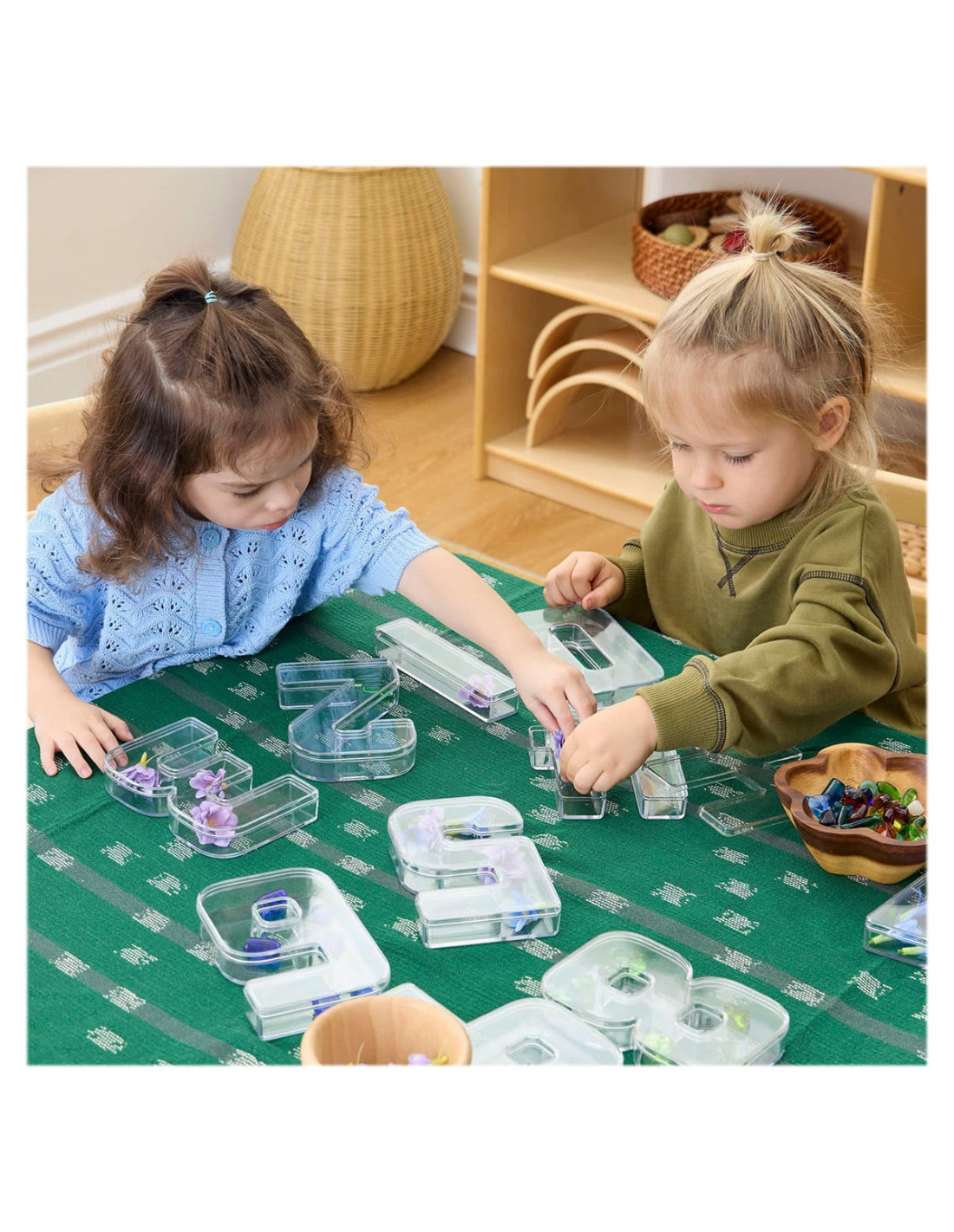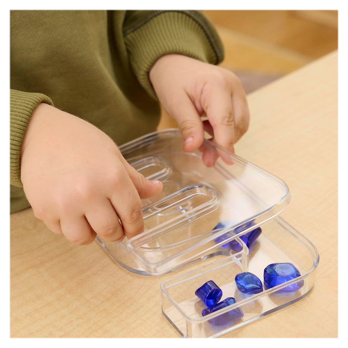 - Setul de casete transparente stimuleaza motricitatea fina si abilitatile numerice de baza si este ideal pentru explorarea culorilor, formelor si a diferitelor materiale naturale. In plus este o resursa educationala minunata pentru dezvoltarea imaginatiei si creativitati, incurajand curiozitatea naturala, explorarea, joaca libera, gandirea creativa, atentia si observarea mediul inconjurator.