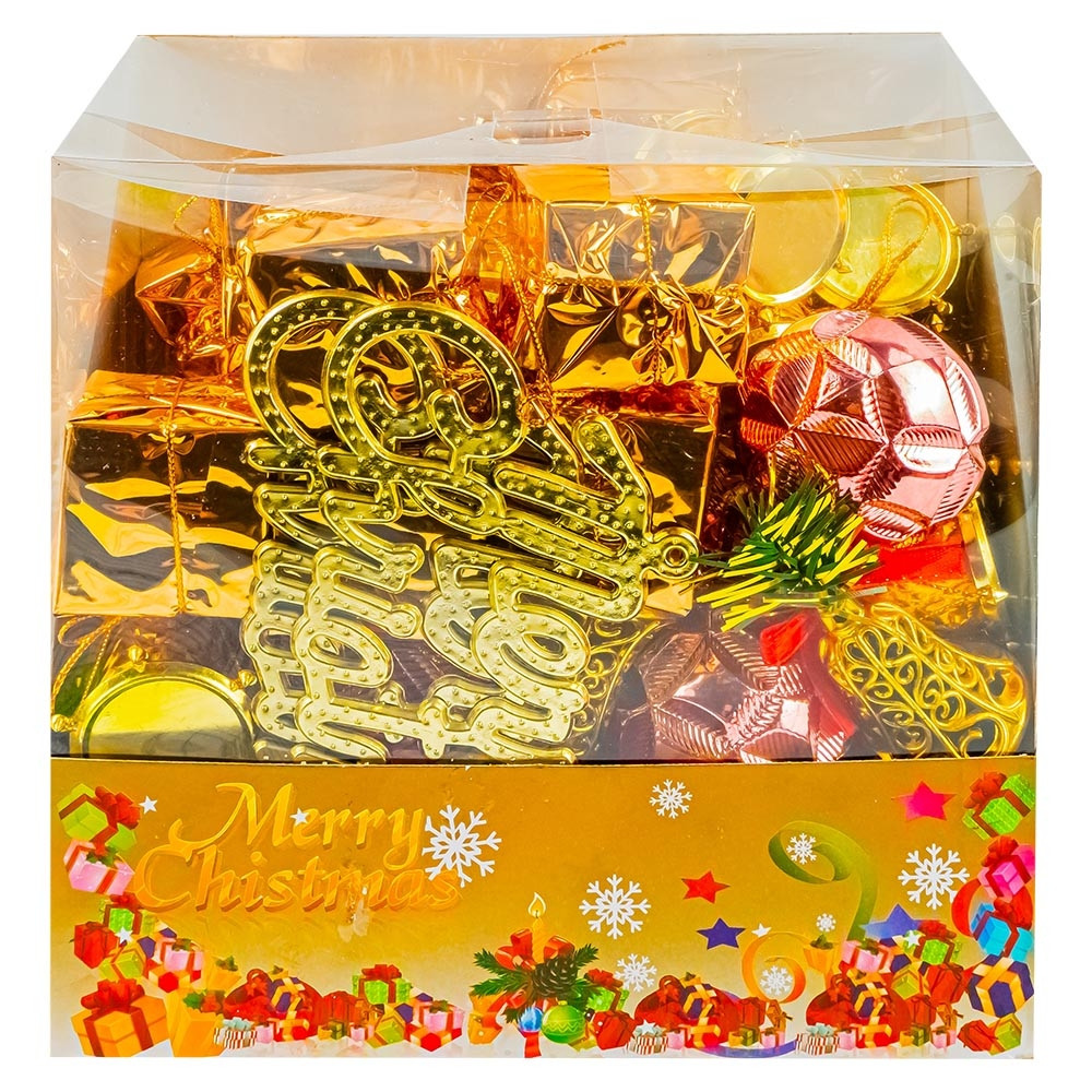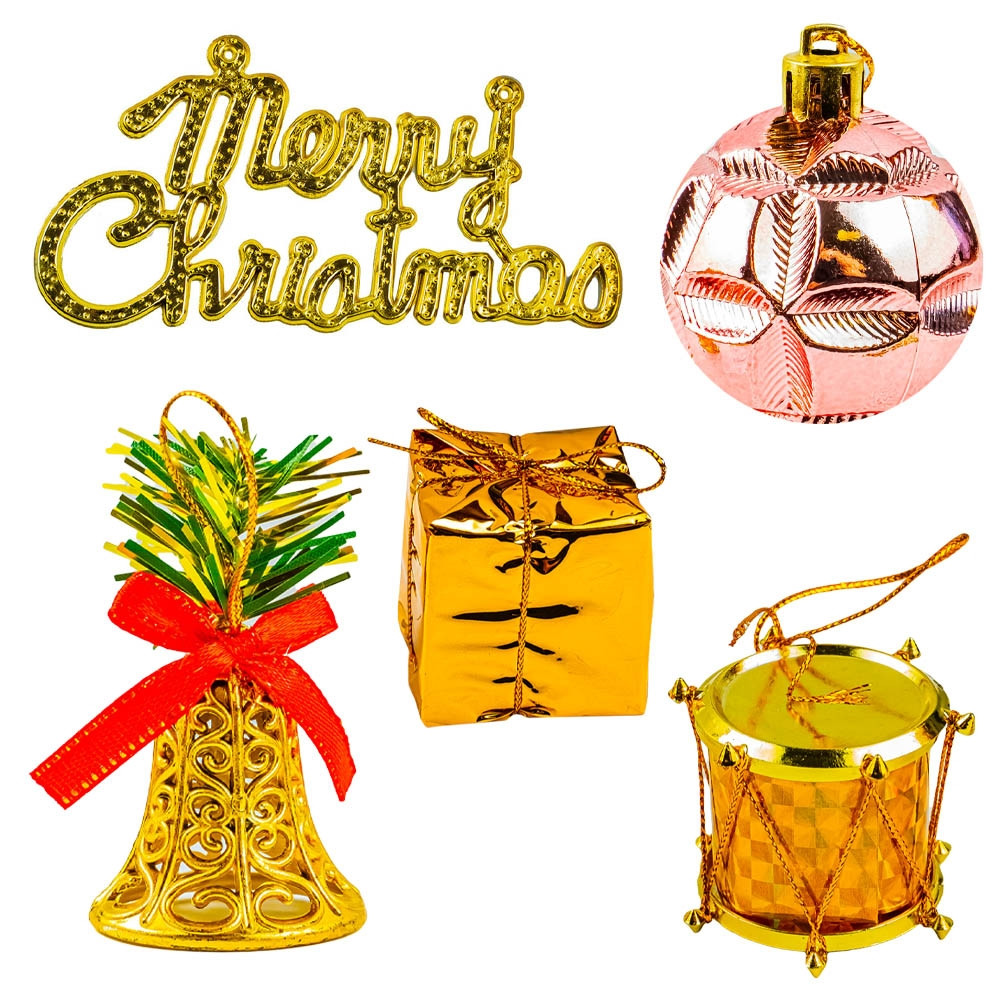 • Set complet de 48 decorațiuni în nuanțe aurii și roz pastel, cu accente de roșu și verde