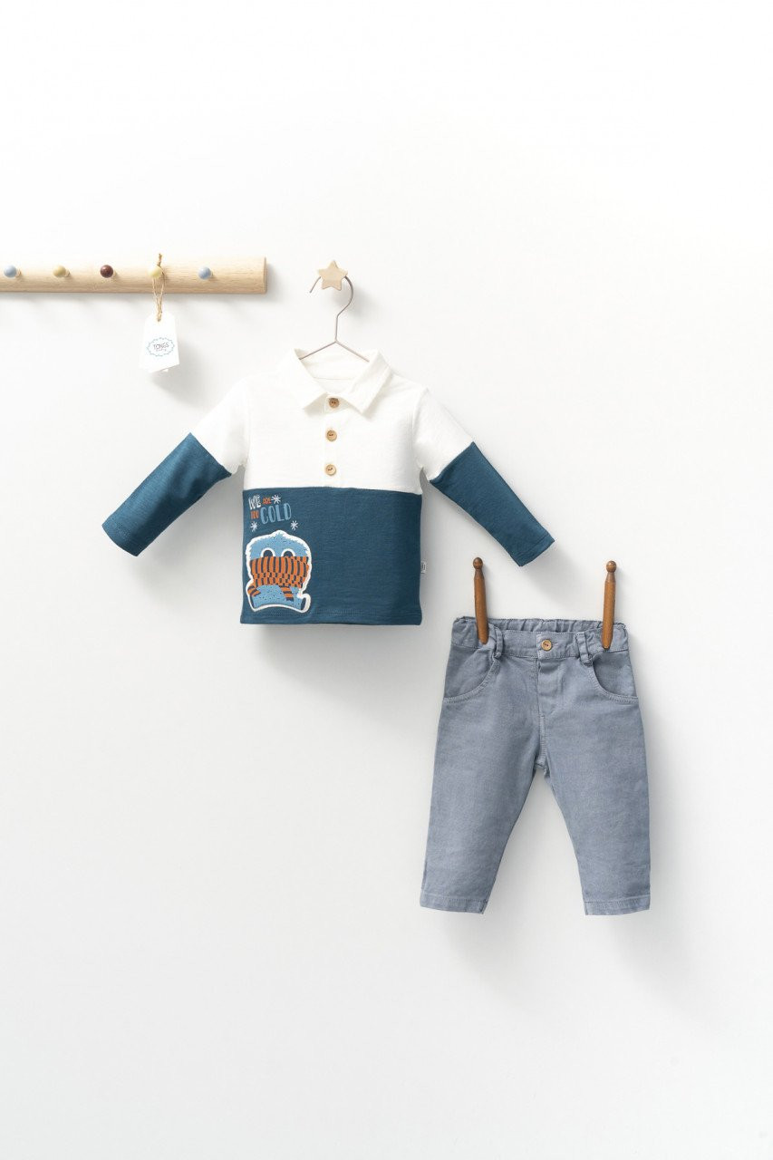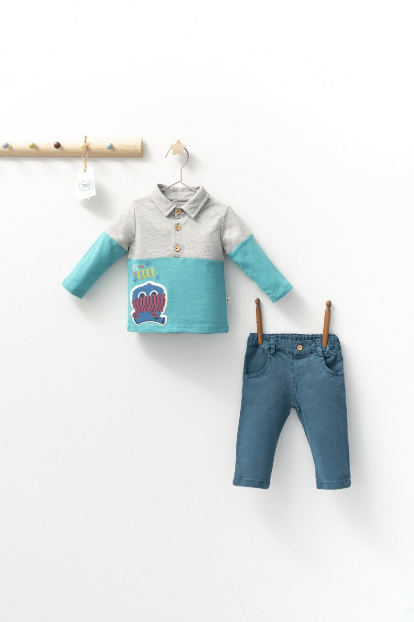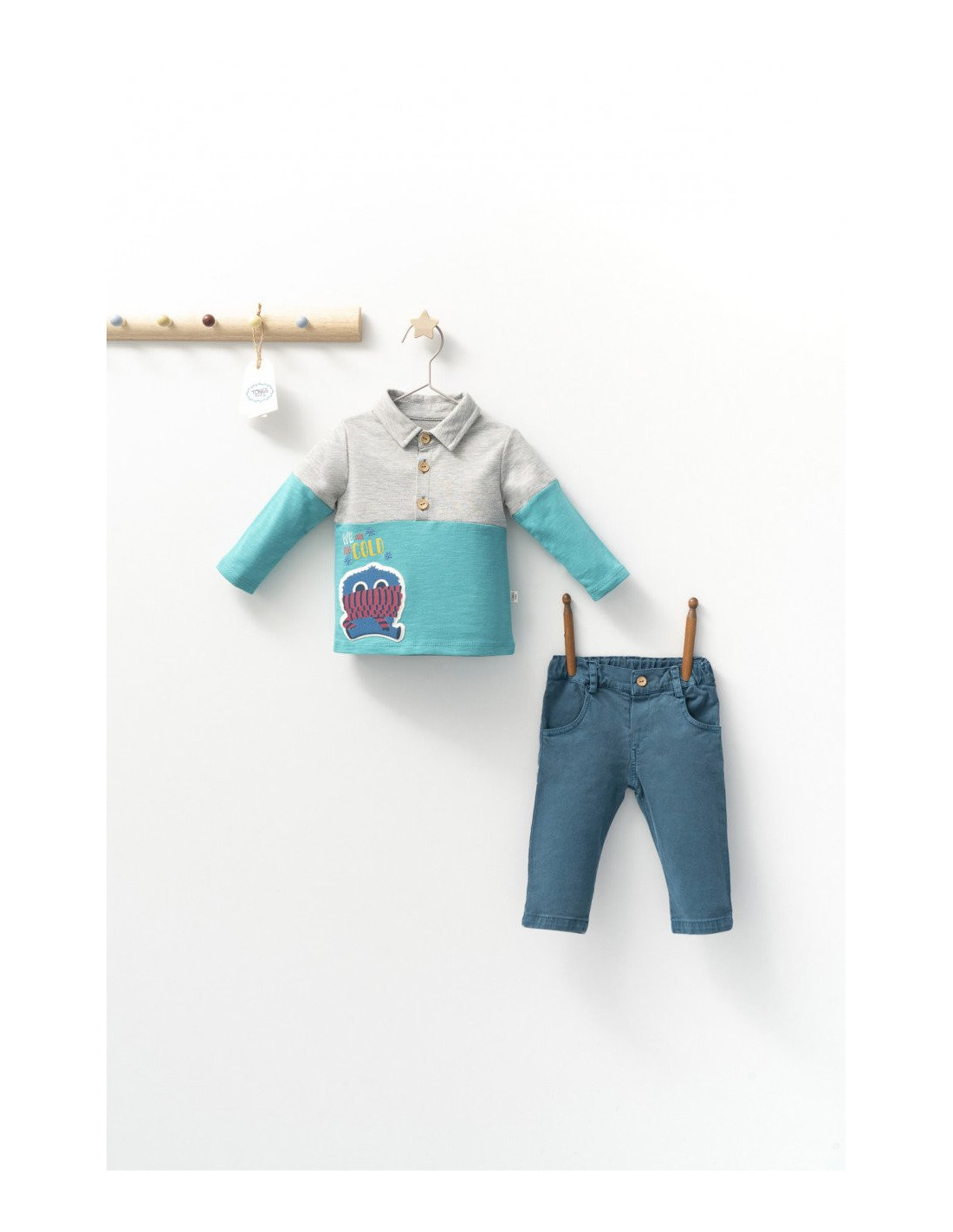 Setul compus din pantalonasi de blugi si bluzita cu guleras pentru bebelusi din colectia Monster reprezinta o combinație de design spectaculos și confort absolut.