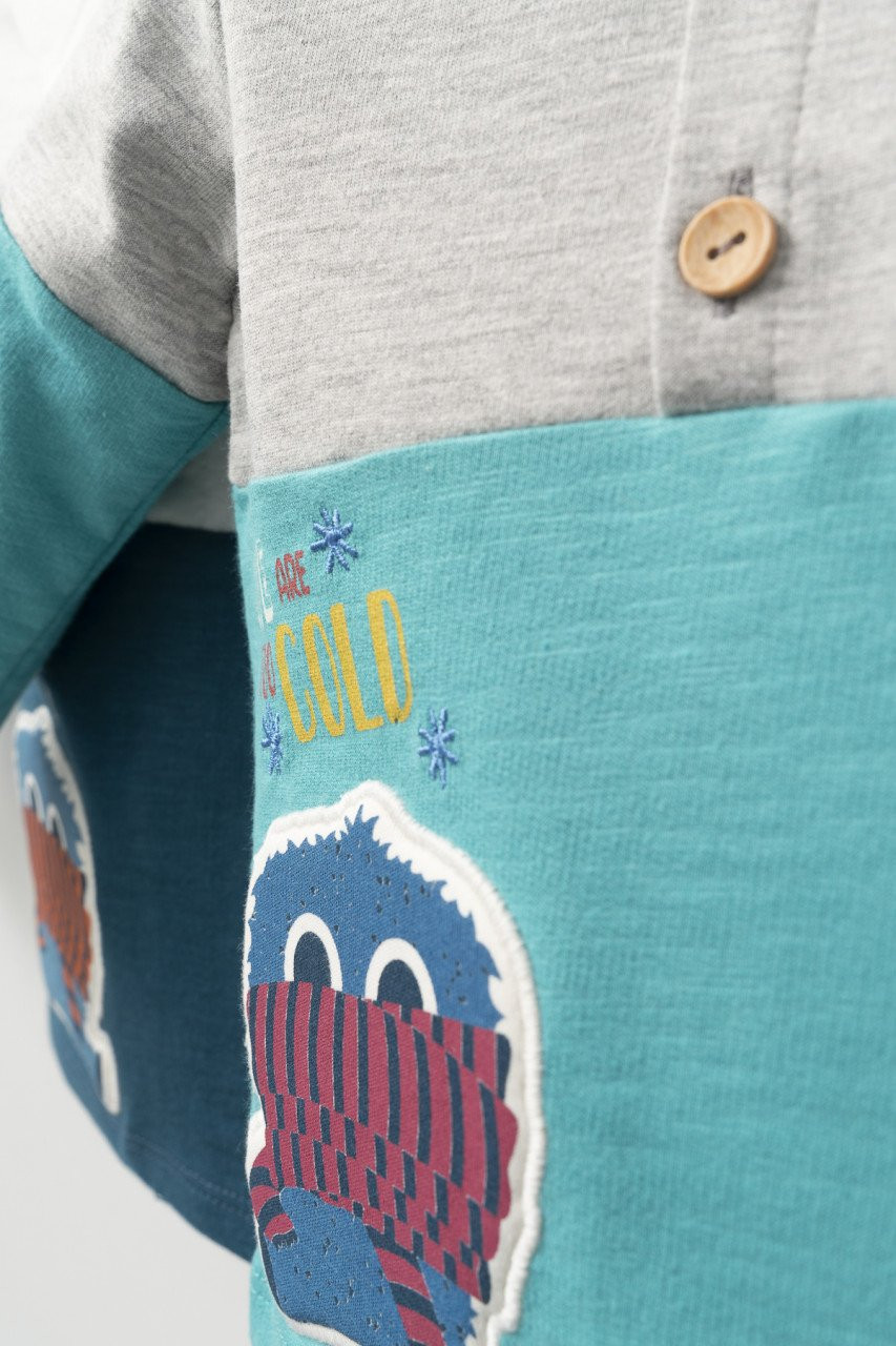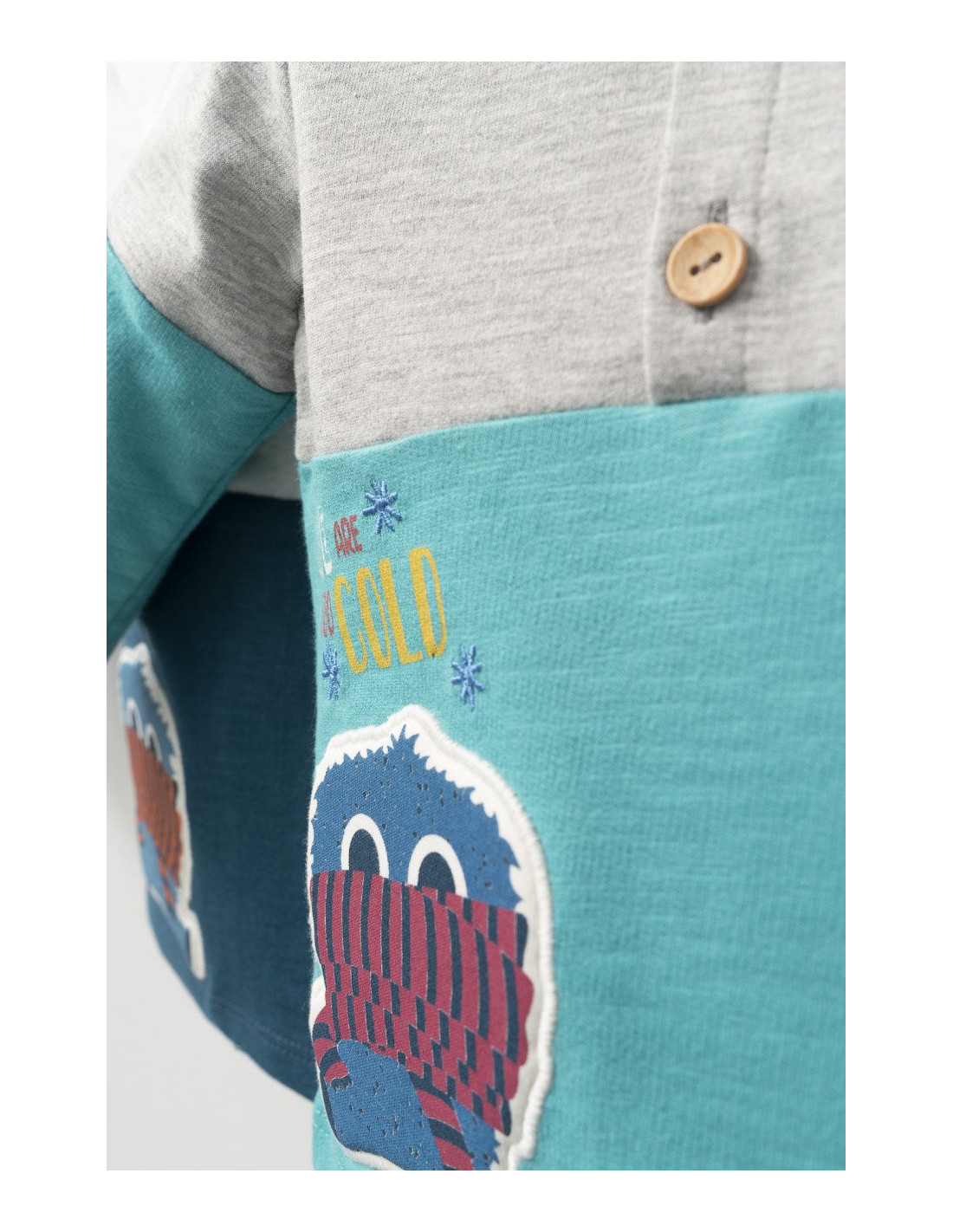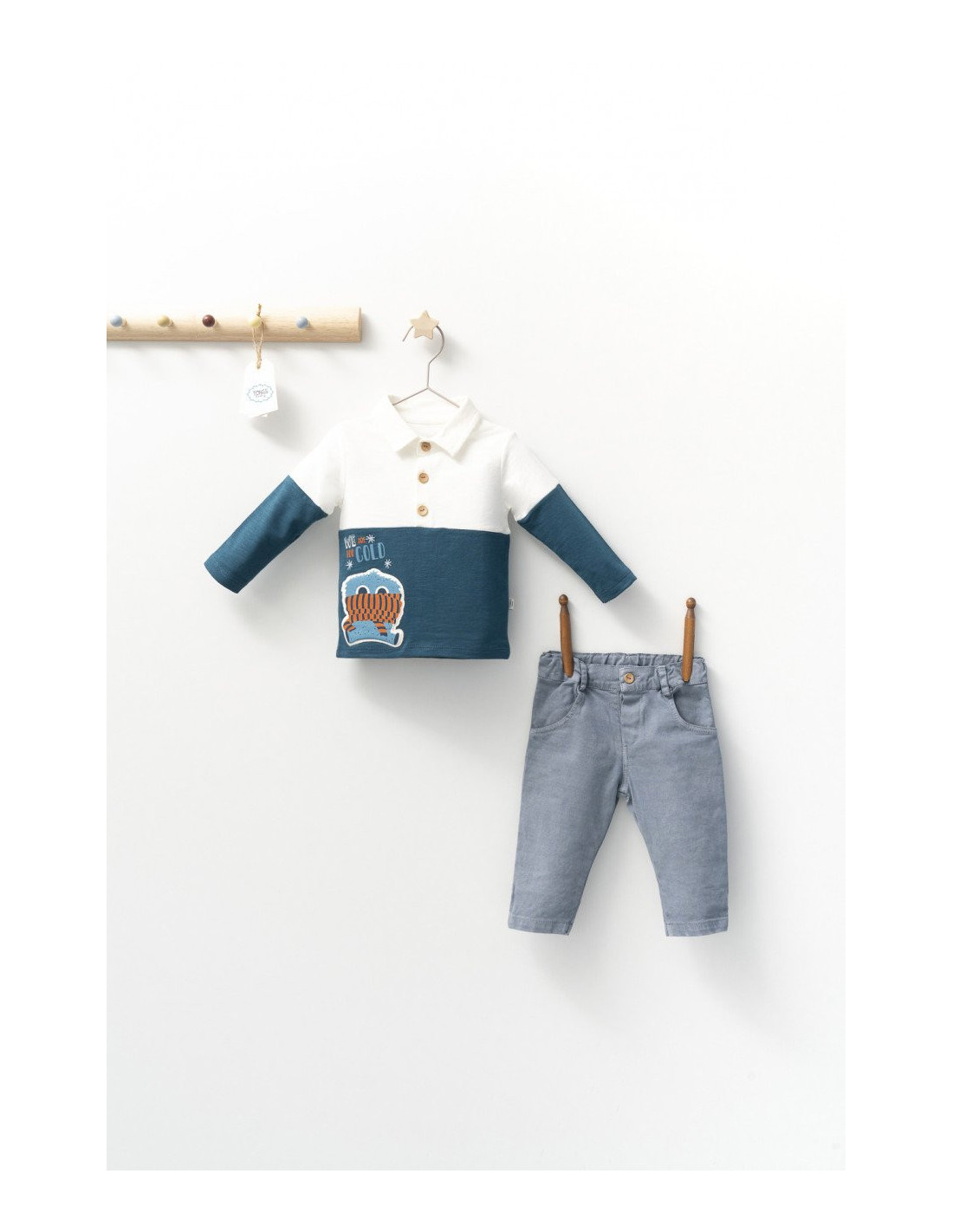 Setul compus din pantalonasi de blugi si bluzita cu guleras pentru bebelusi din colectia Monster reprezinta o combinație de design spectaculos și confort absolut.