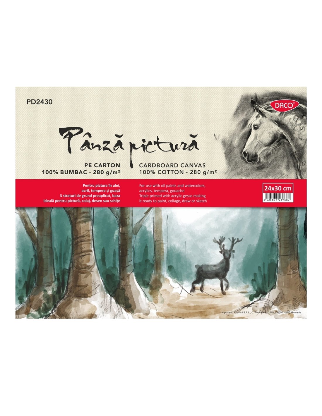 Pânza pentru pictură pe carton DACO, 18×24 cm, cu 3 straturi de grund preaplicat, este o alegere practică și versatilă pentru creații artistice de calitate, fiind gata să pună în valoare fiecare idee și fiecare tușă de culoare.