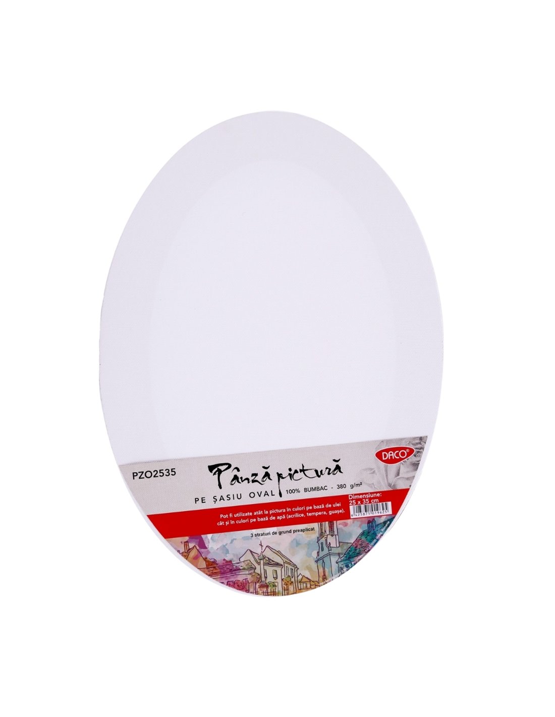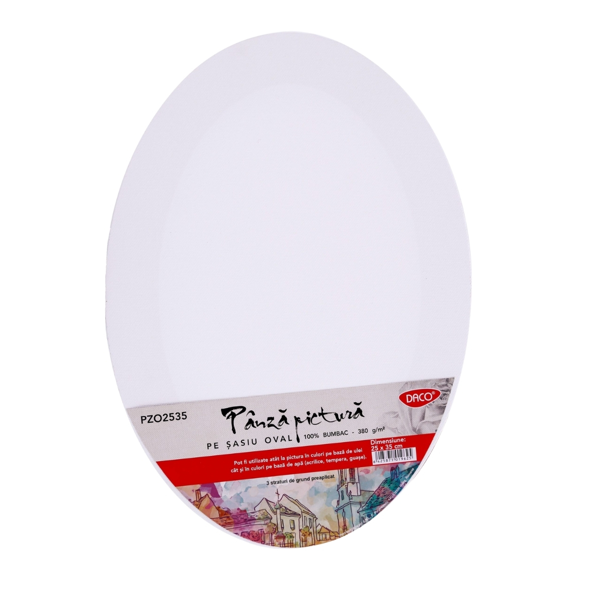 Pânza de pictură ovală DACO 25×35 cm, realizată din bumbac și pregătită cu 3 straturi de grund, este un suport creativ și versatil, ideal pentru a transforma orice idee într-o lucrare originală și expresivă.
