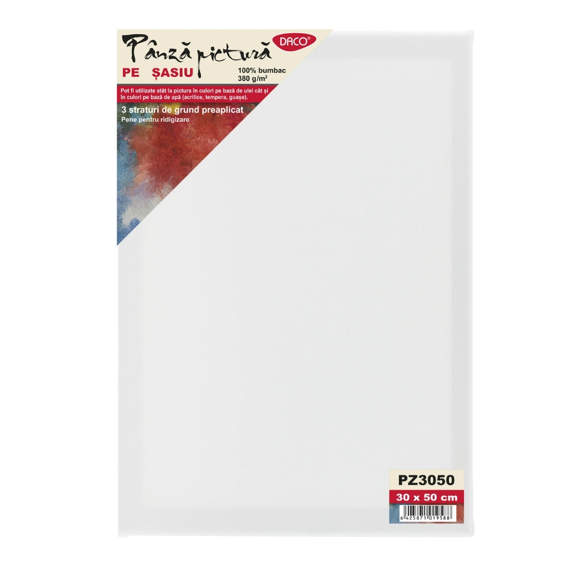 Pânza de pictură pe șasiu DACO 30×50 cm, din bumbac 100% și cu 3 straturi de grund preaplicat, oferă o suprafață stabilă și de încredere, ideală pentru creații artistice de impact.