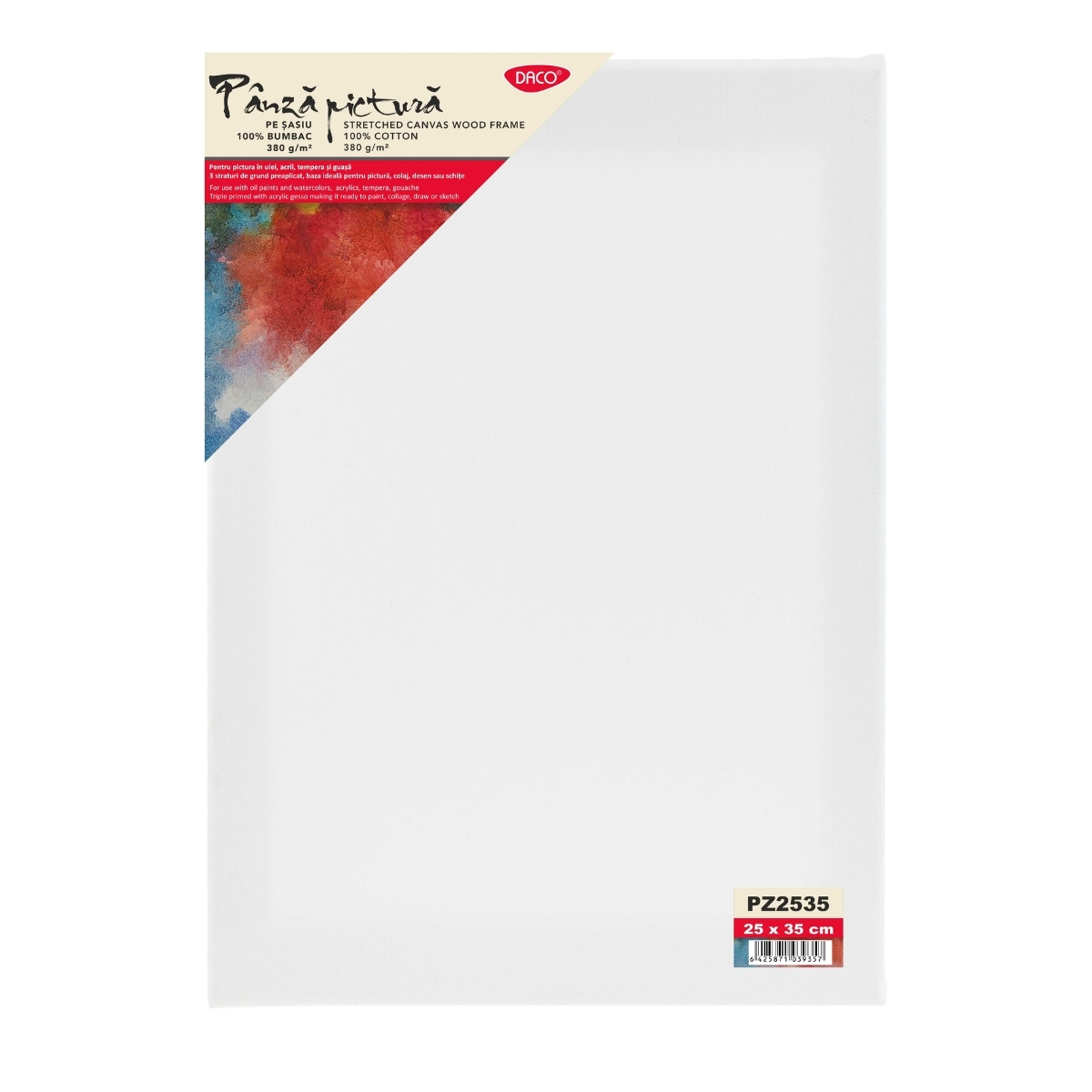 Pânza de pictură pe șasiu DACO 25×35 cm, din bumbac 100%, cu 3 straturi de grund și șasiu rezistent din lemn, este un suport profesional și practic, gata să susțină creațiile tale artistice.