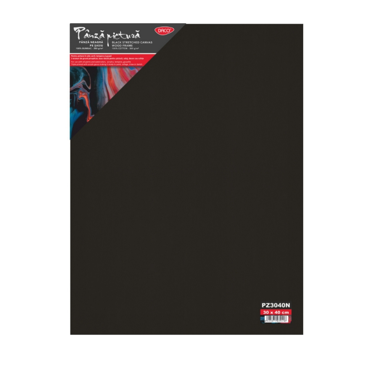 Pânza de pictură neagră 30×40 cm, realizată din bumbac de calitate, cu 3 straturi de grund și cadru rigidizat, este suportul ideal pentru lucrări artistice cu efecte spectaculoase și culori deosebit de expresive.