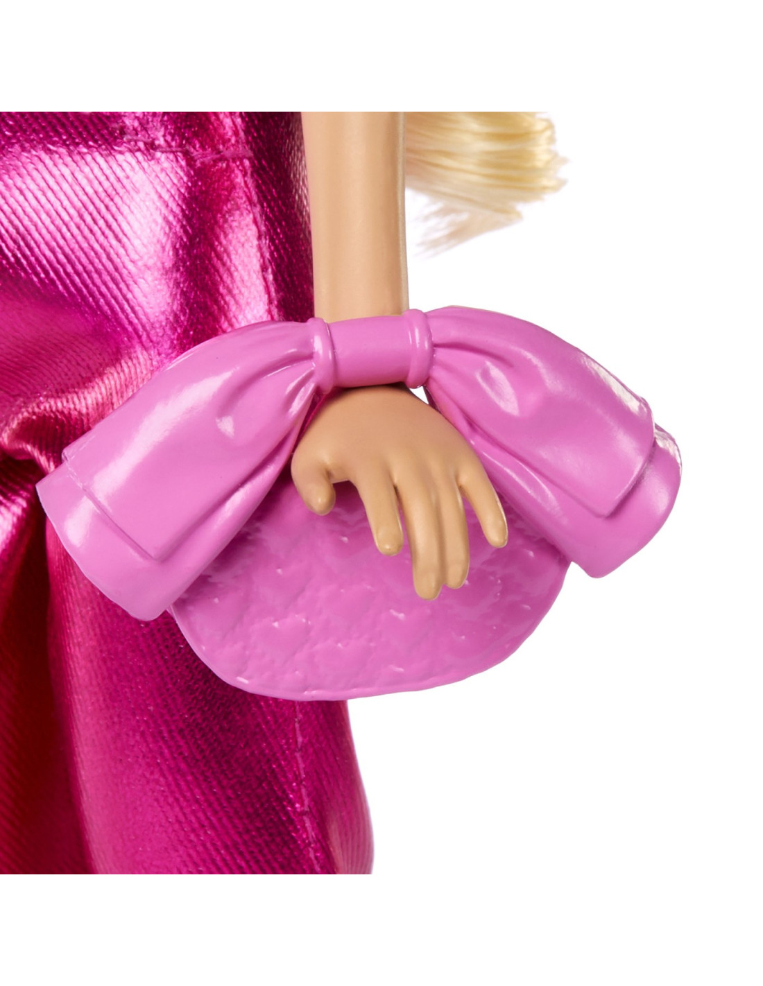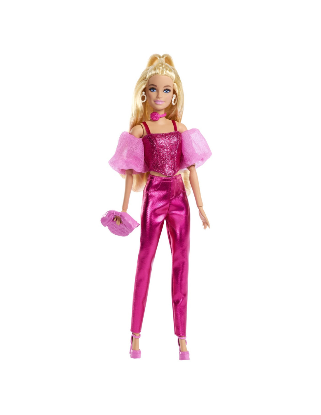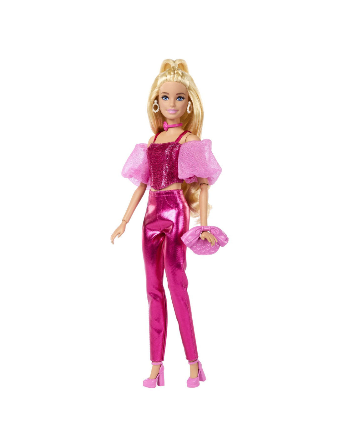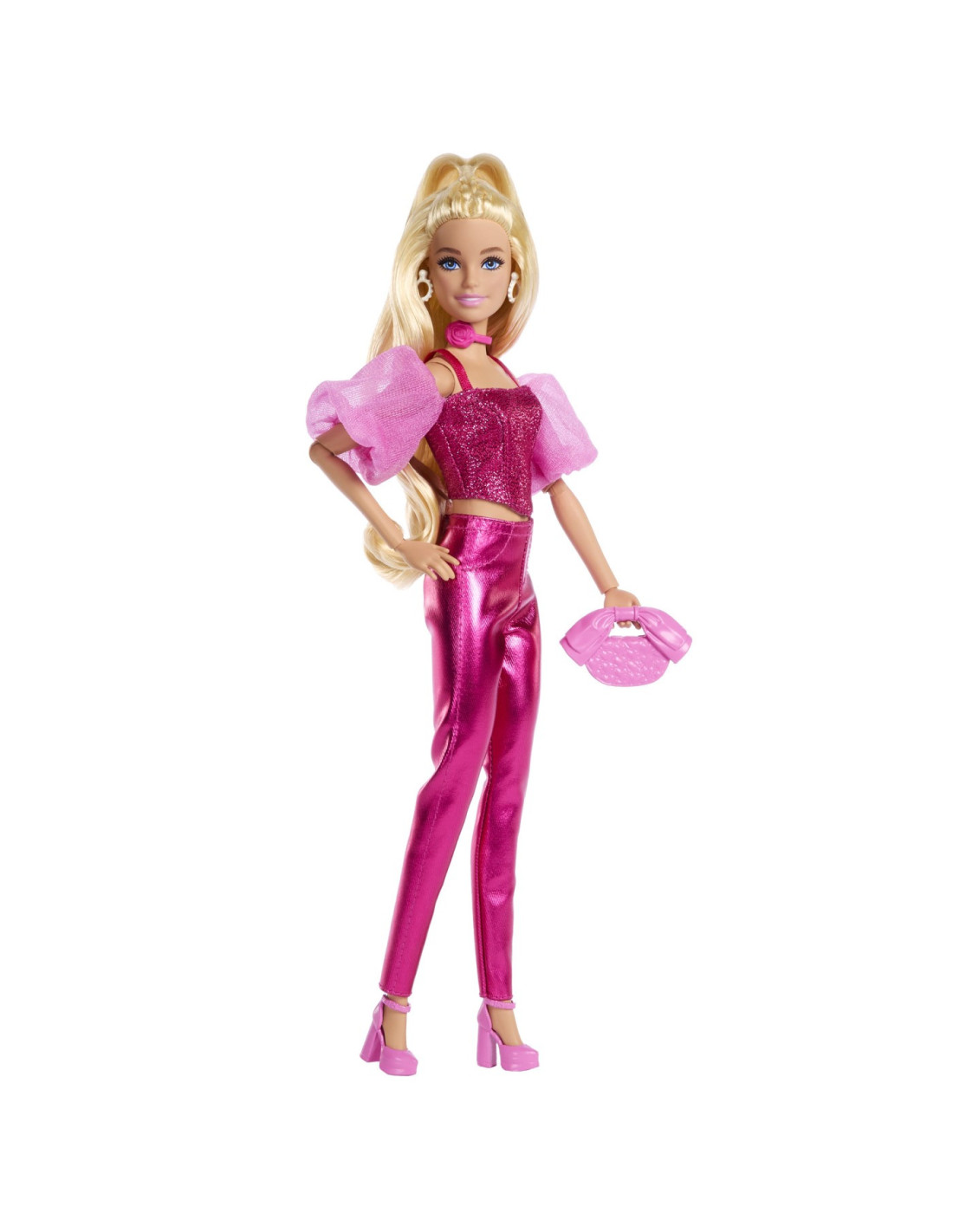 Papusa Barbie se accesorizeaza cu bratari suprapuse, o geanta cu funda si tocuri roz.
