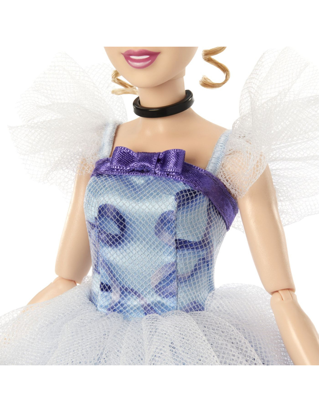 Papusa Cenusareasa (30 cm) este imbracata in stil festiv, purtand o rochie eleganta cu corsaj cu panglici si maneci din tul cu volane.