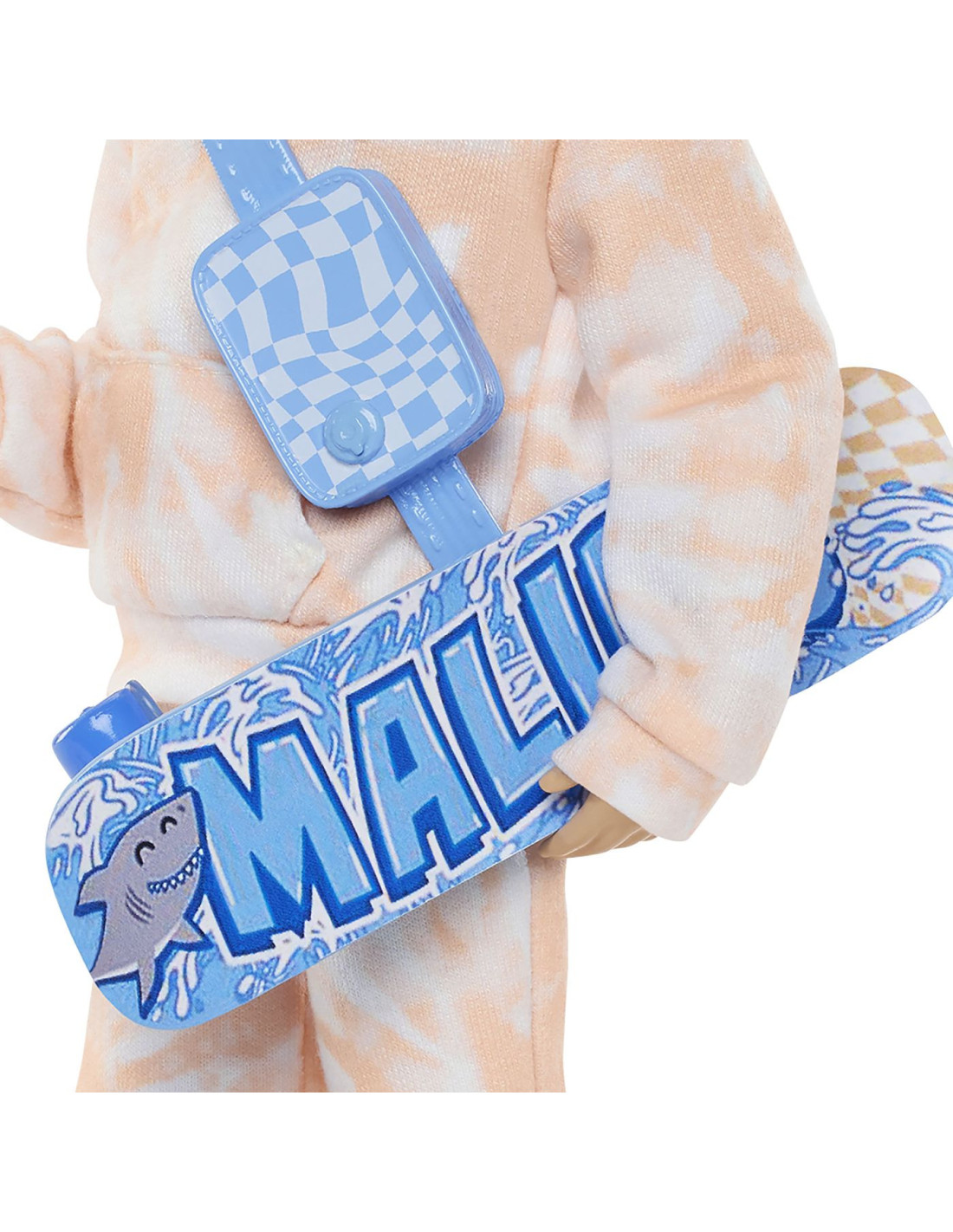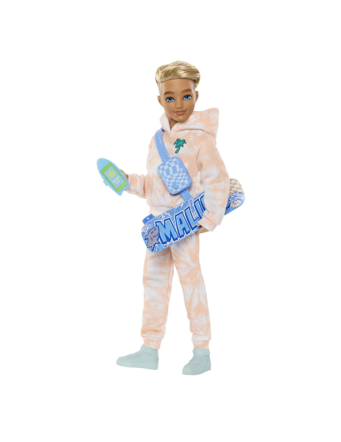 Vine cu accesorii tematice speciale, cum ar fi un skateboard, o borseta, o crema de protectie solara, o sticla de apa, un cornet de inghetata, ochelari de soare si un telefon intr-o husa in forma de placa de surf.