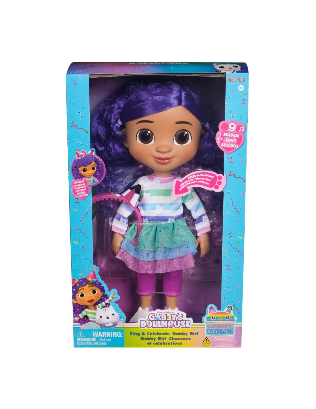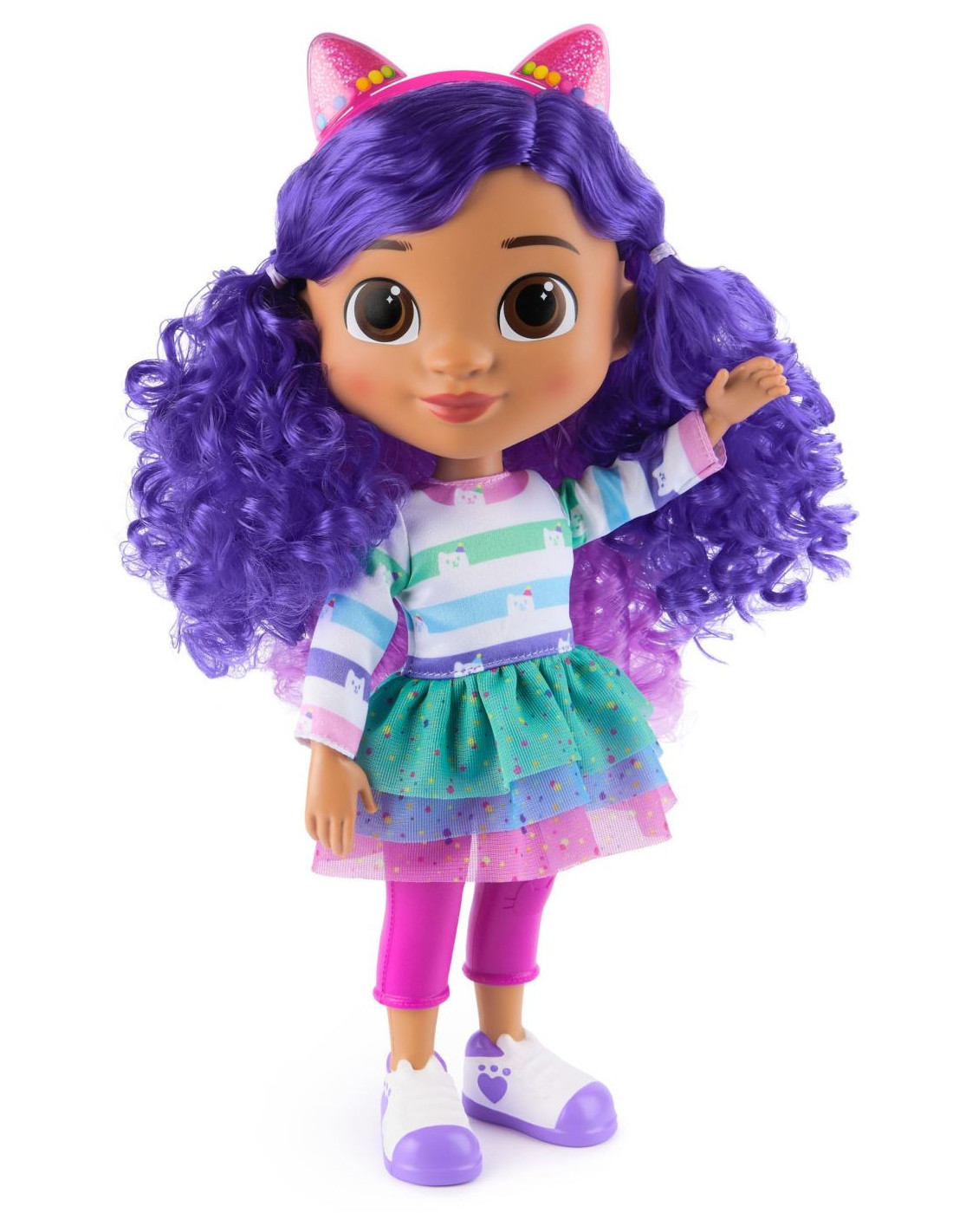Aceasta papusa deosebita, Gabby este imbracata in tinuta ei exclusiva cu tematica sarbatorilor, cu o bentita draguta cu pisicuta, care are urechi reversibile pe care le poti transforma, rasucindu-le din modul palarie de petrecere in urechi de pisica.