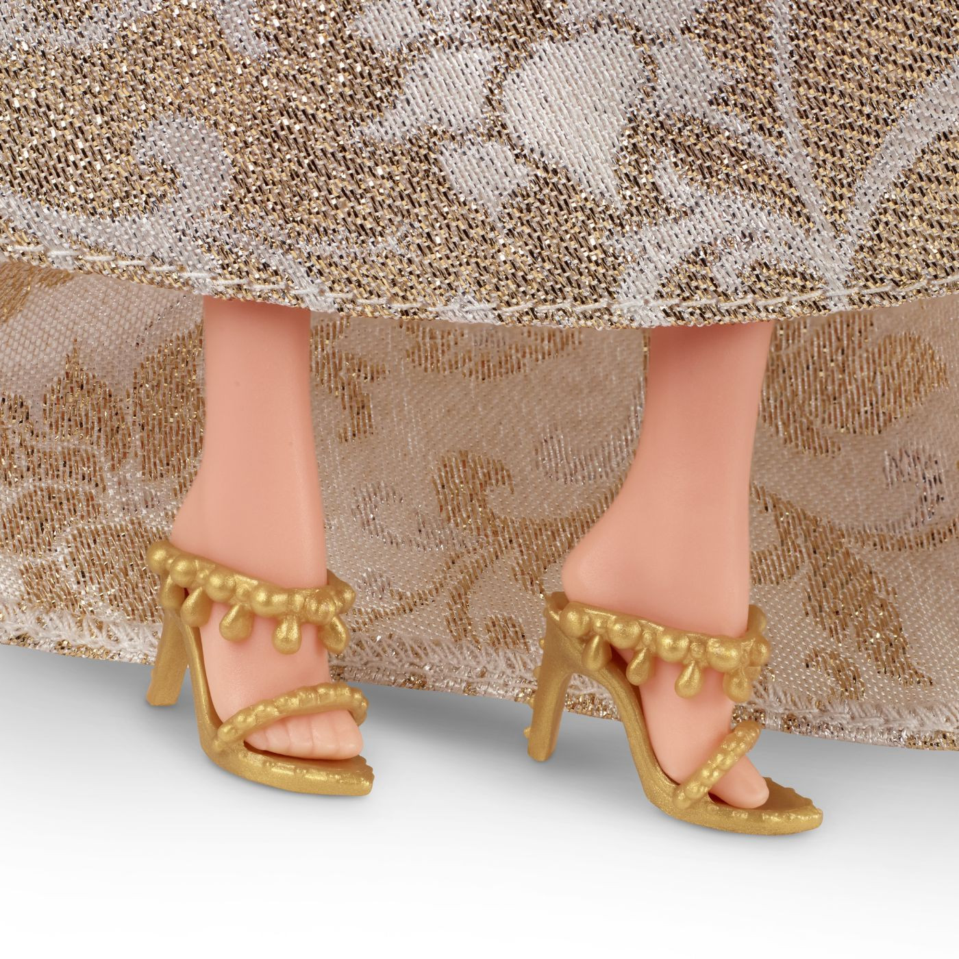 Papusa este imbracata intr-o rochie lunga, aurie, cu motive decorative fine si textura stralucitoare, creand un efect luxos si festiv.