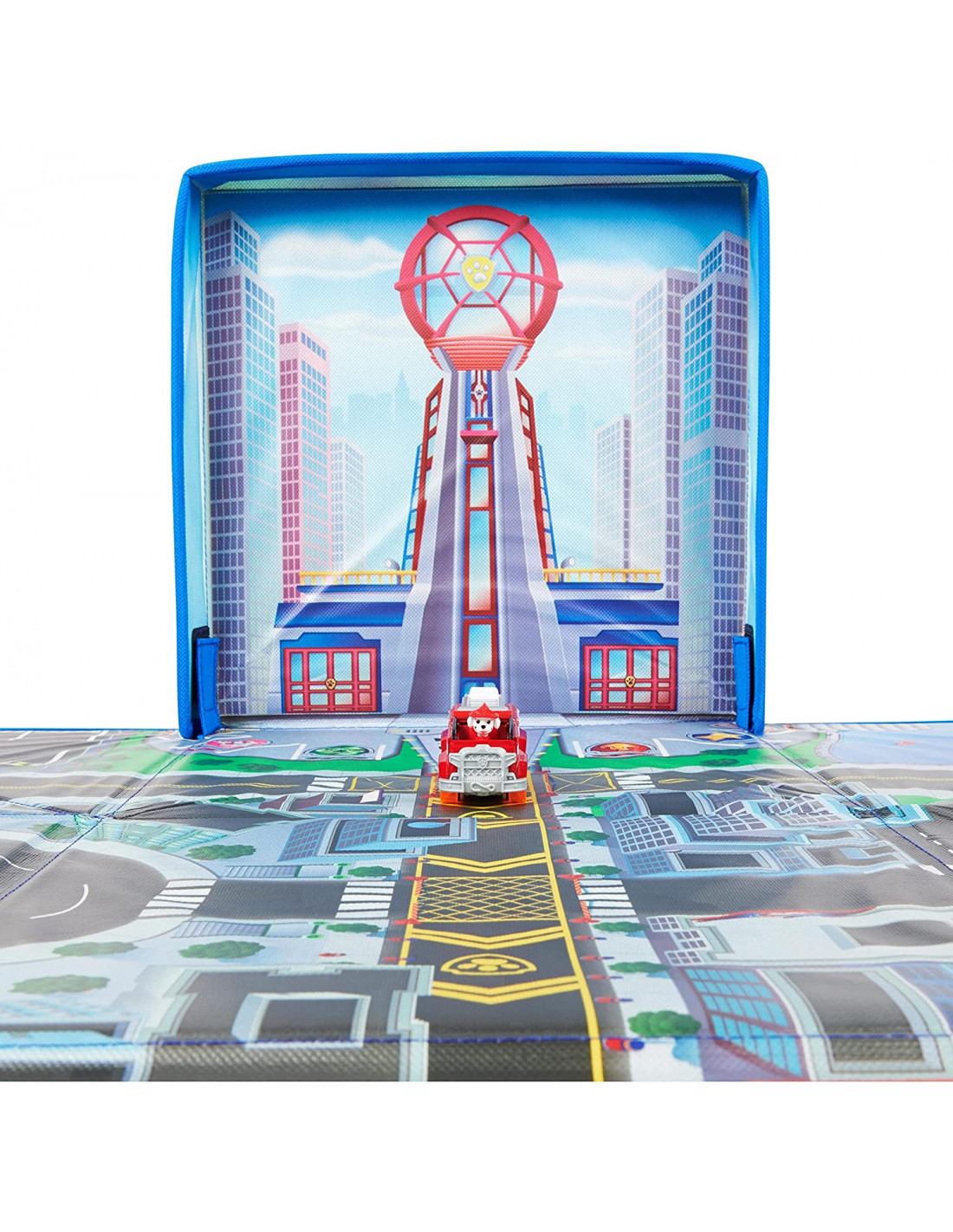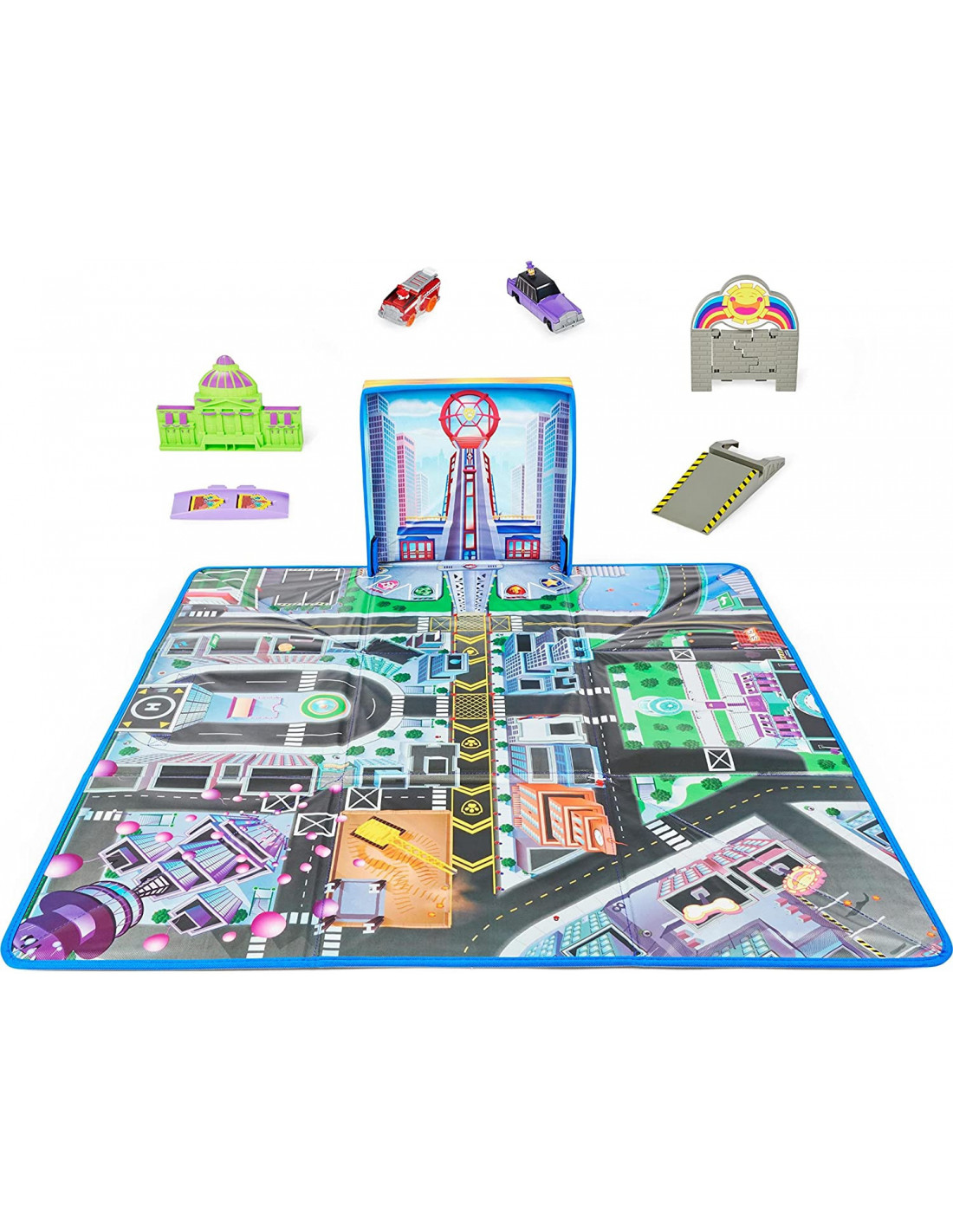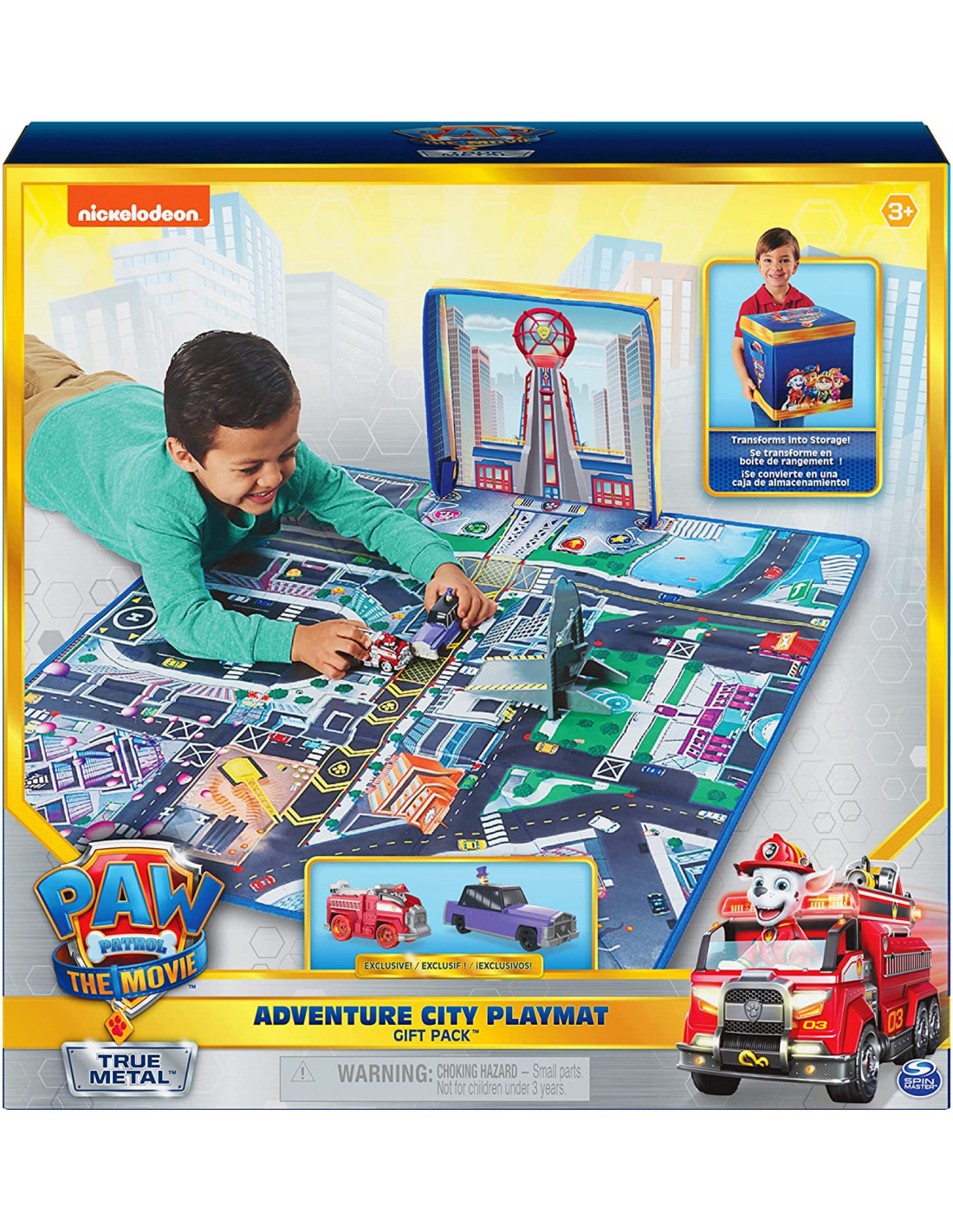 Acest set exclusiv de joaca include vehiculele True Metal la scala 155 a lui Marshall si a Primarului Humdinger pe care nu le vei gasi altundeva, doua accesorii pentru joc si un covor de joaca tematic Patrula Catelusilor care atunci cand se ruleaza devine o cutie de depozitare pentru jucarii.