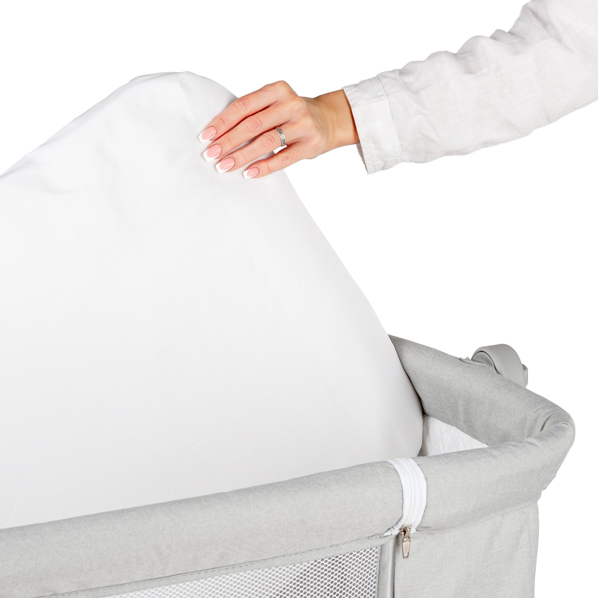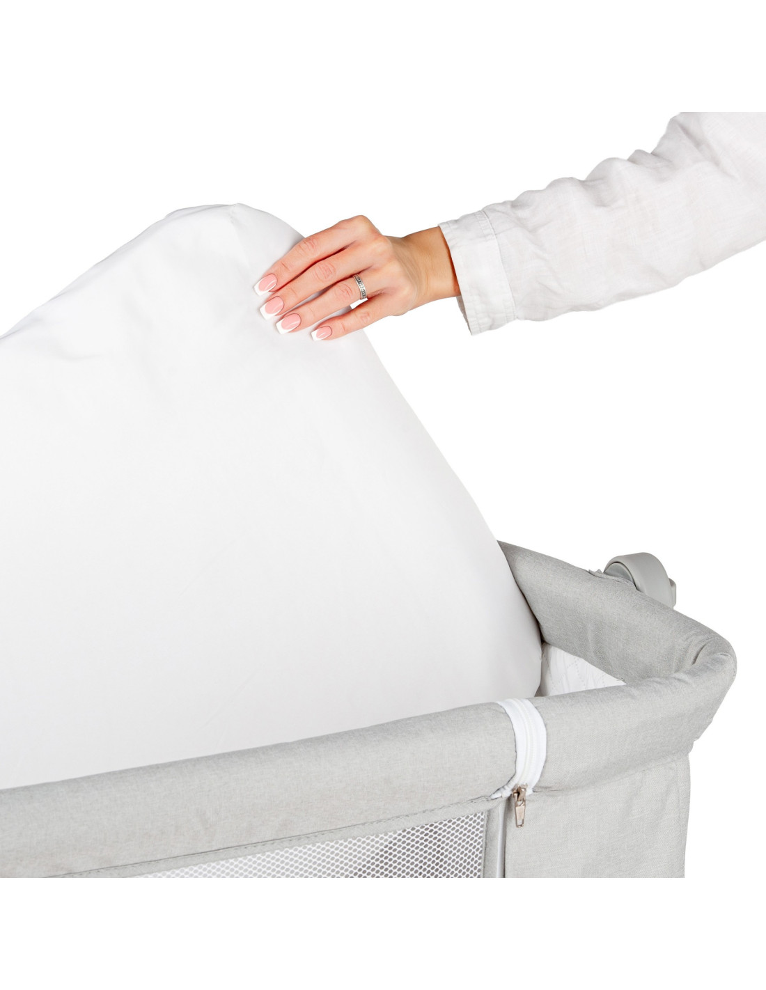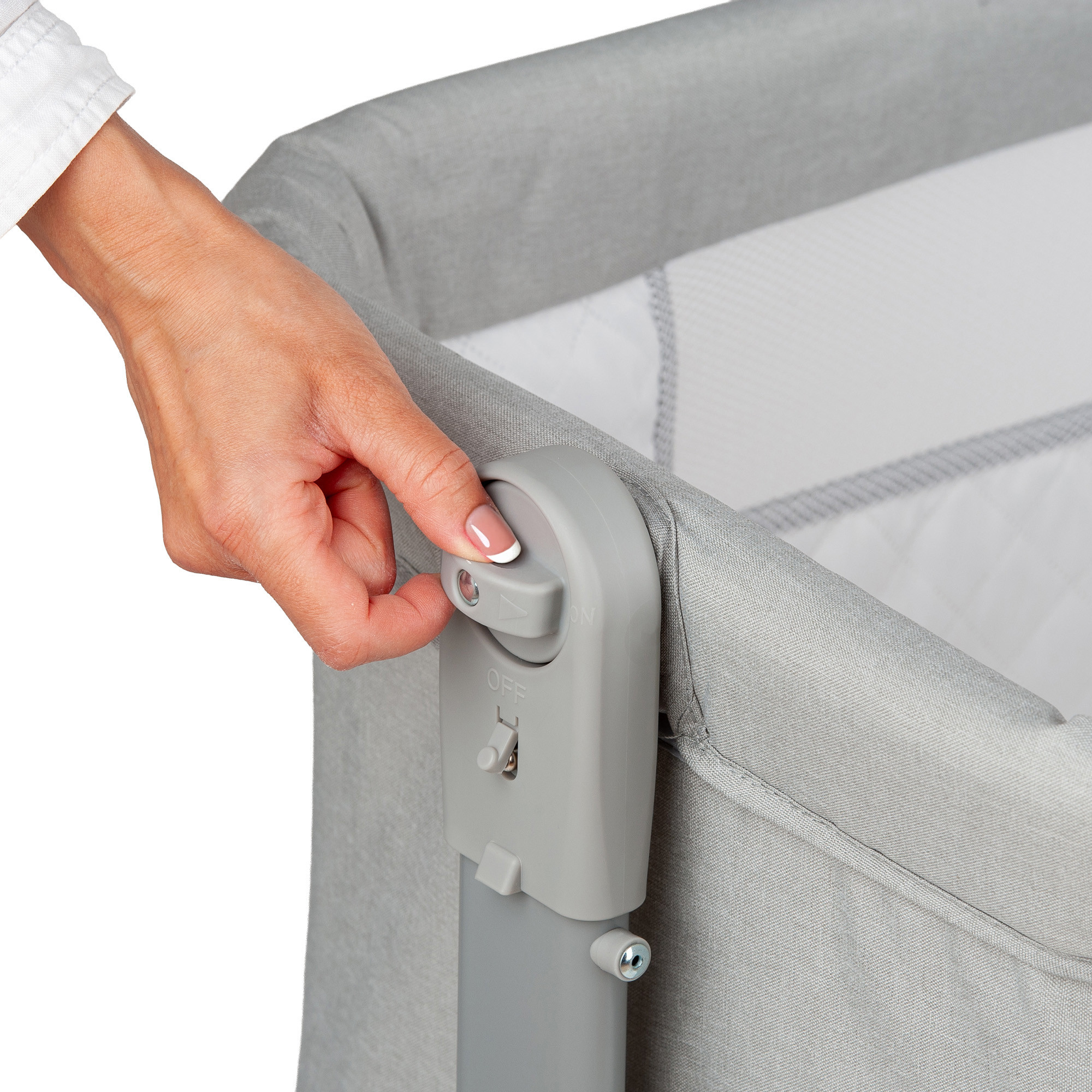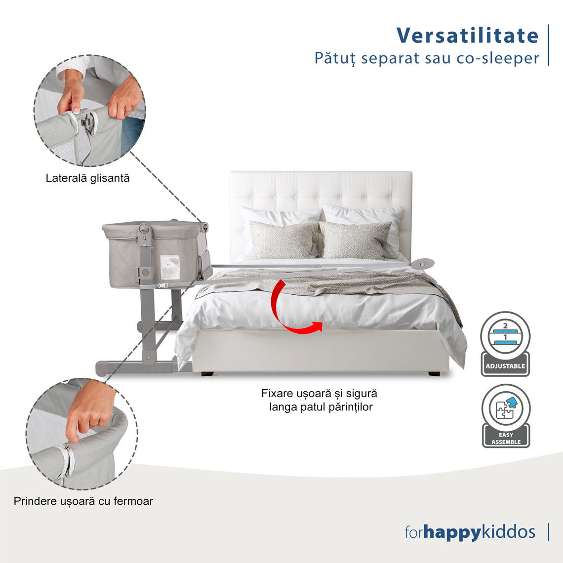 Atașare simplă și sigură: Sistemul de atașare este intuitiv și rapid, pentru ca pătuțul să stea fix lângă patul tău, fără bătăi de cap.