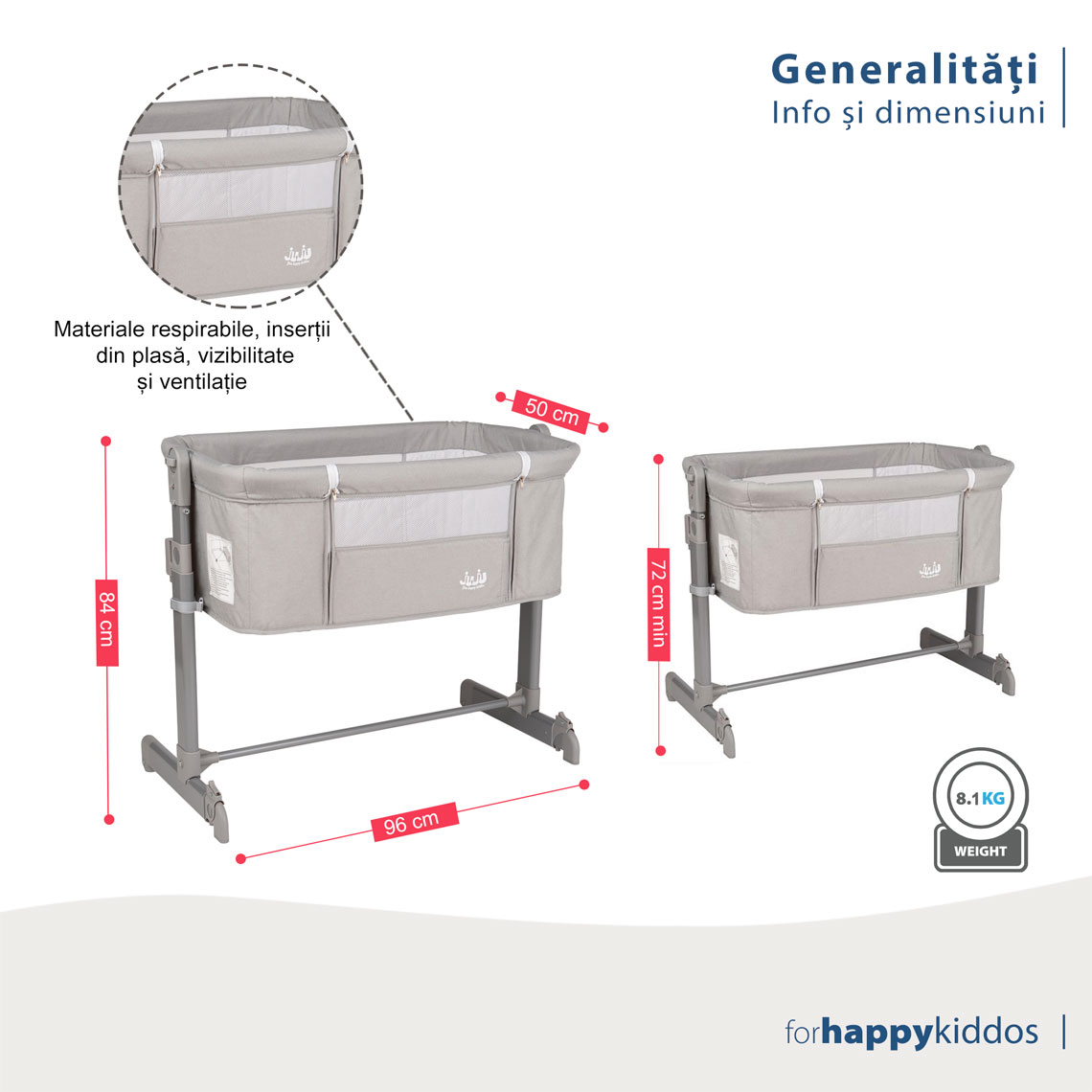 Materiale respirabile: Pereții laterali sunt prevăzuți cu inserții din material tip plasă, care asigură o ventilație optimă și îți permite să vezi bebelușul în permanență, fără să te ridici din pat