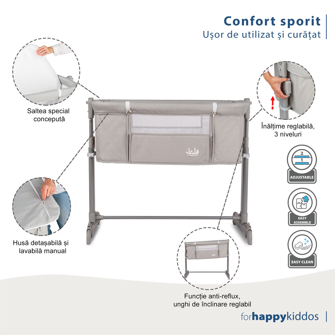 Funcție anti-reflux: Unghiul de înclinare poate fi ajustat (diferență maximă de 2 poziții de înălțime între cele două picioare). Această funcție este deosebit de utilă atunci când bebelușul suferă de reflux sau are nasul înfundat, ajutându-l să respire și să doarmă mai bine.